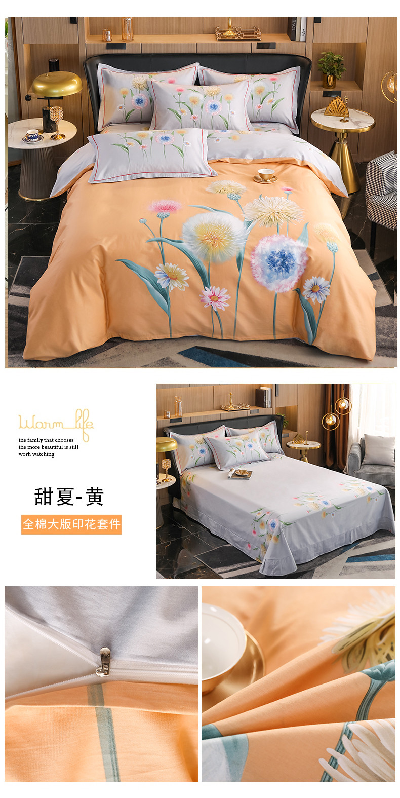商品名称:雲归梦 2022新款全棉大版四件套 花卉花型 甜夏-黄