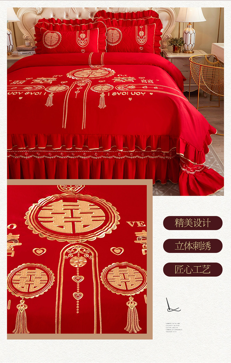 (总)宜凡家纺 2025新款婴儿绒压花全夹棉床裙四件套,韵雅-中国红,韵雅-黑天鹅