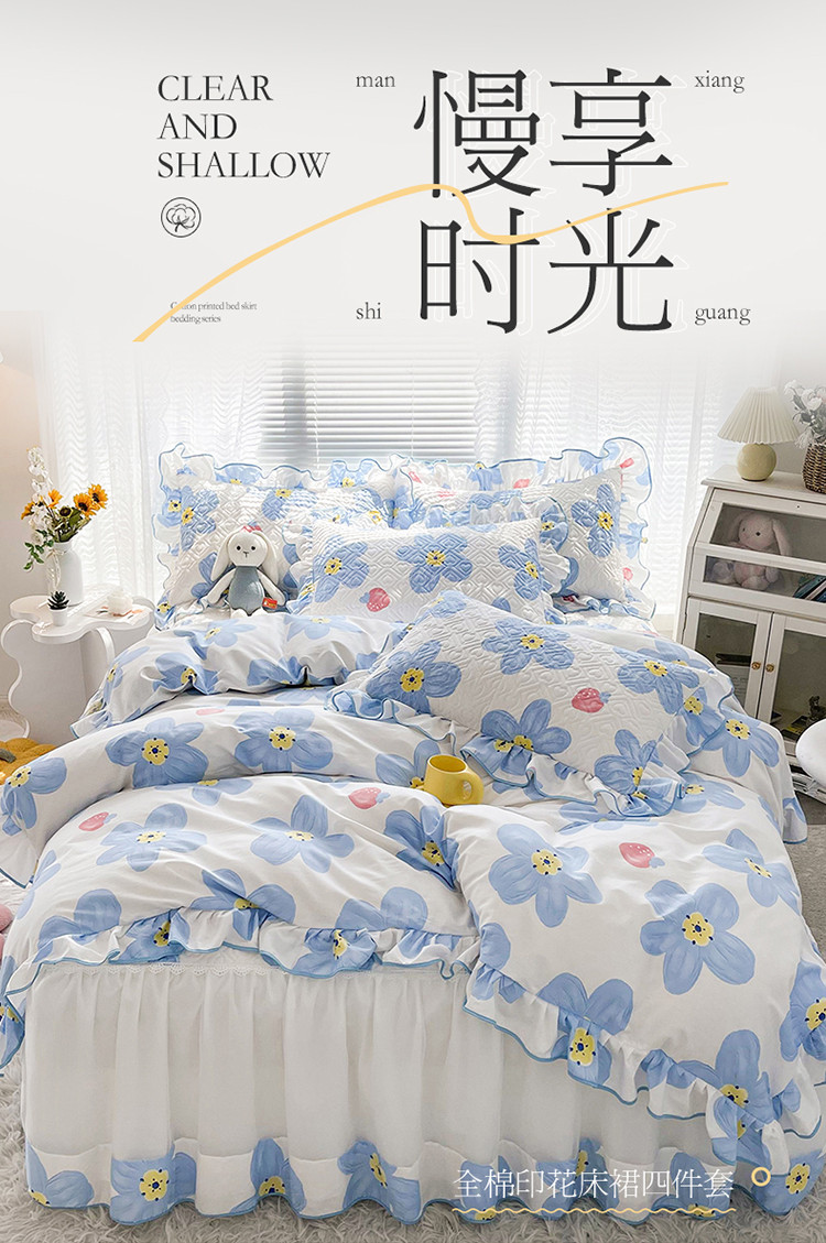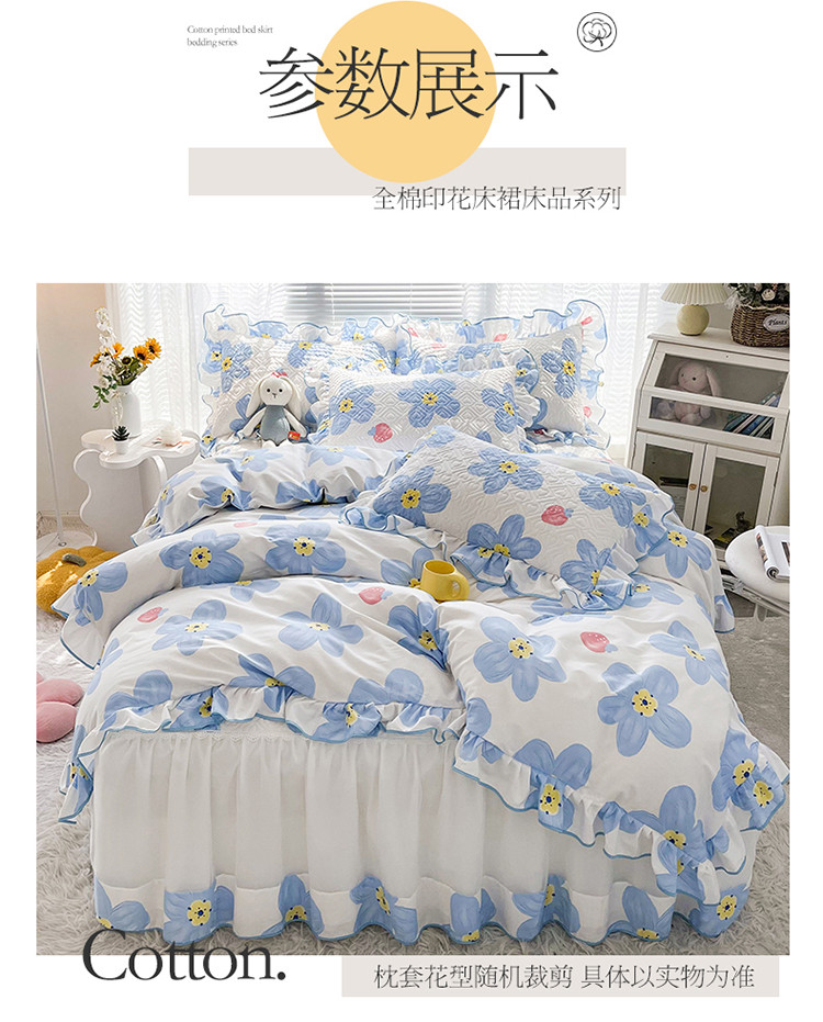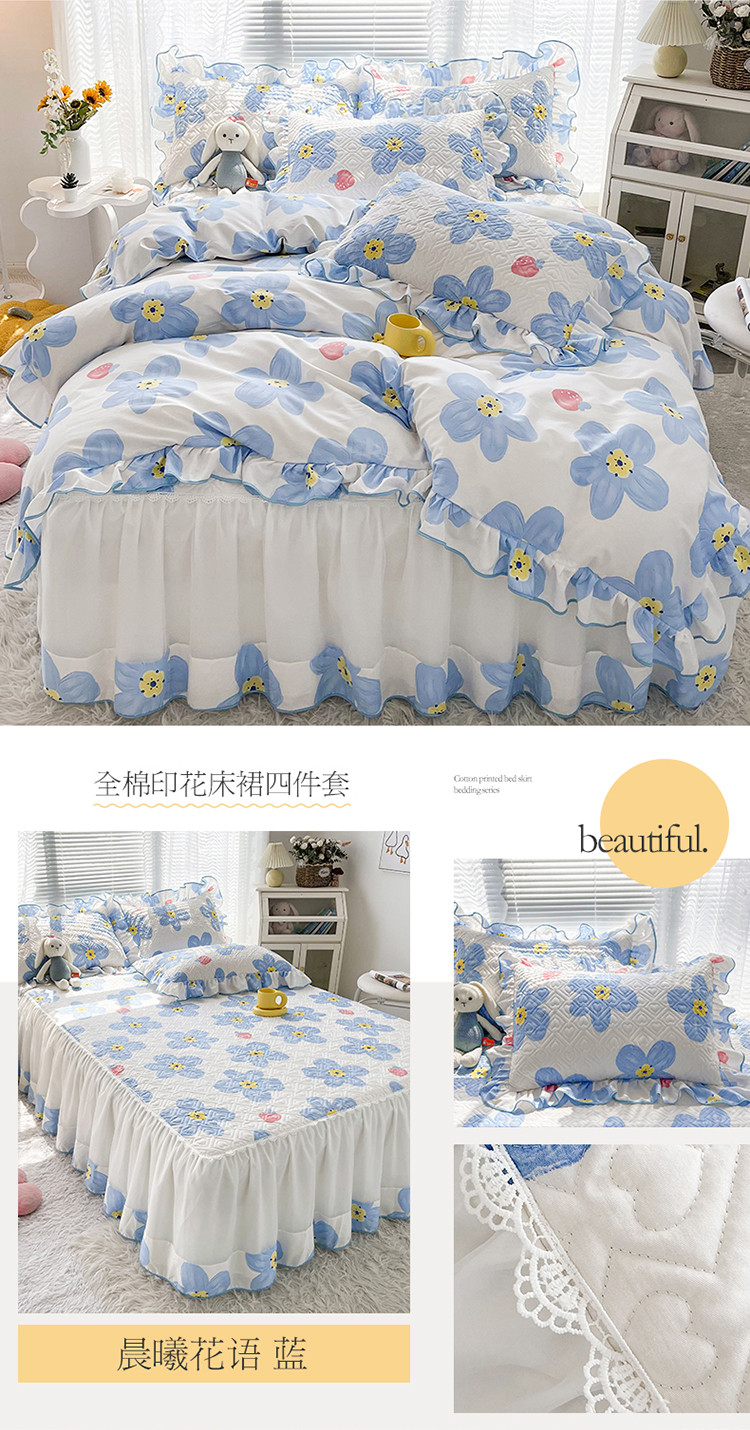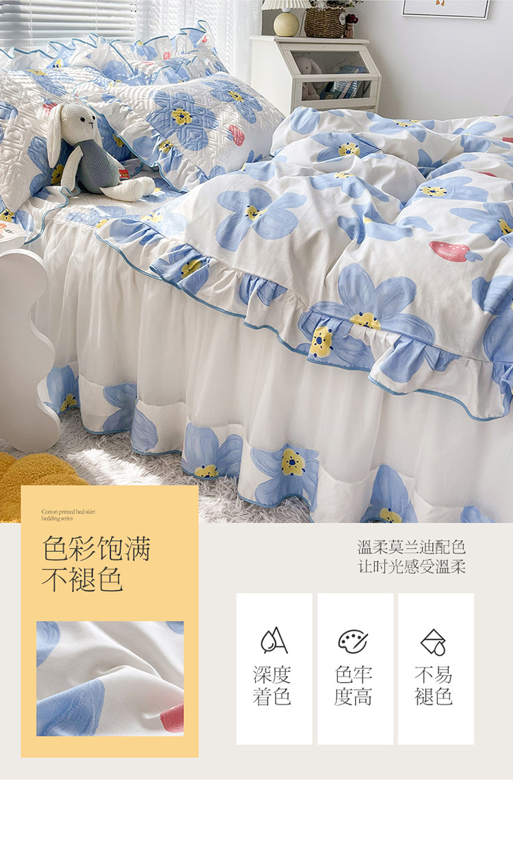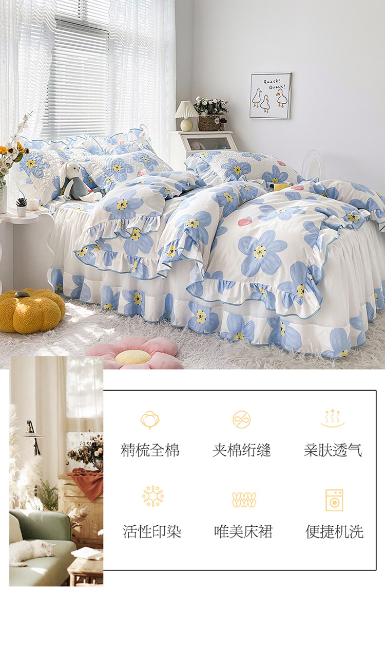 当前位置: 91家纺网 > 商品网购 > 床品套件 > 四件套 > 全棉普通四件套 > 宜凡 2022新款全棉印花夹棉双层裙边床裙款四件套 晨曦花语蓝
