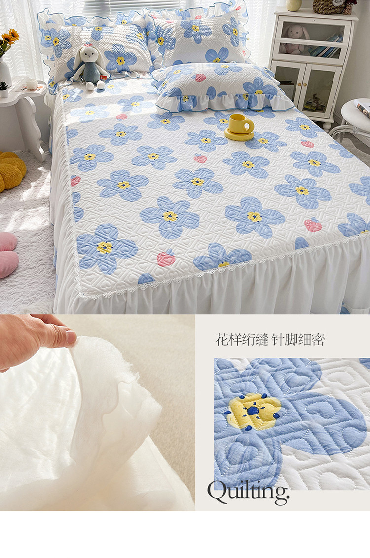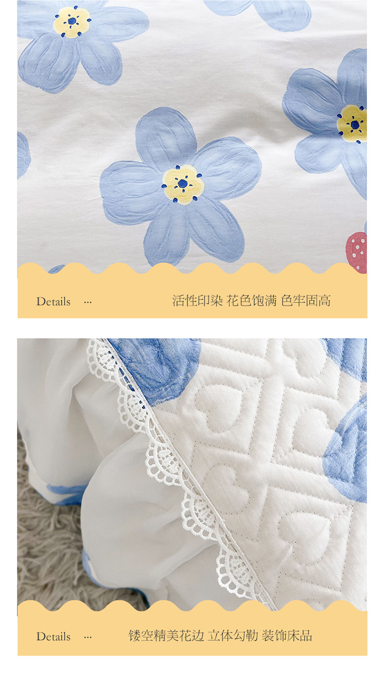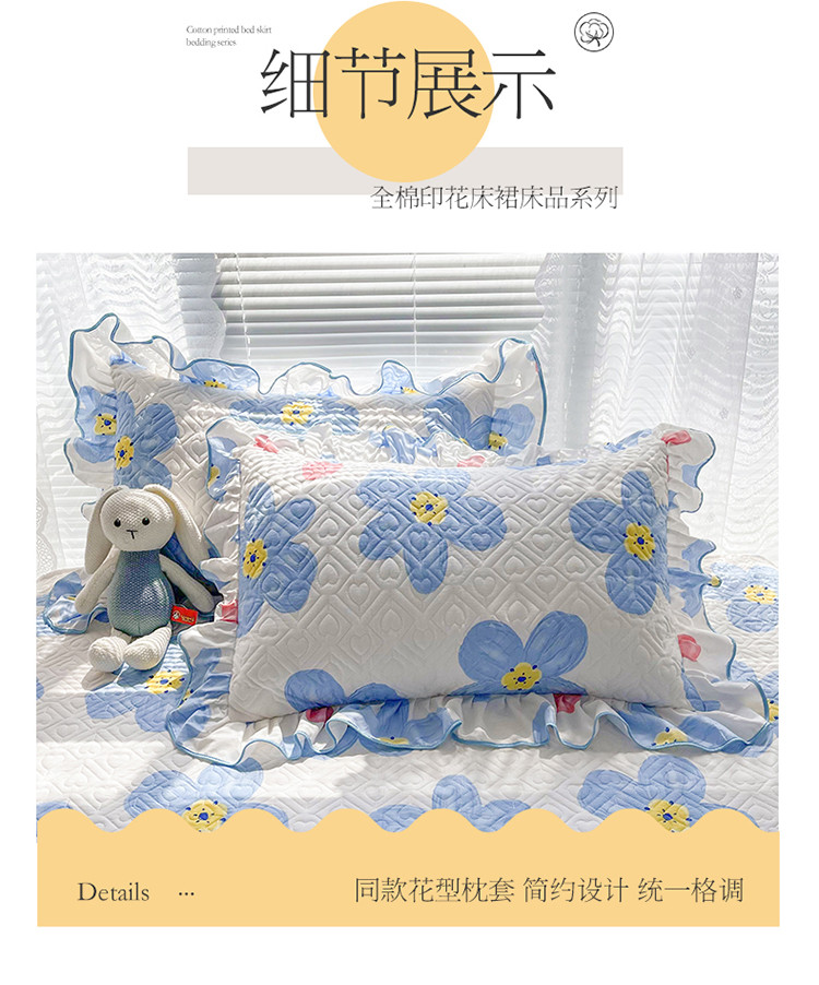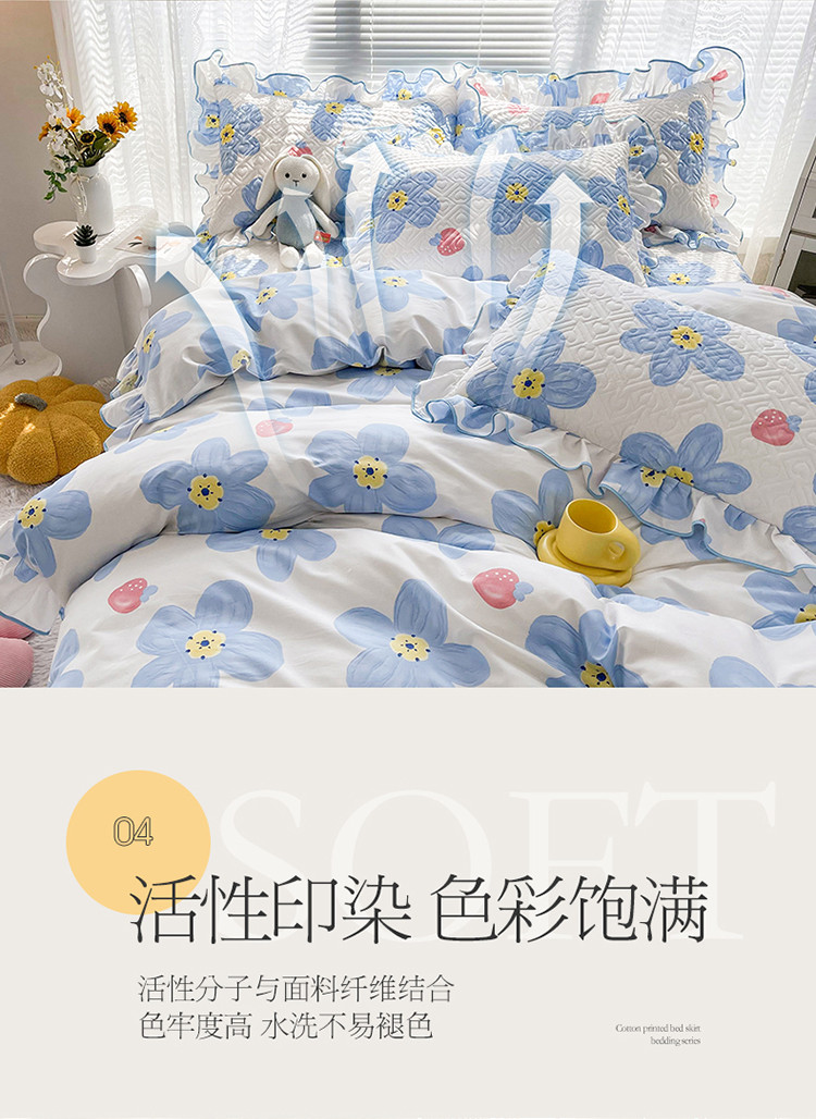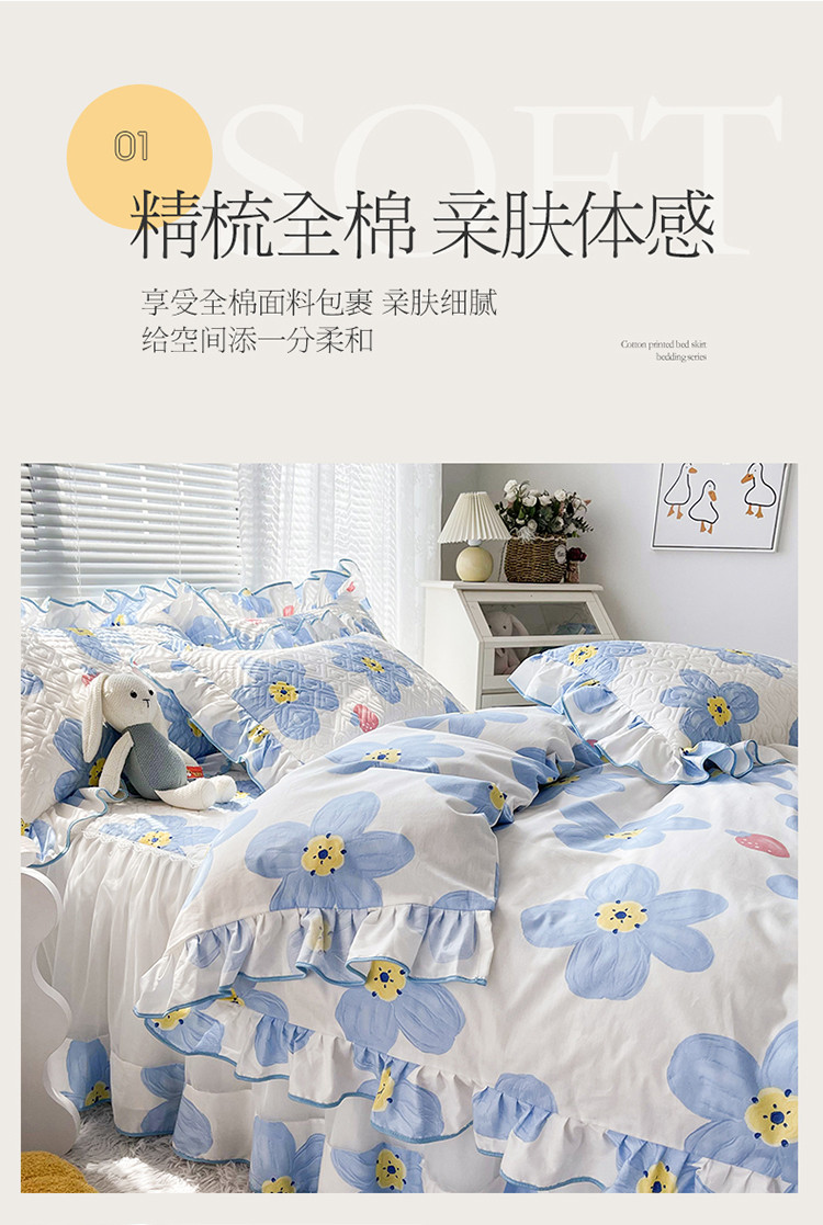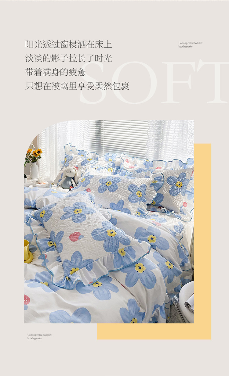 当前位置: 91家纺网 > 商品网购 > 床品套件 > 四件套 > 全棉普通四件套 > 宜凡 2022新款全棉印花夹棉双层裙边床裙款四件套 晨曦花语蓝