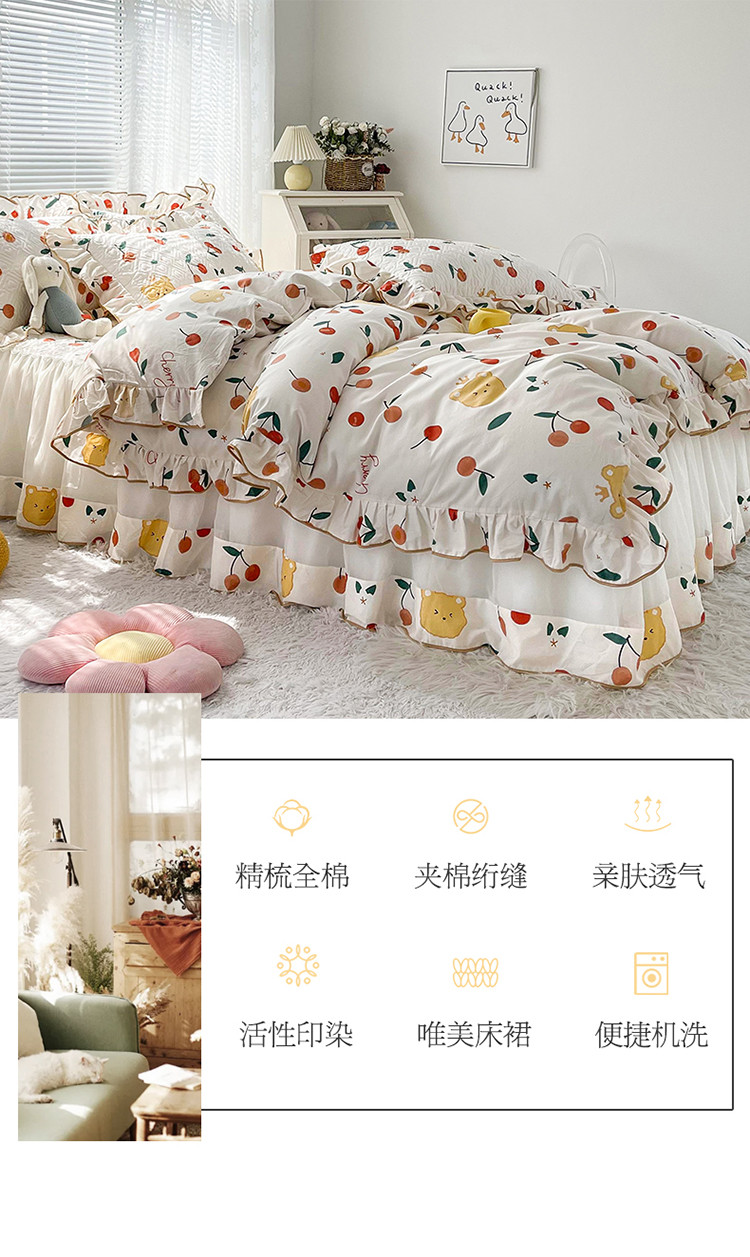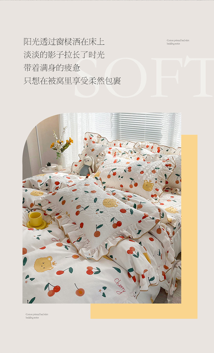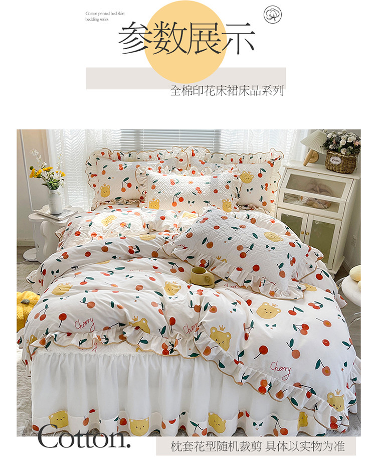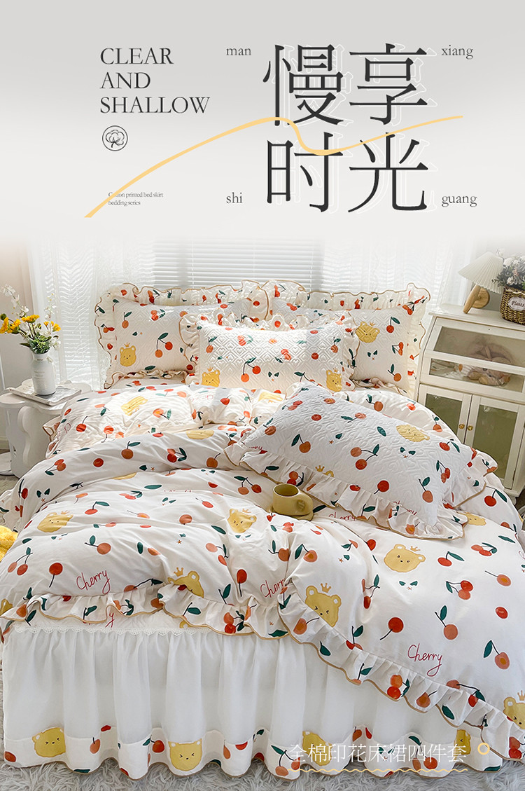 当前位置: 91家纺网 > 商品网购 > 床品套件 > 四件套 > 全棉普通四件套 > 宜凡 2022新款全棉印花夹棉双层裙边床裙款四件套 元气樱桃