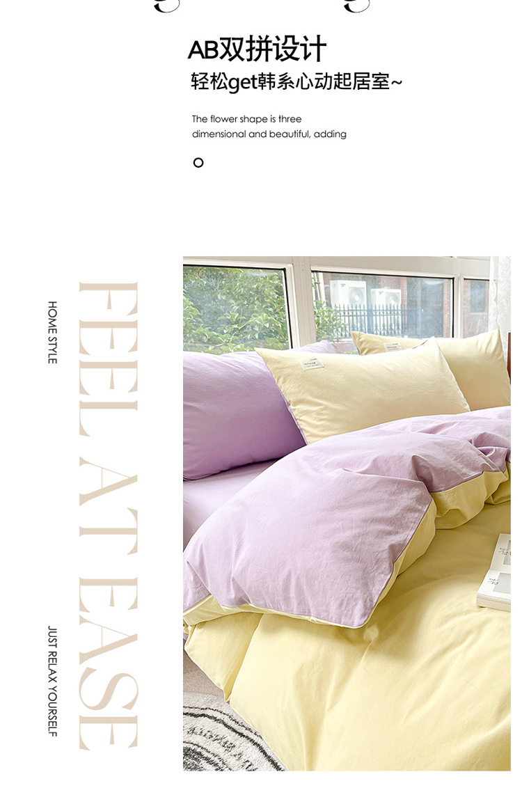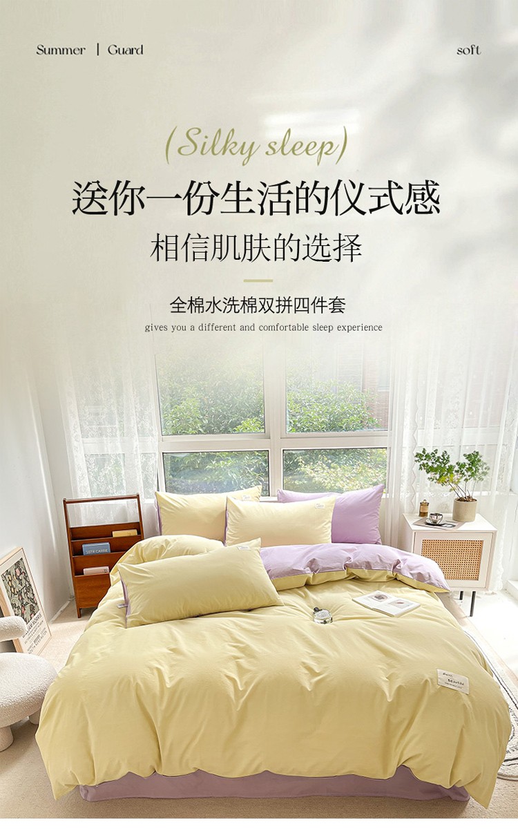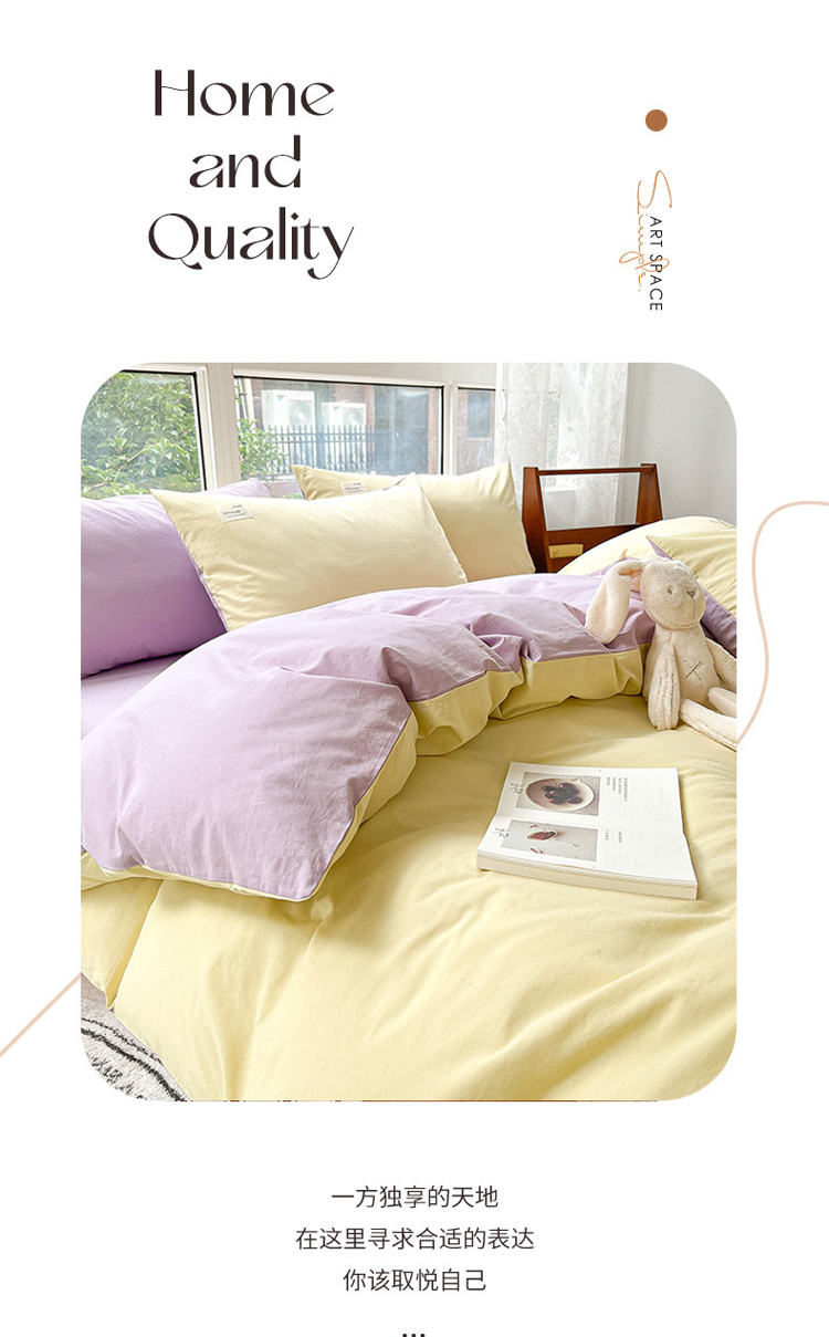 当前位置: 91家纺网 > 商品网购 > 床品套件 > 四件套 > 全棉普通四件套 > 寐居 2023新款双拼全棉水洗棉纯色四件套 鹅黄+香芋紫