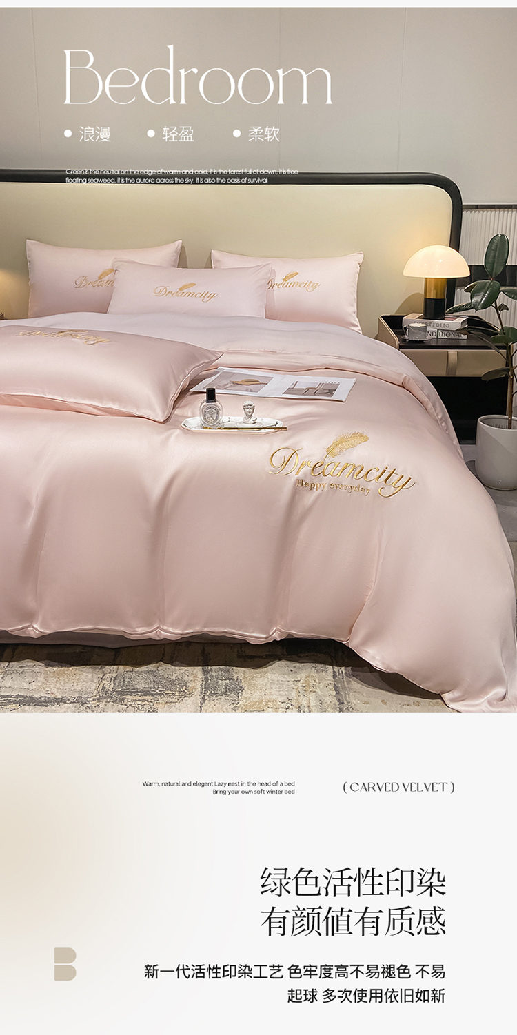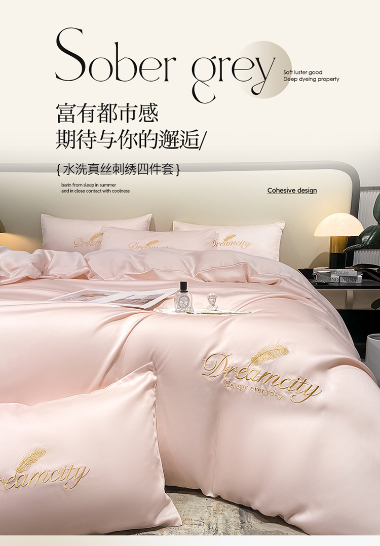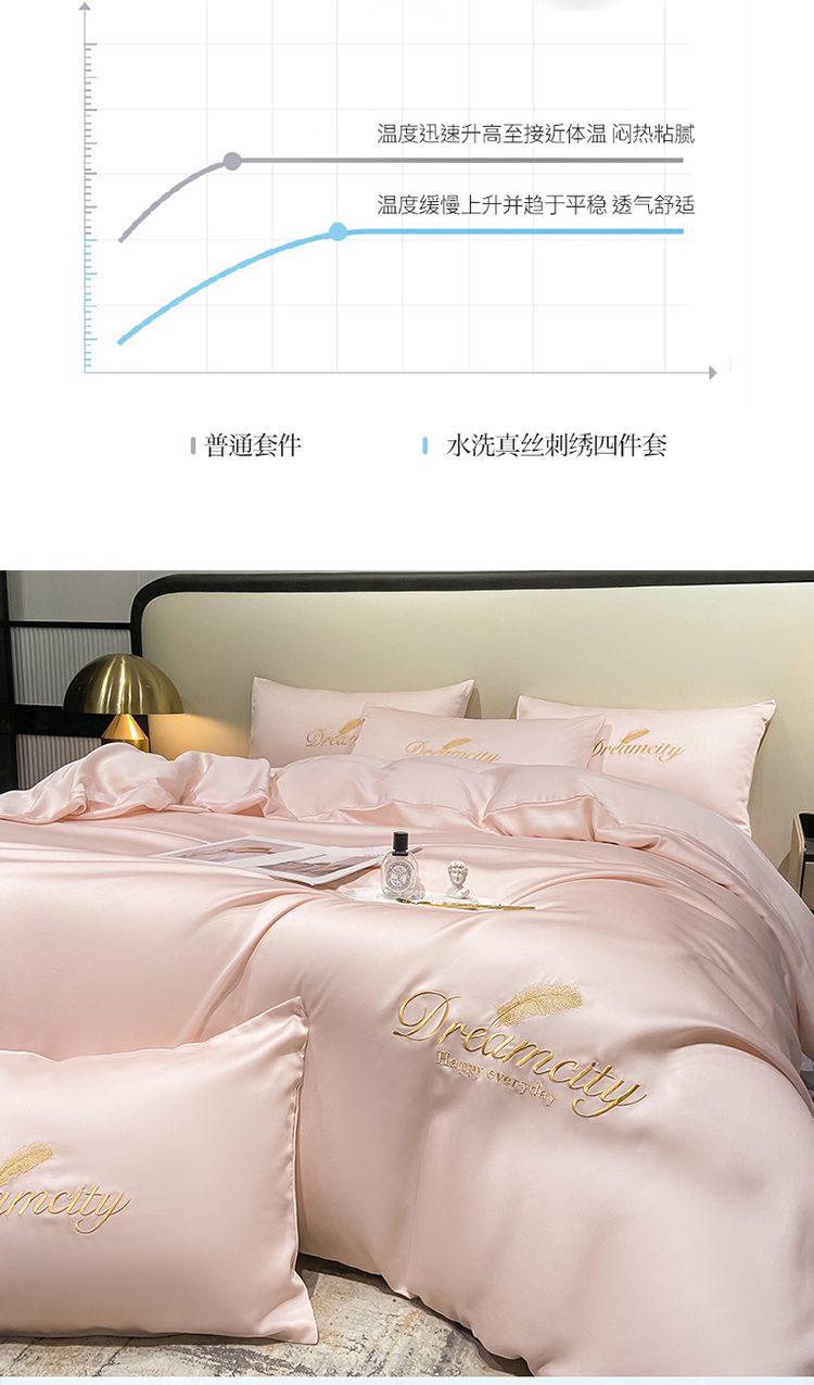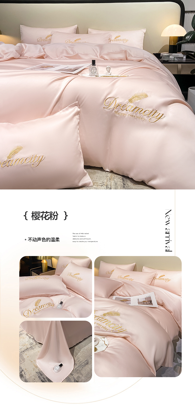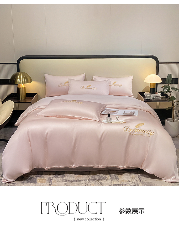 商品名称:花愿 2025新款水洗真丝刺绣四件套-羽梦系列 樱花粉