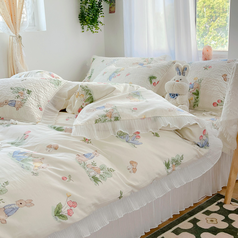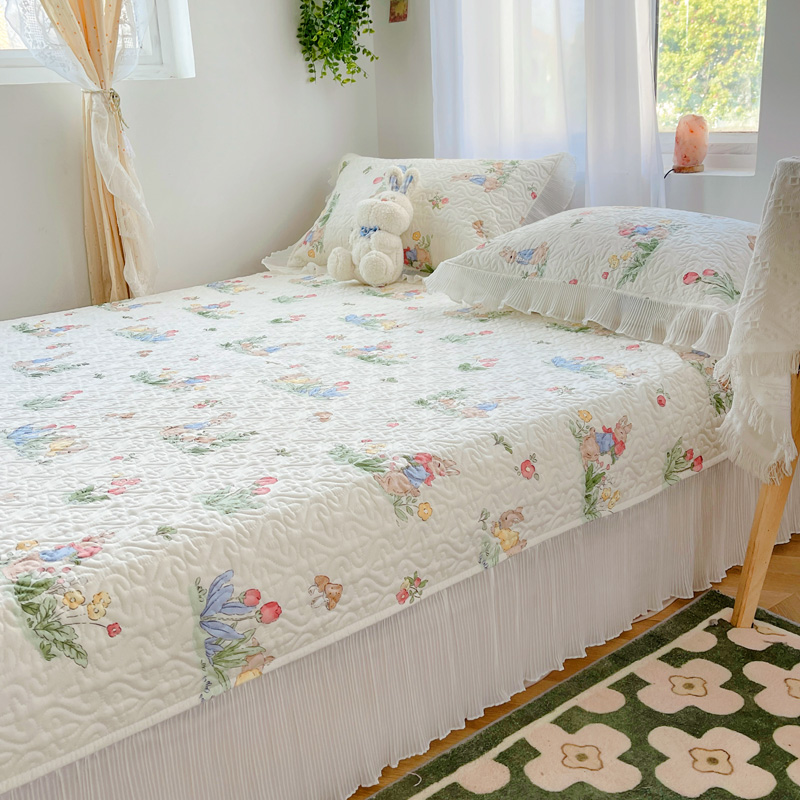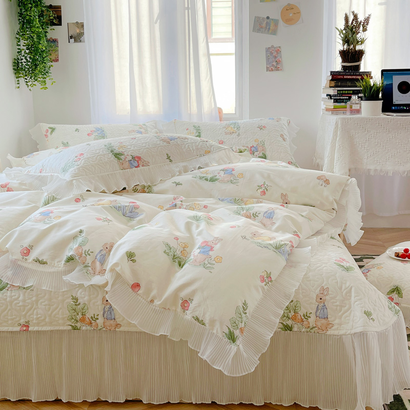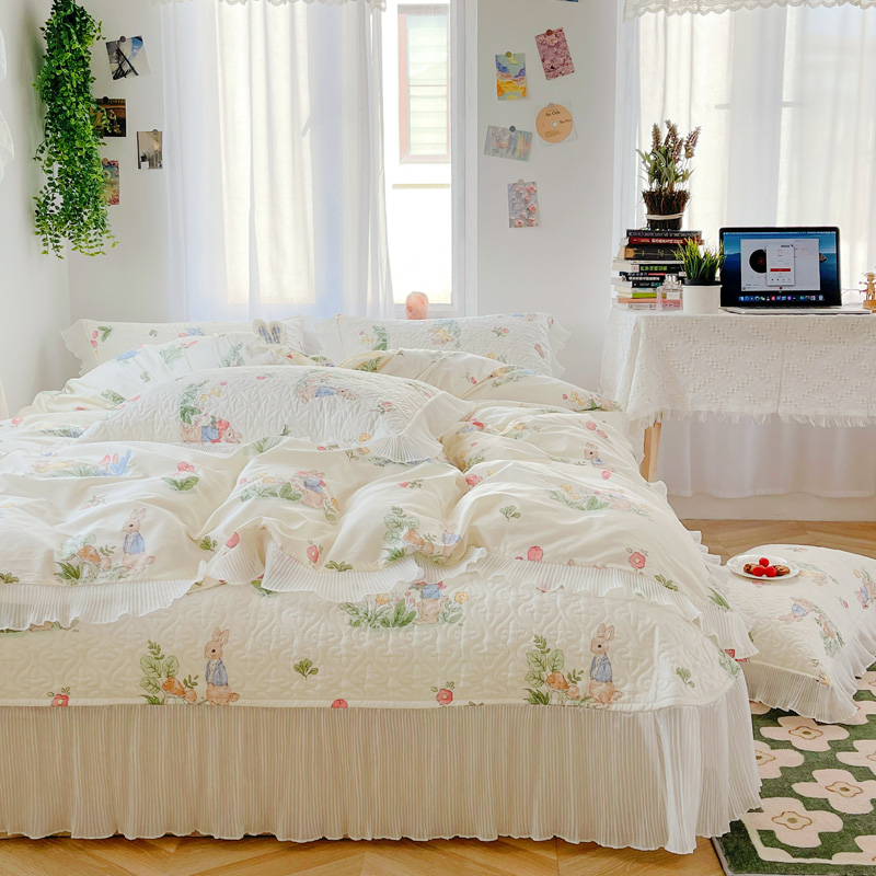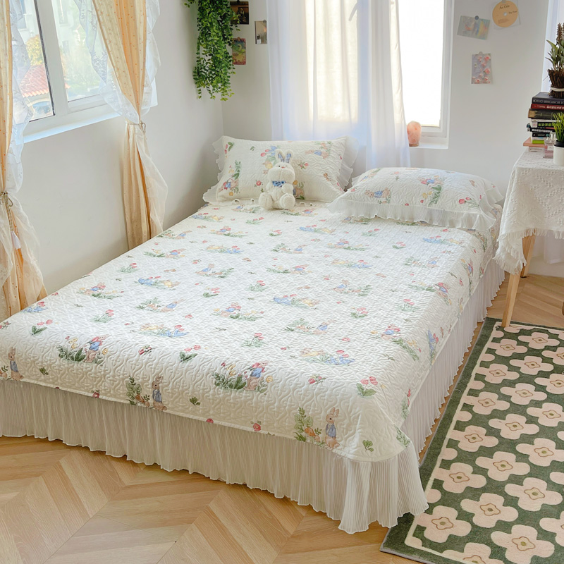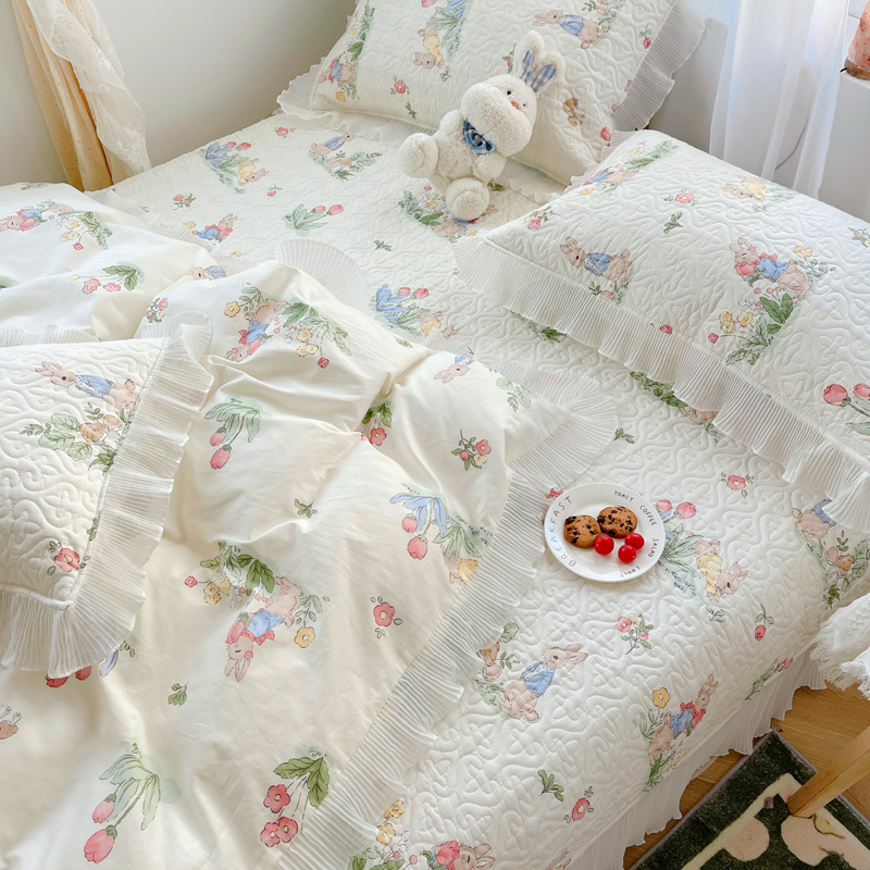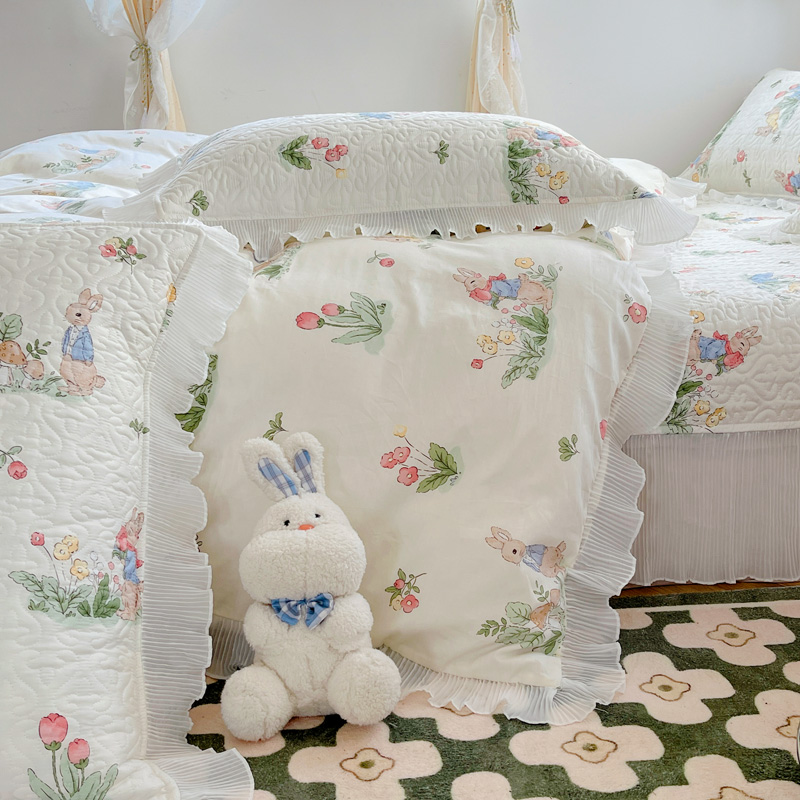 商品名称:添越 2024小清新韩版蕾丝花边纯棉夹棉床盖三件套全棉丛林小兔