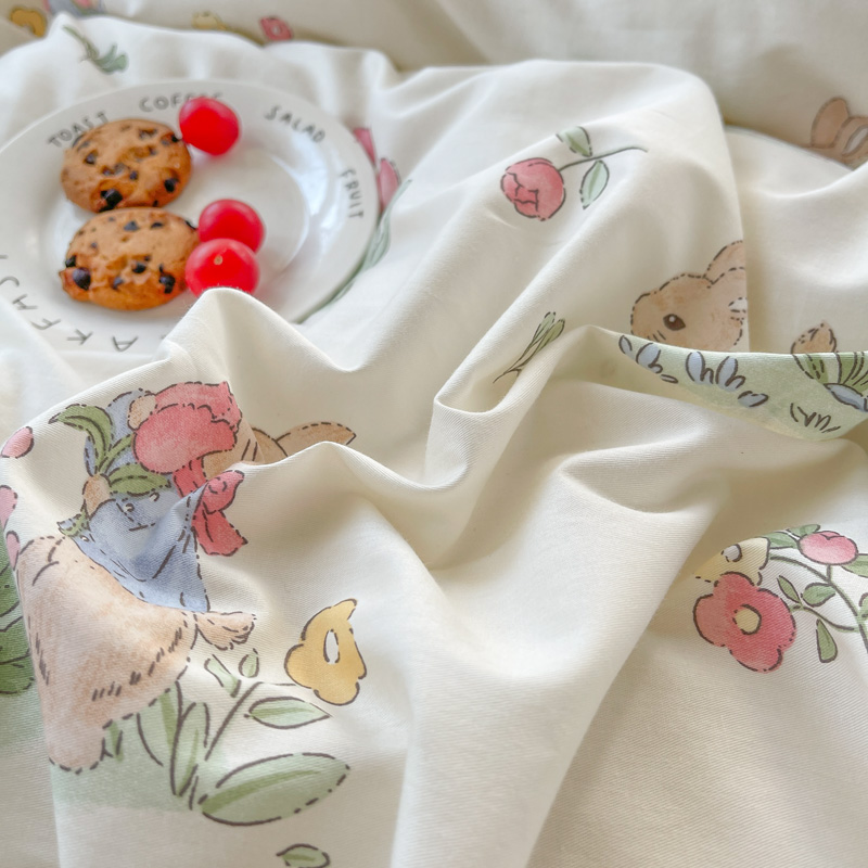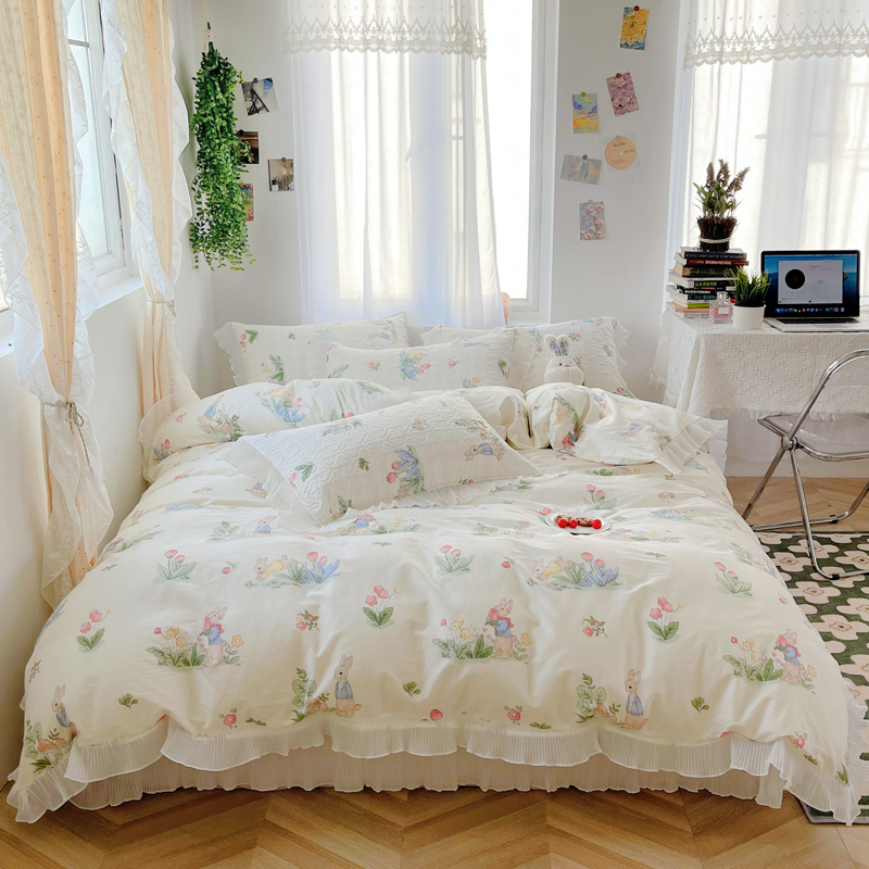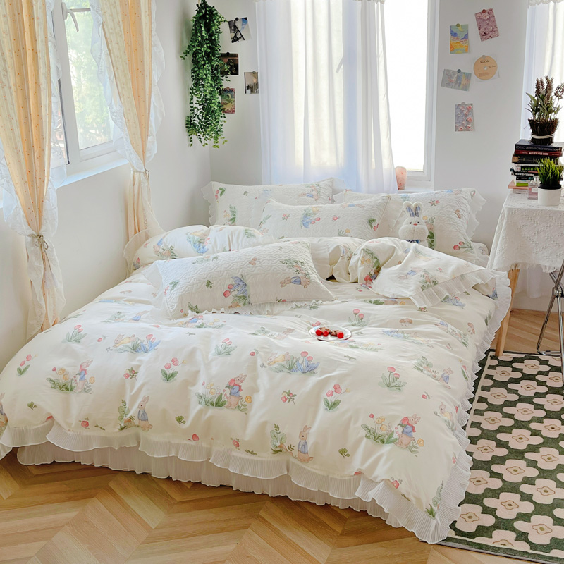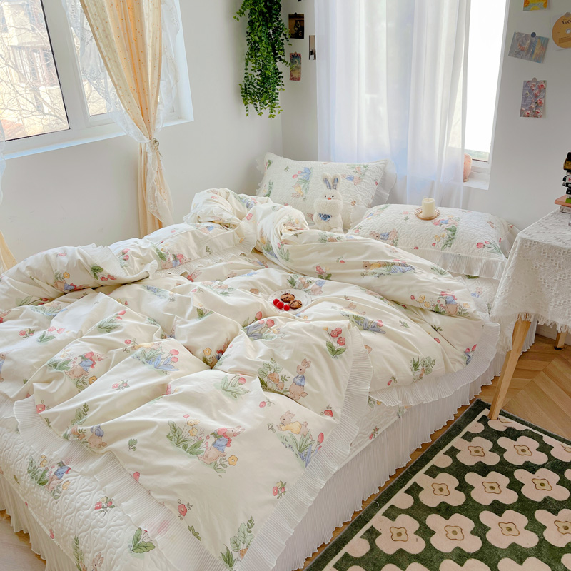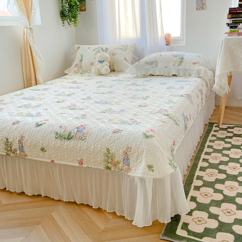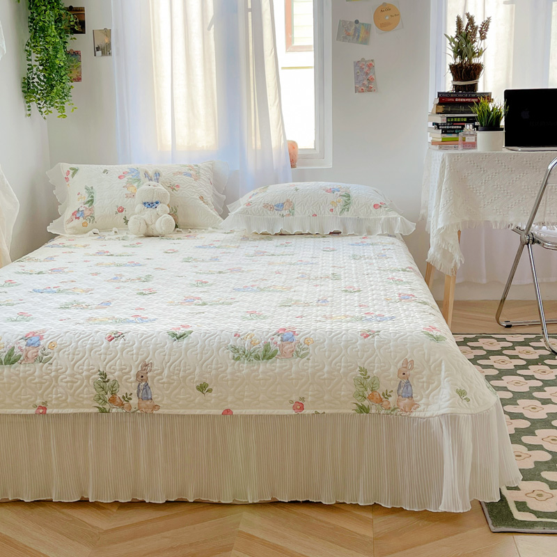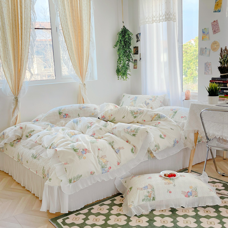 商品名称:添越 2024小清新韩版蕾丝花边纯棉夹棉床盖三件套全棉丛林小兔