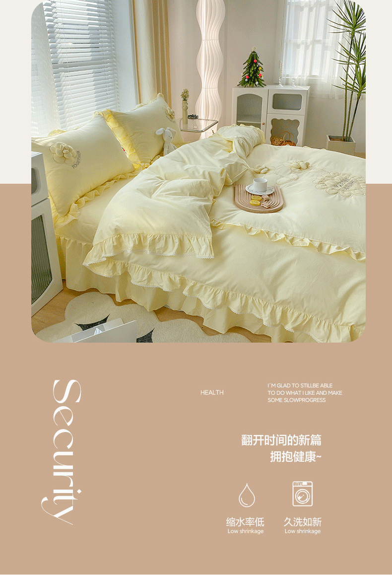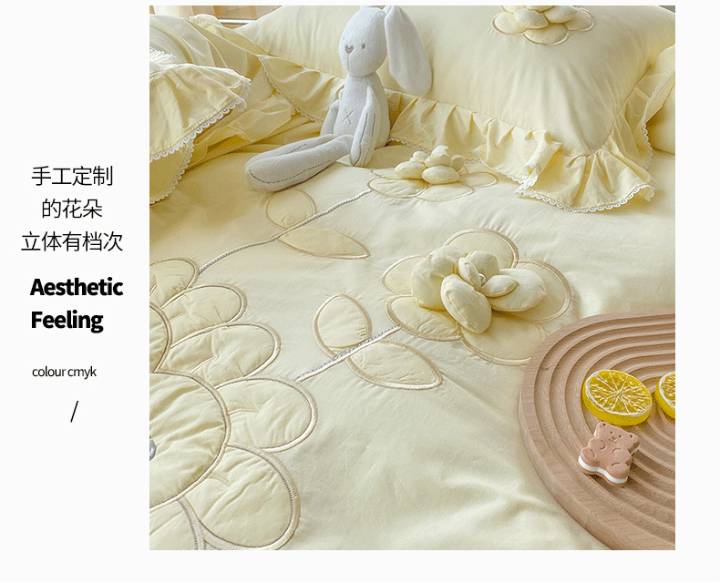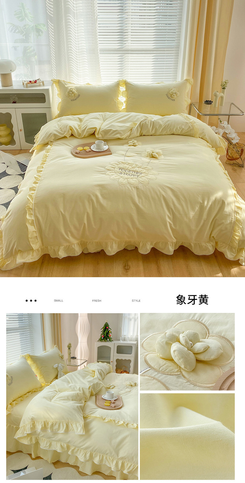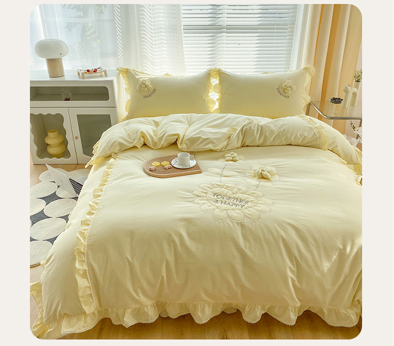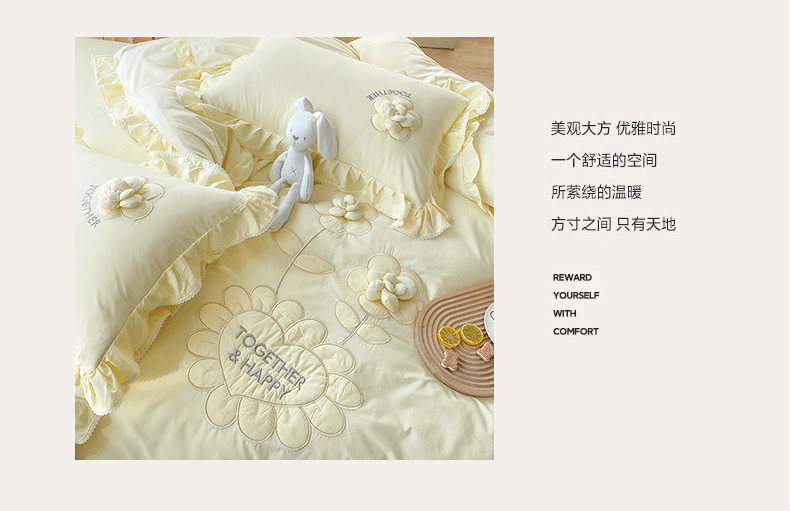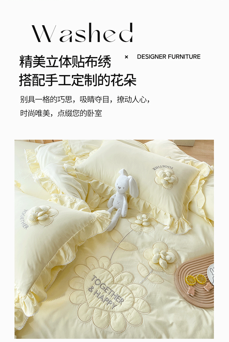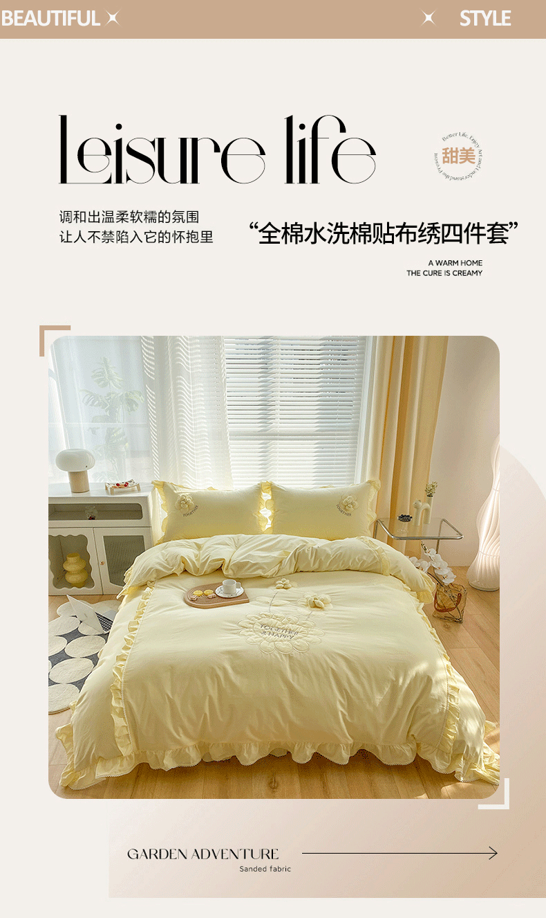 乐嘉盈2025新款全棉水洗棉立体提花贴布绣四件套 象牙黄