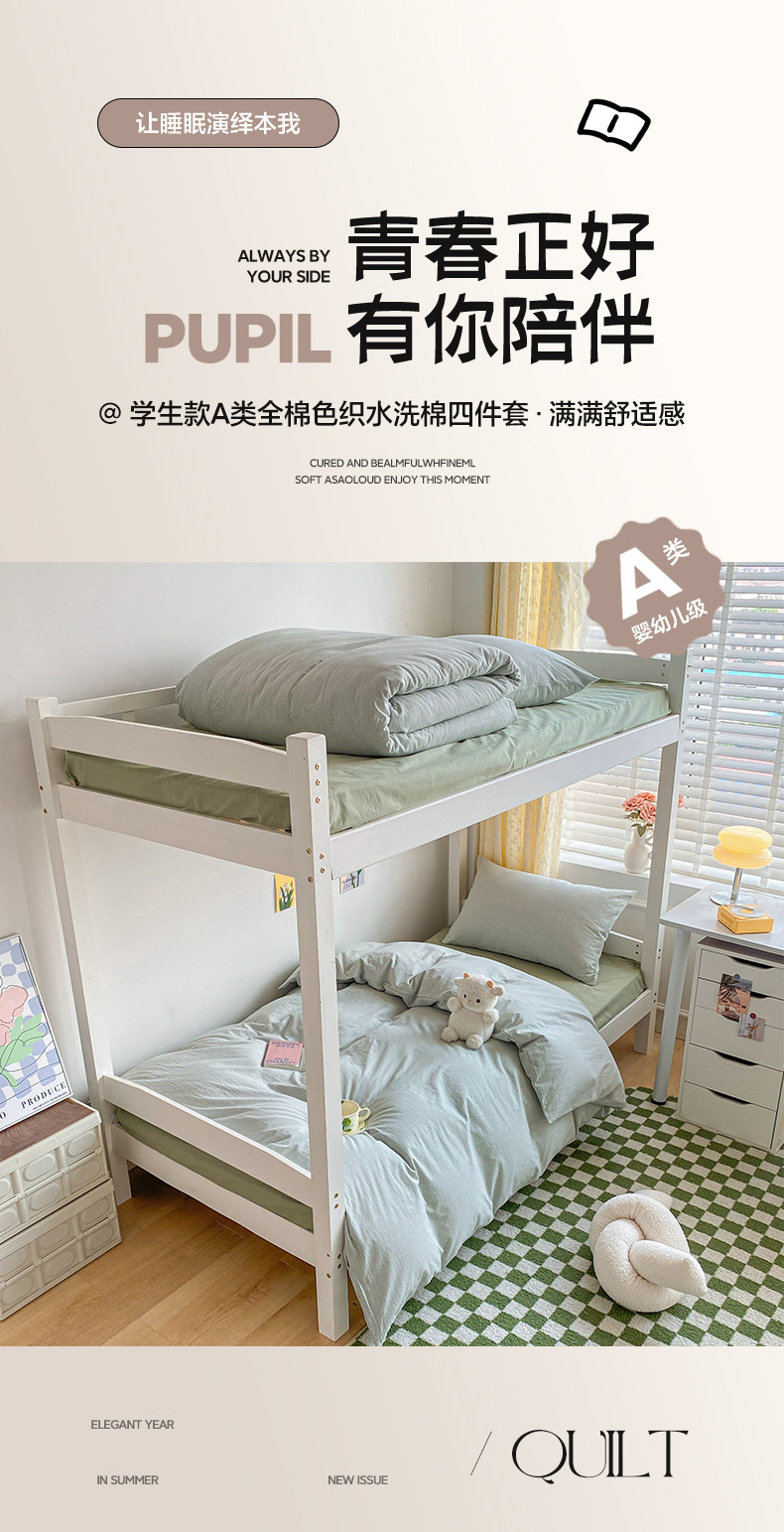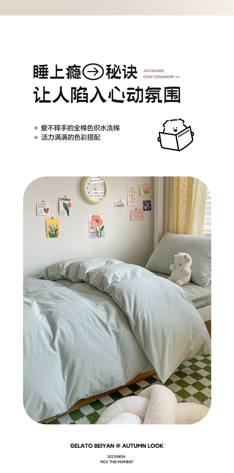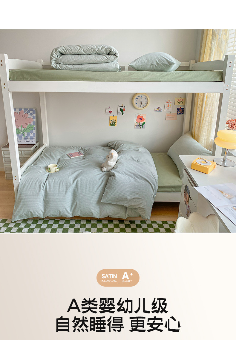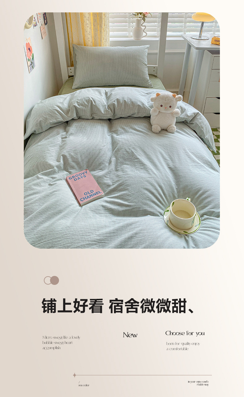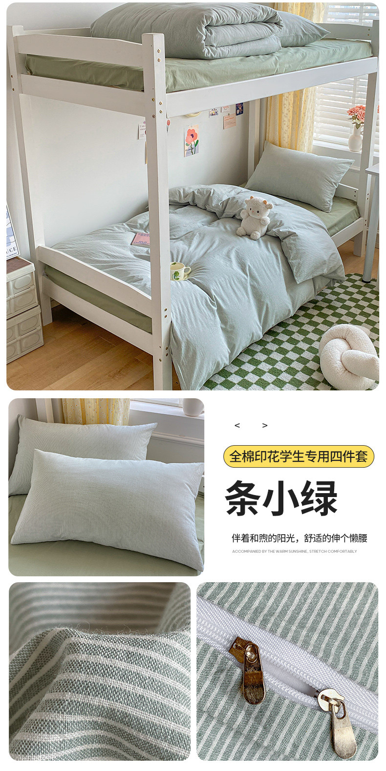 莱茵家居 2024新款色织全棉水洗棉学生床三件套 条小绿
