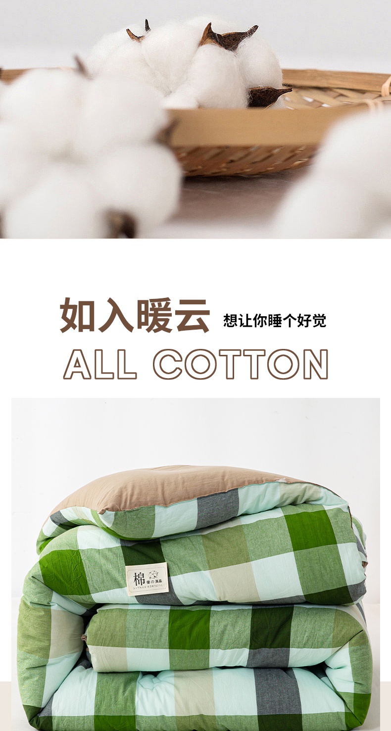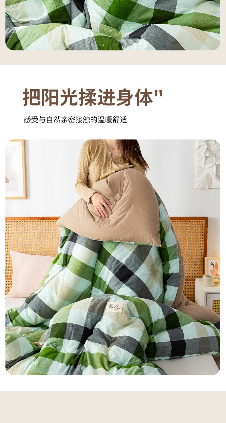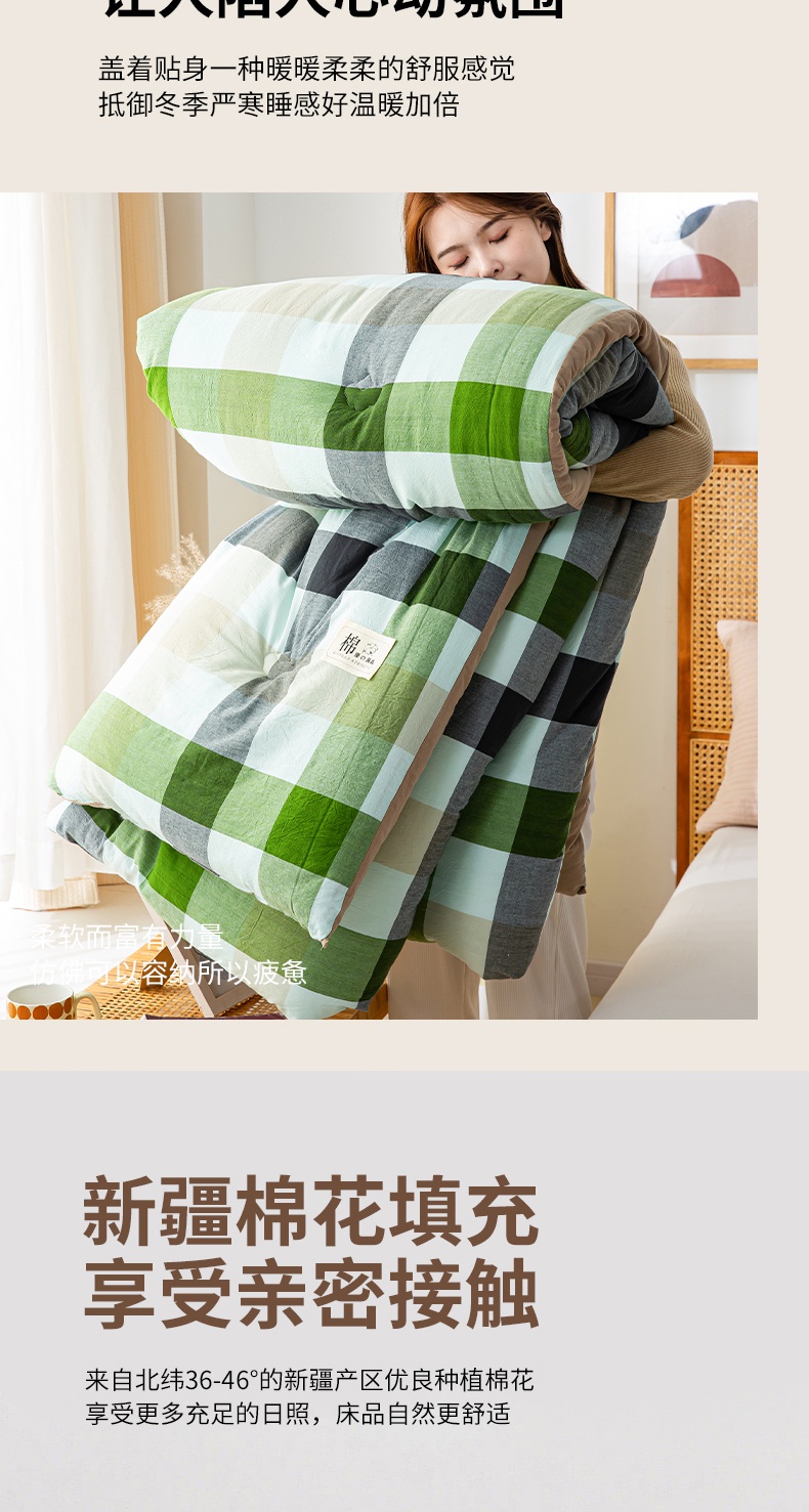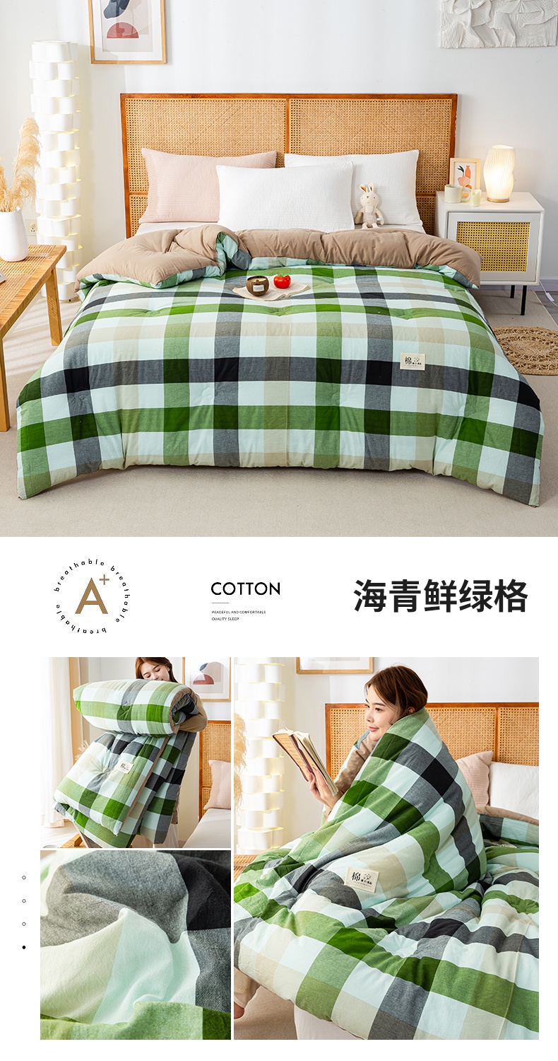 • 91家纺网 家纺一手货源 找家纺 鸣升家纺 新款无印风全棉色织水洗棉100%棉花被冬被被子被芯 海青鲜绿格