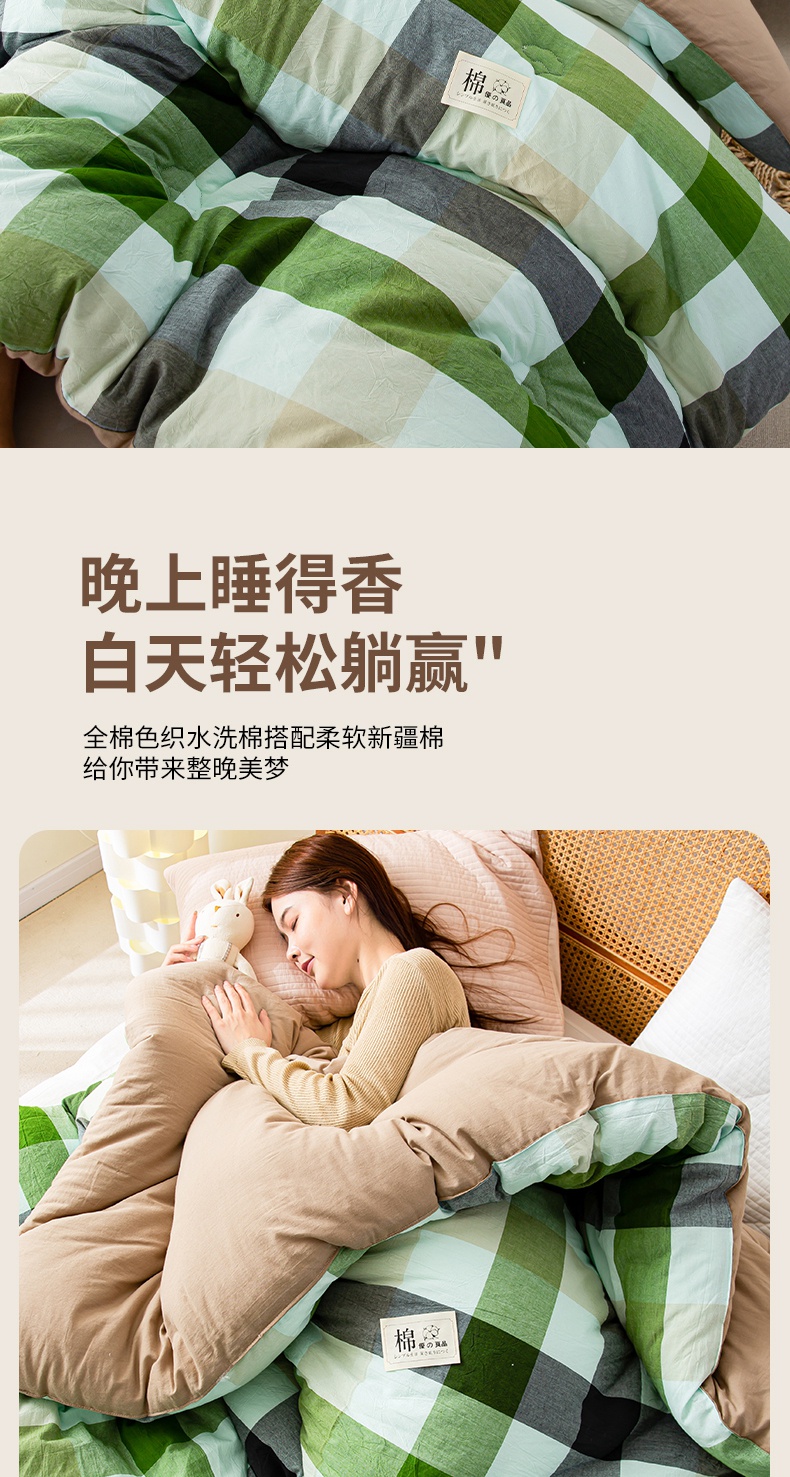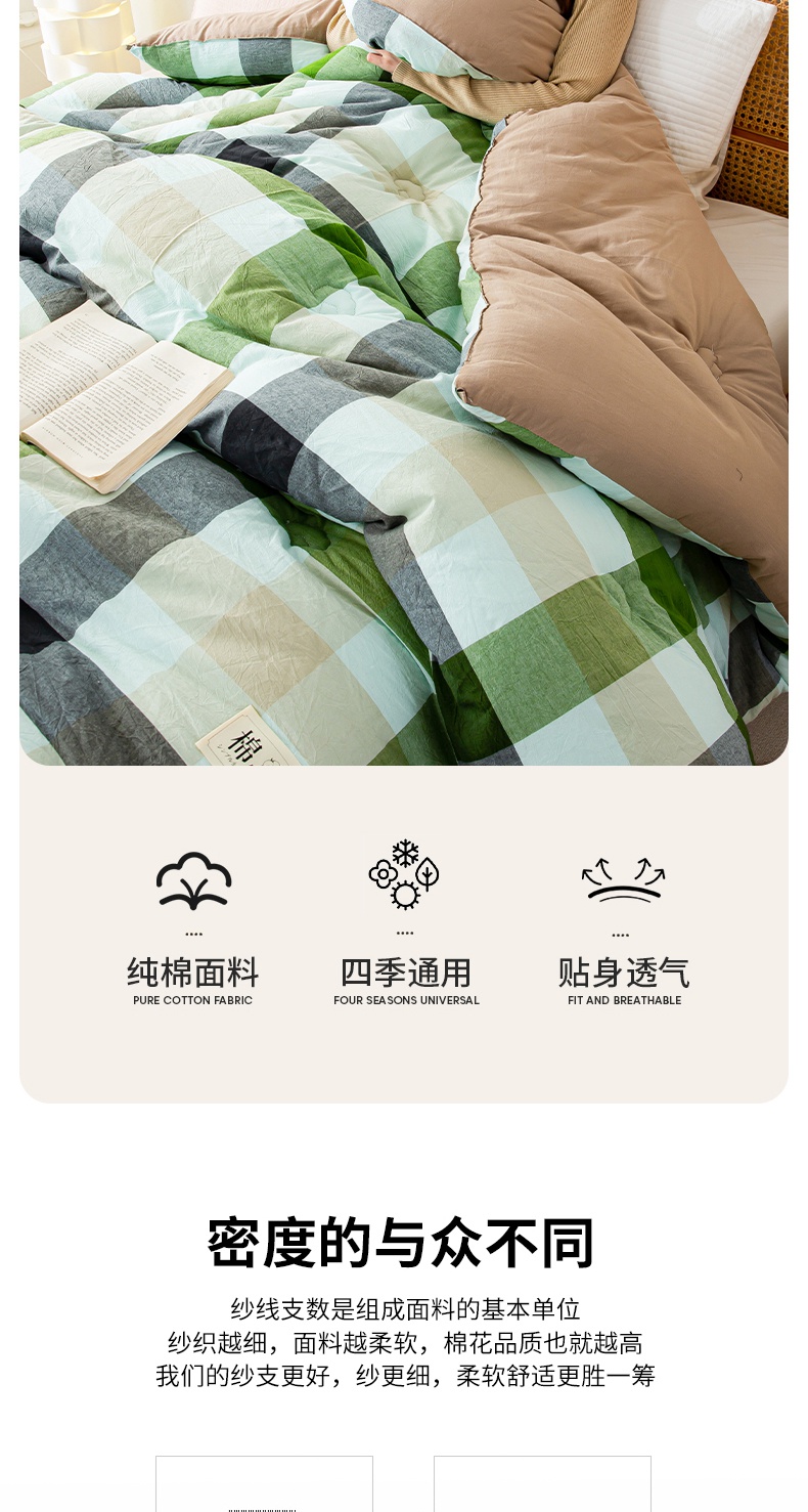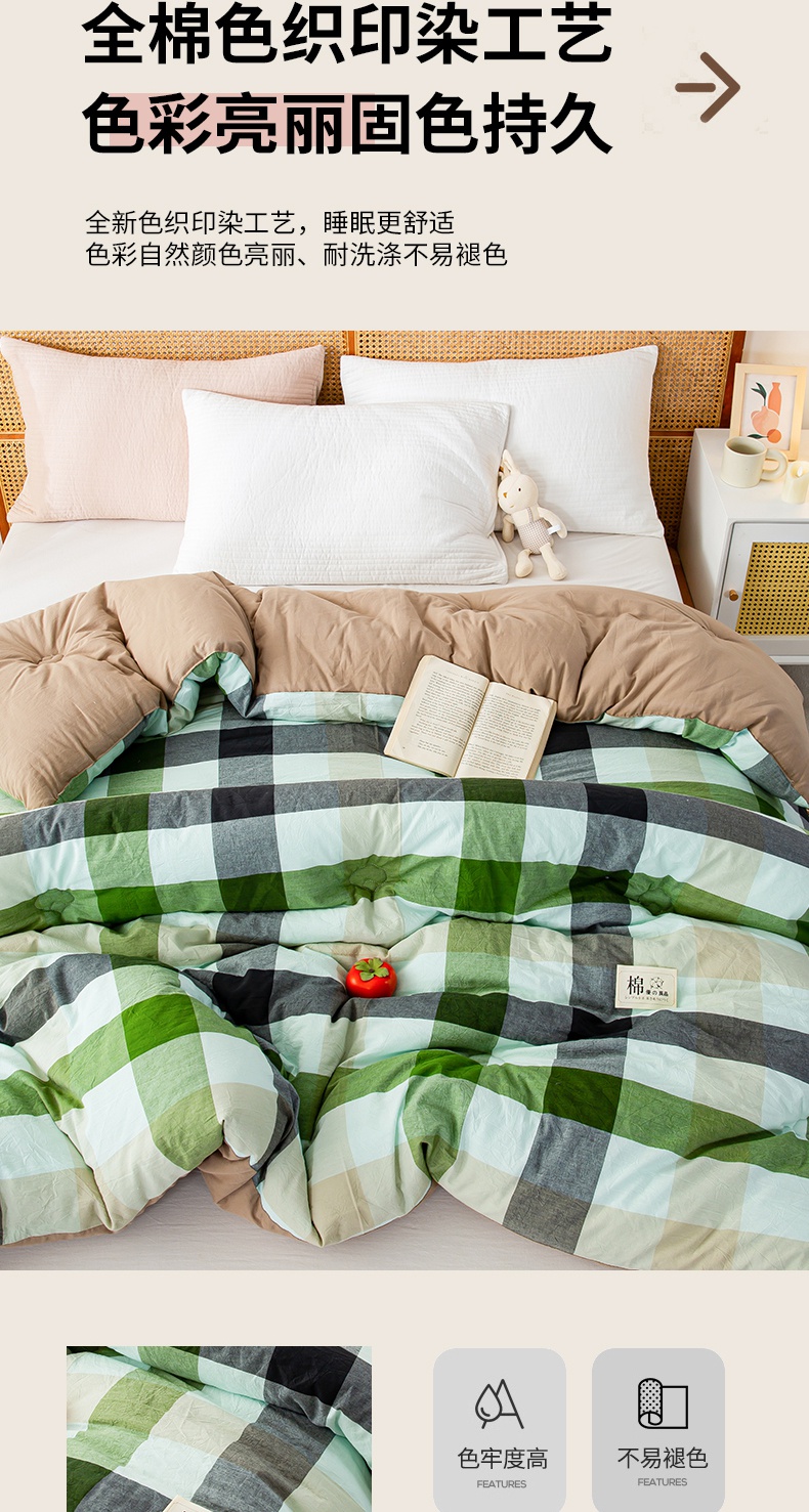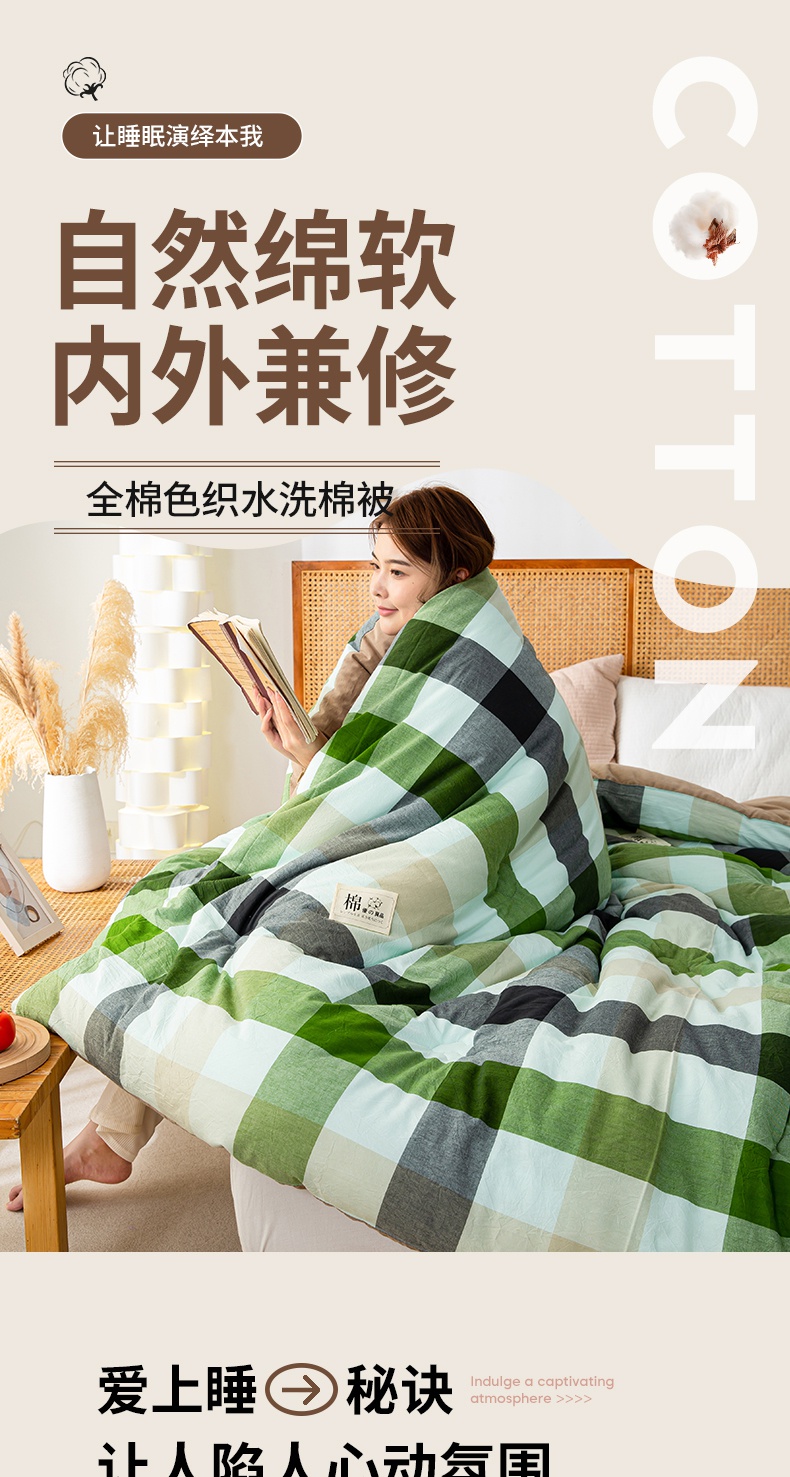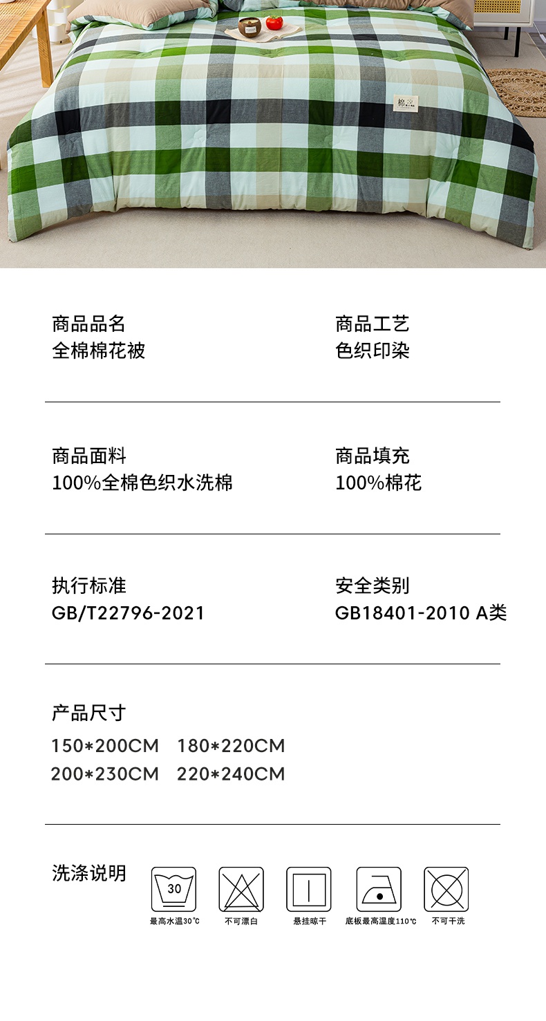 • 91家纺网 家纺一手货源 找家纺 鸣升家纺 新款无印风全棉色织水洗棉100%棉花被冬被被子被芯 海青鲜绿格