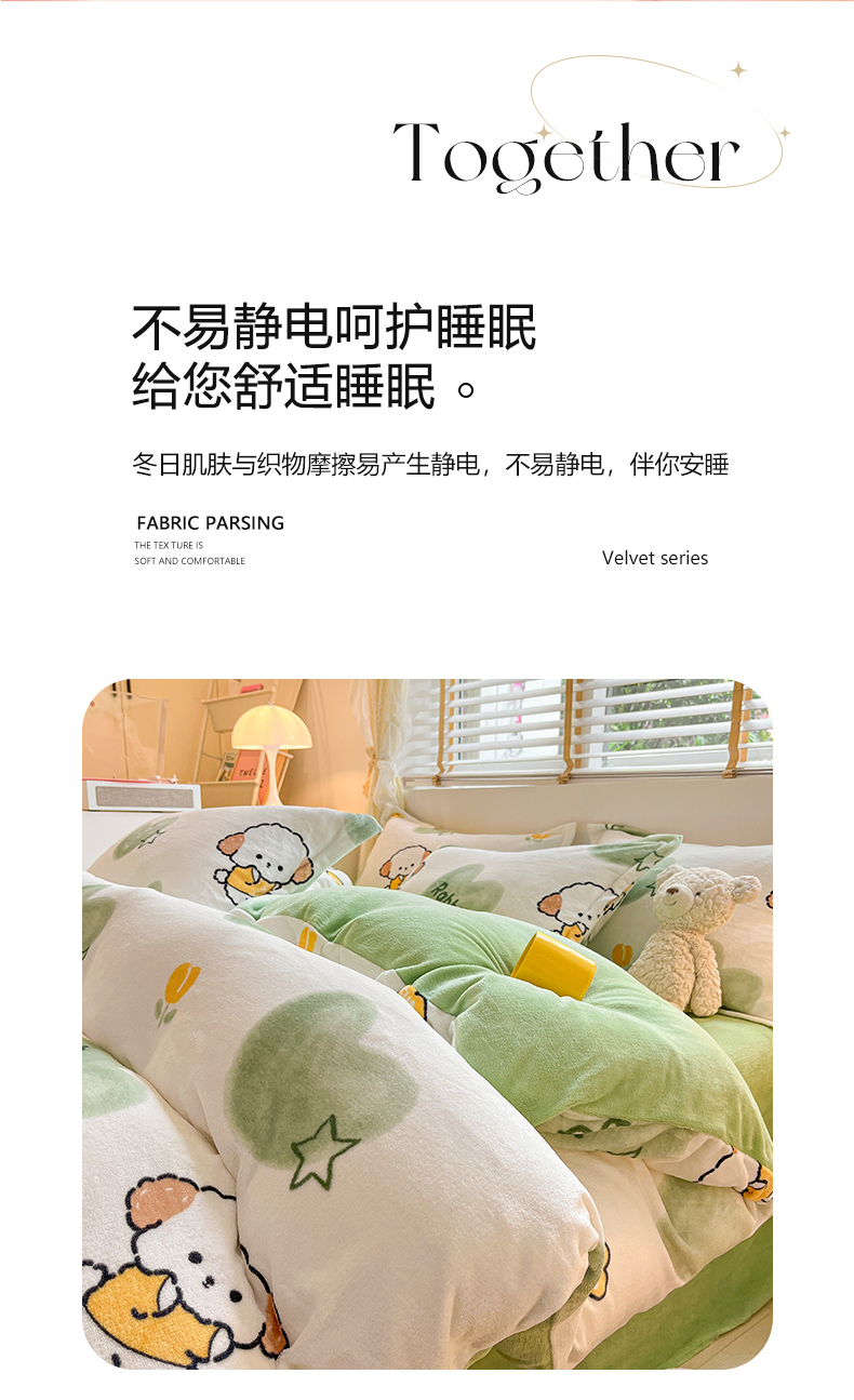 商品名称:佰亿莱 2025直播新款印花小清新法莱绒牛奶绒四件套 爱心狗