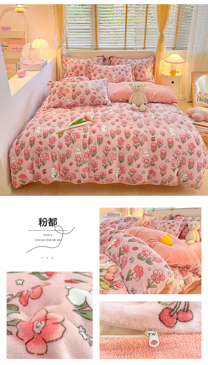 商品名称:佰亿莱 2025直播新款印花小清新法莱绒牛奶绒四件套 粉都