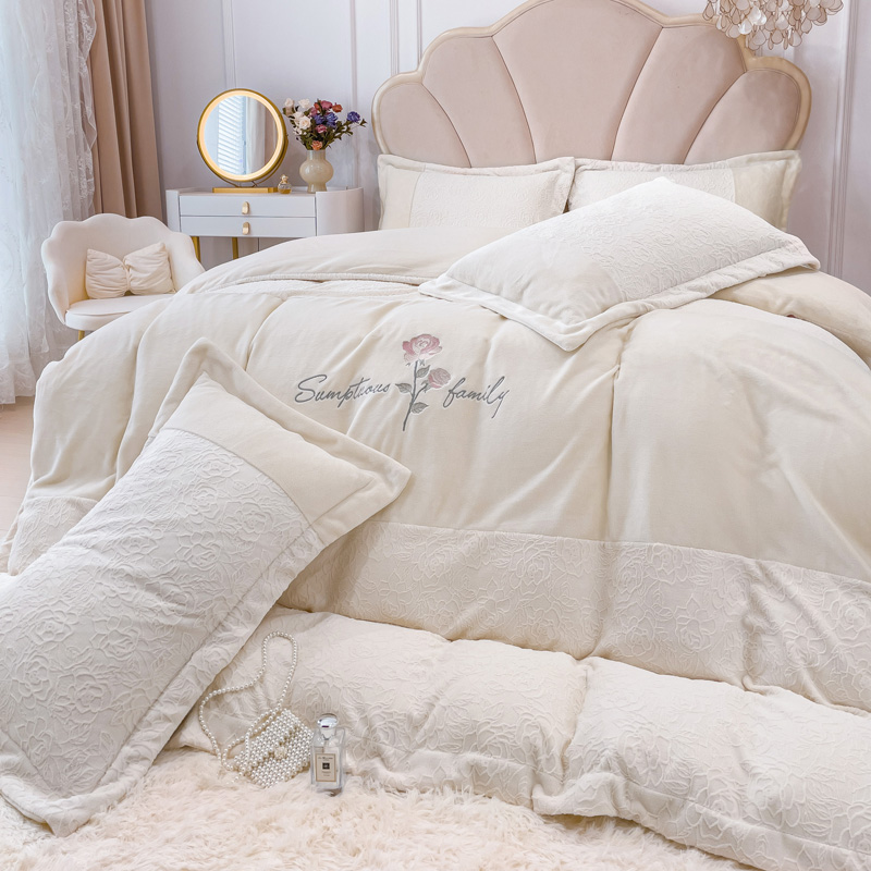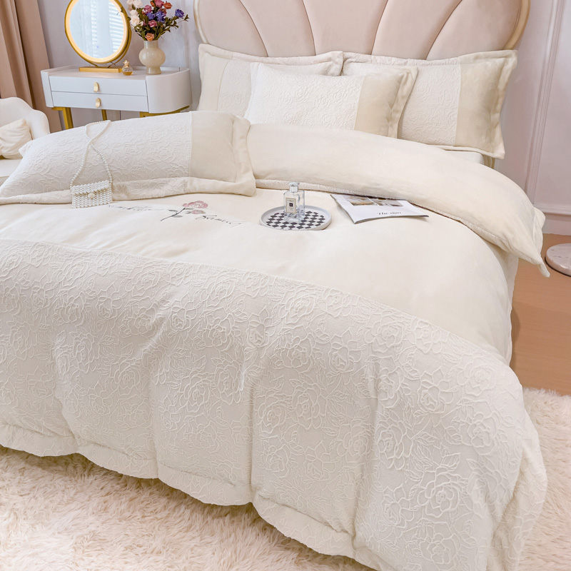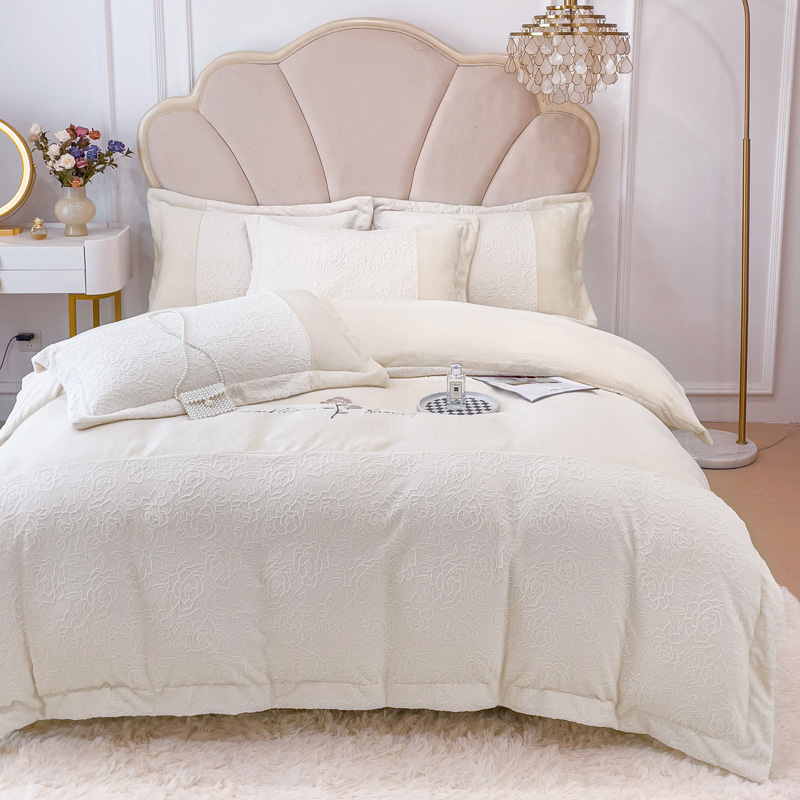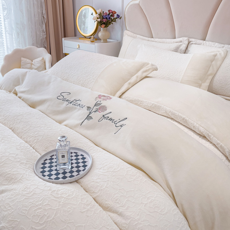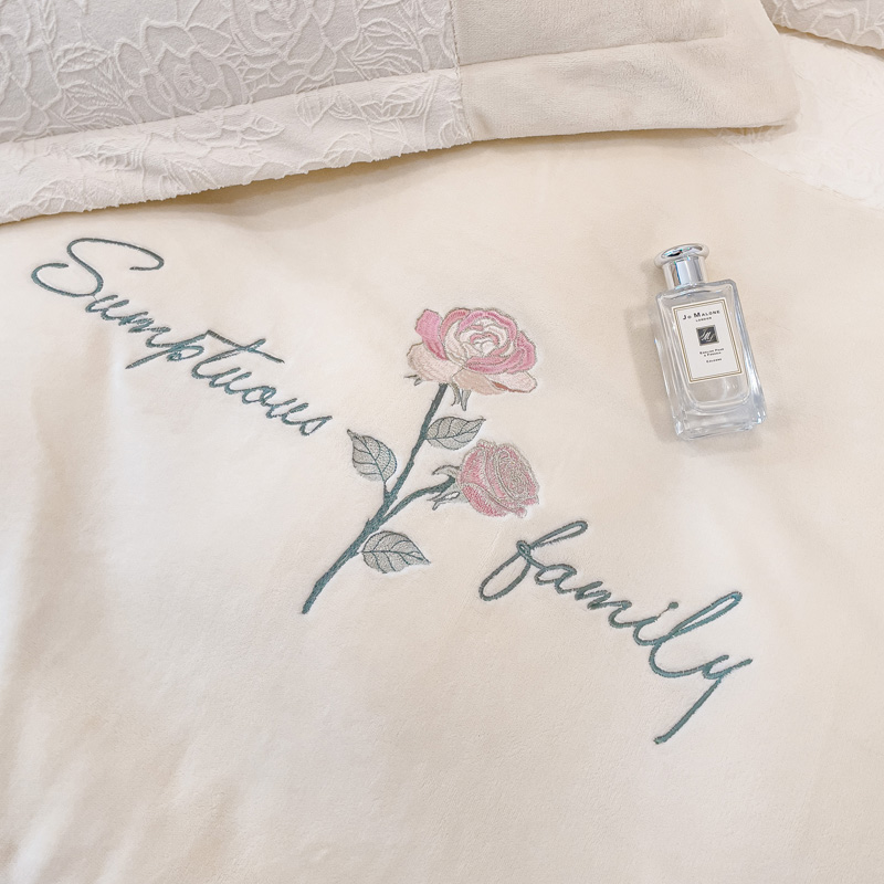 宜家坊 2023新款A类牛奶绒雕花拼接刺绣款四件套-假日玫瑰 奶芋白