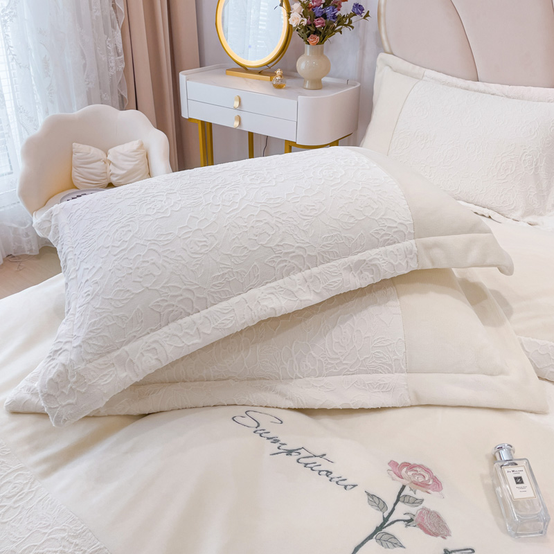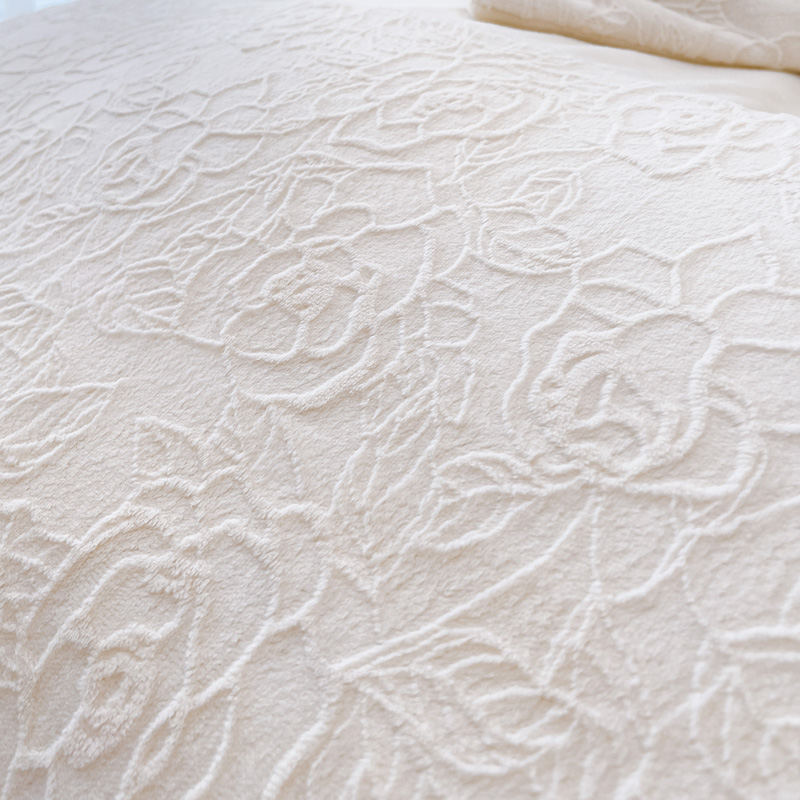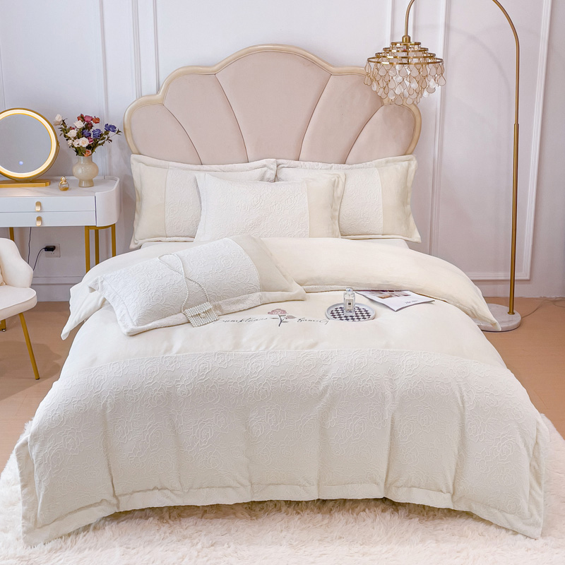 商品名称:宜家坊 2023新款A类牛奶绒雕花拼接刺绣款四件套-假日玫瑰 奶芋白