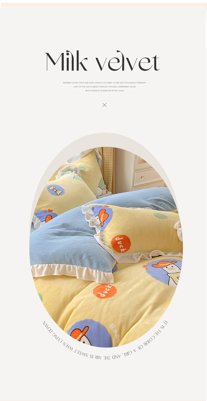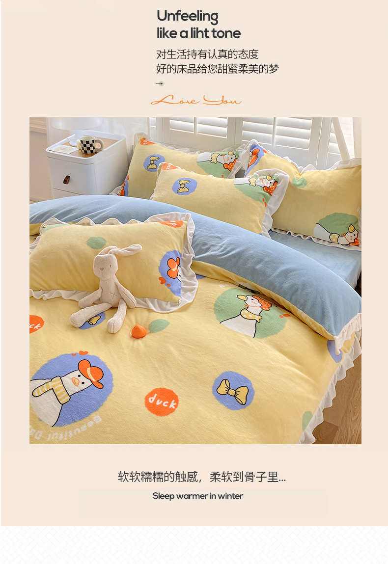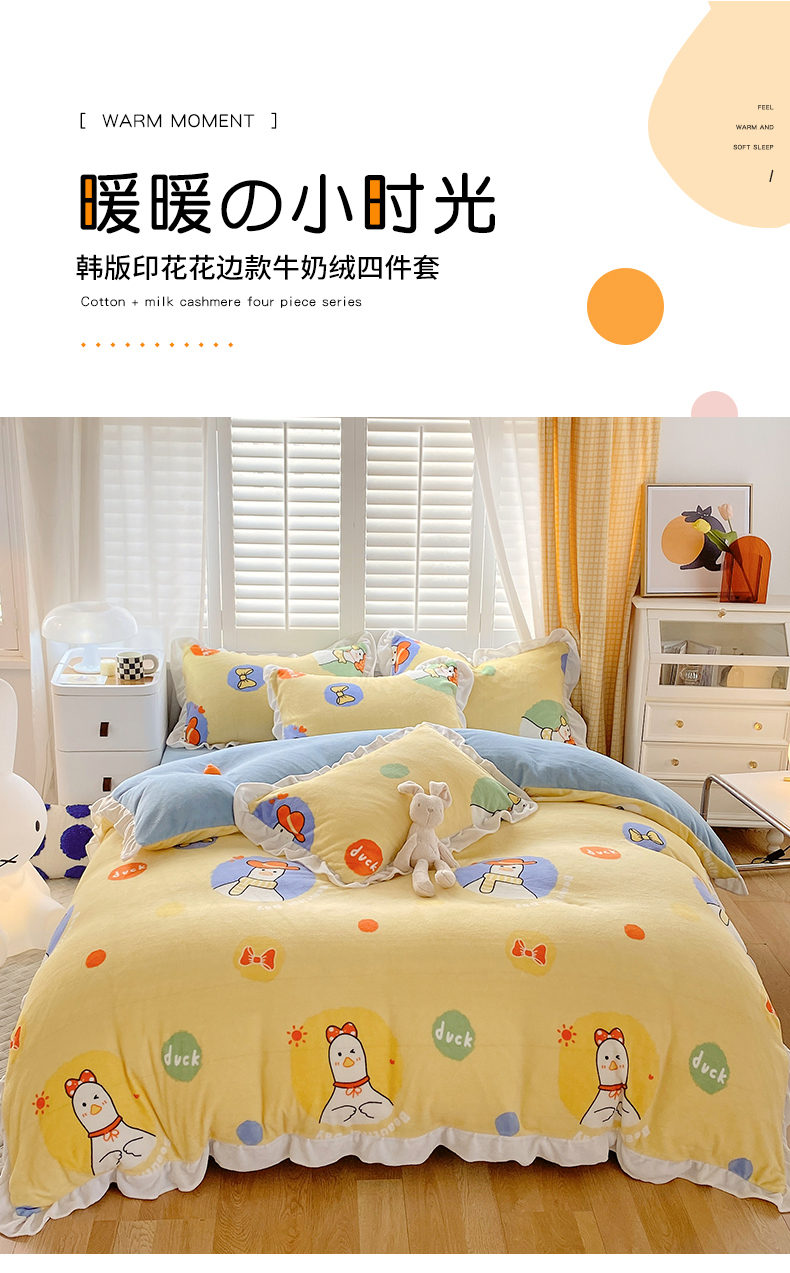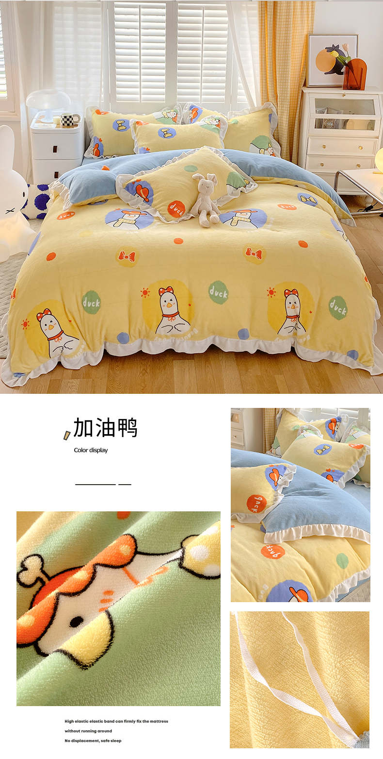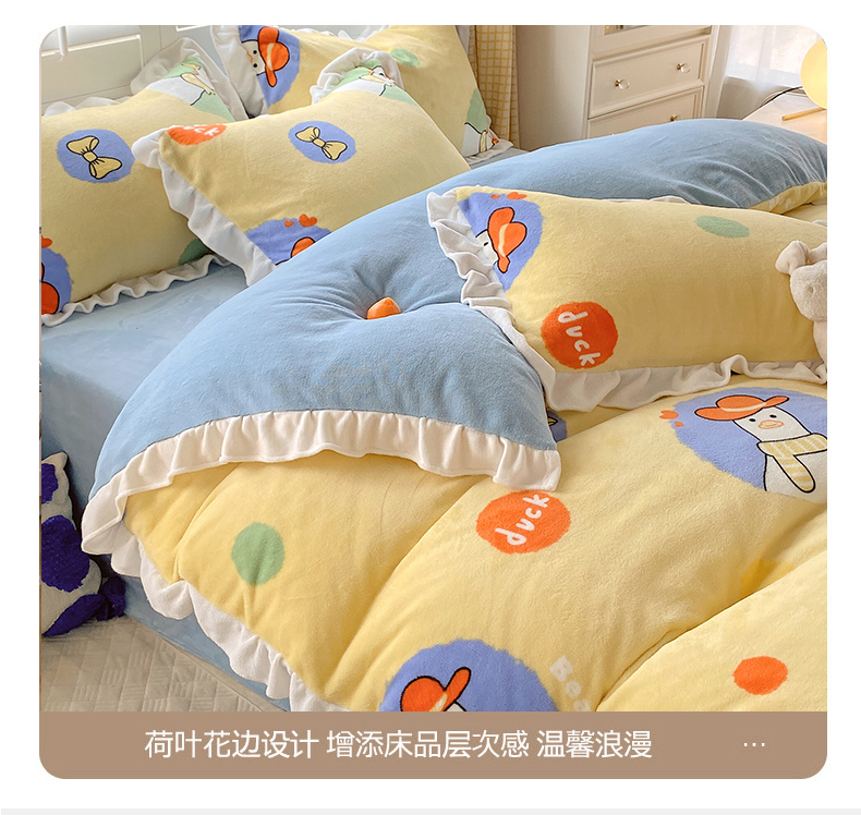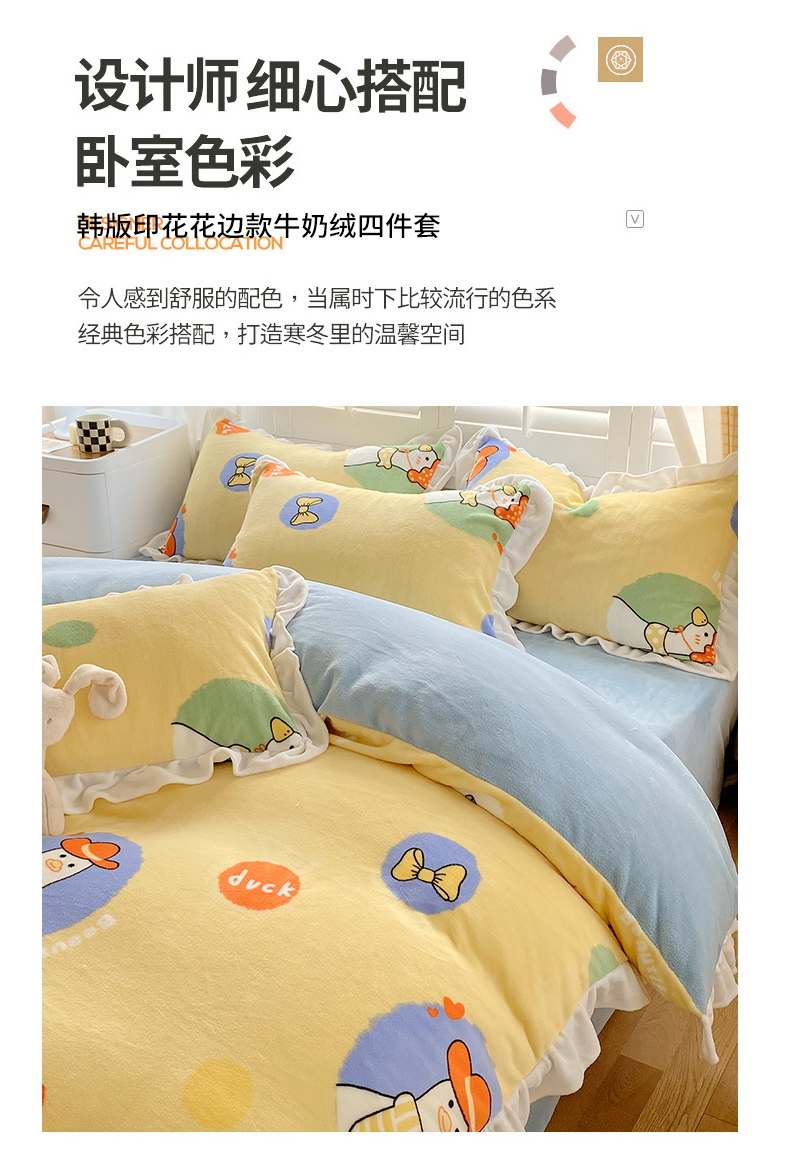 商品名称:宜家坊 2023新款直播韩版印花花边款牛奶绒四件套 加油鸭