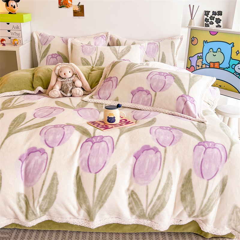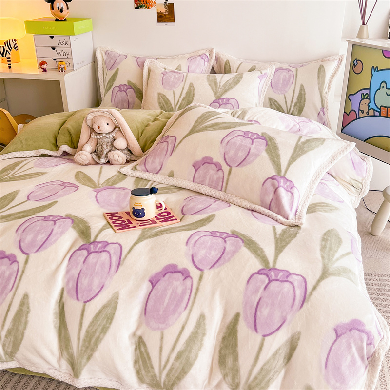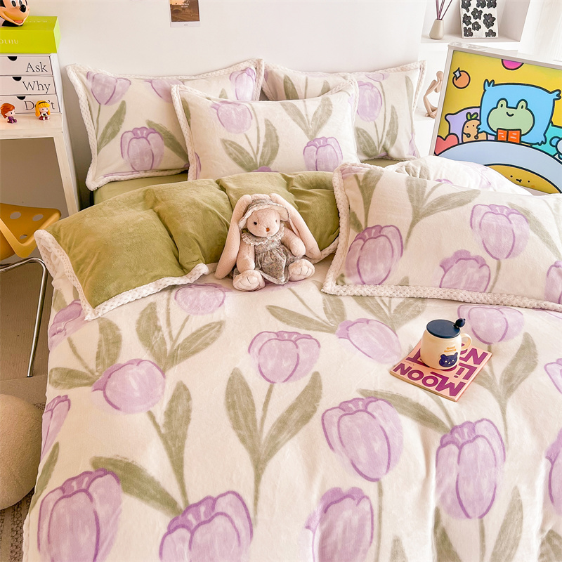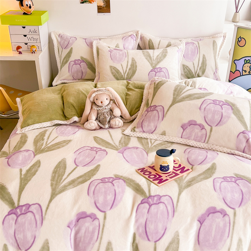 川悦生活 2023新款牛奶绒200克宽边四件套 宽边紫色花园