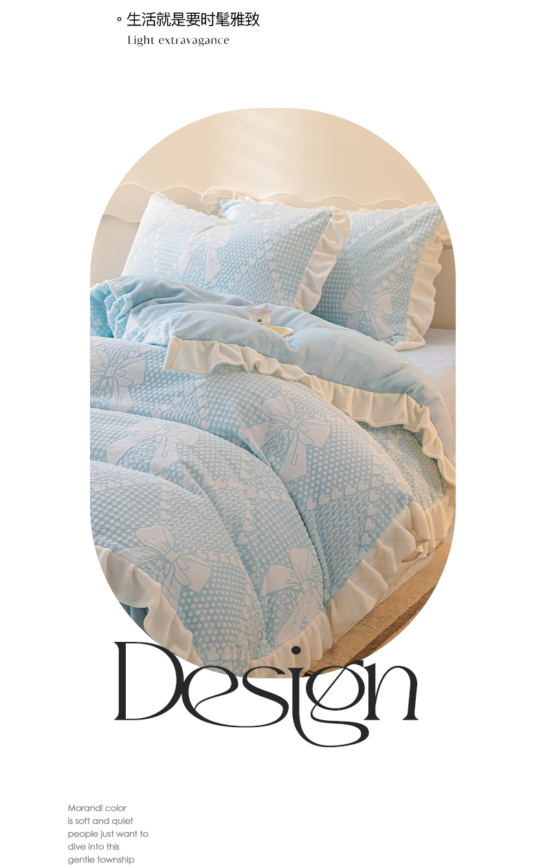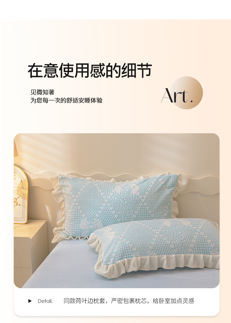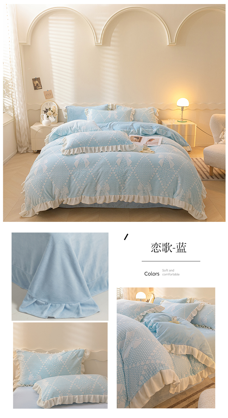 商品名称:如一 2023新款直播荷叶边雕花牛奶绒吊边床单工艺四件套 法莱绒珊瑚绒套件 恋歌-蓝