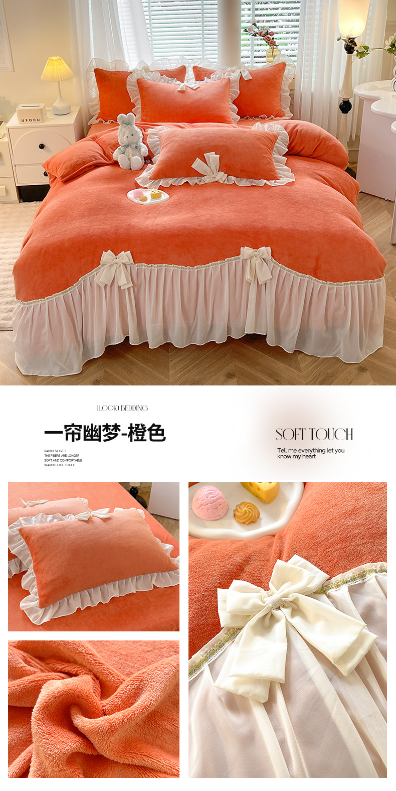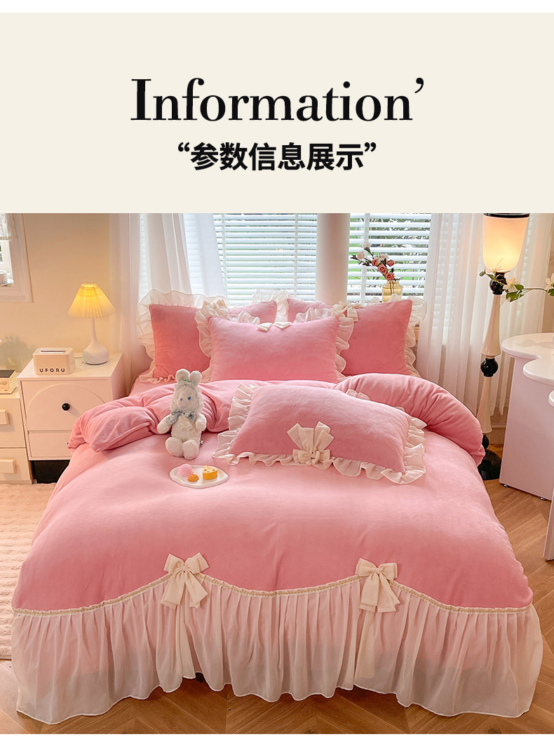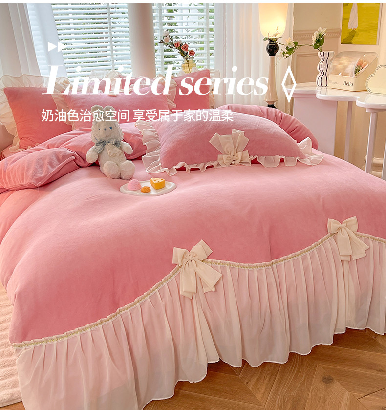 (总)芭比蔓 2024新款直播供货韩版花边款牛奶绒四件套,爱玛橙,宝石红,湖蓝,倾国粉,秋月黄,深灰,珍珠白,竹青绿