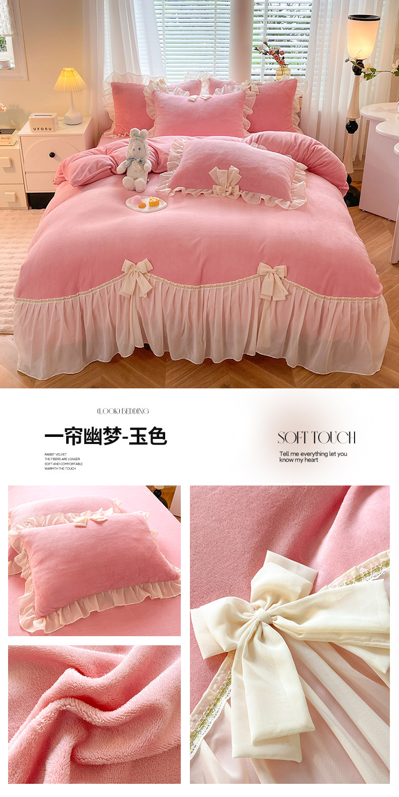 (总)芭比蔓家纺 2025新款亲肤磨毛法式浪漫四件套-依恋,依恋-粉色,依恋-蓝色,依恋-绿色,依恋-米色,依恋-玉色