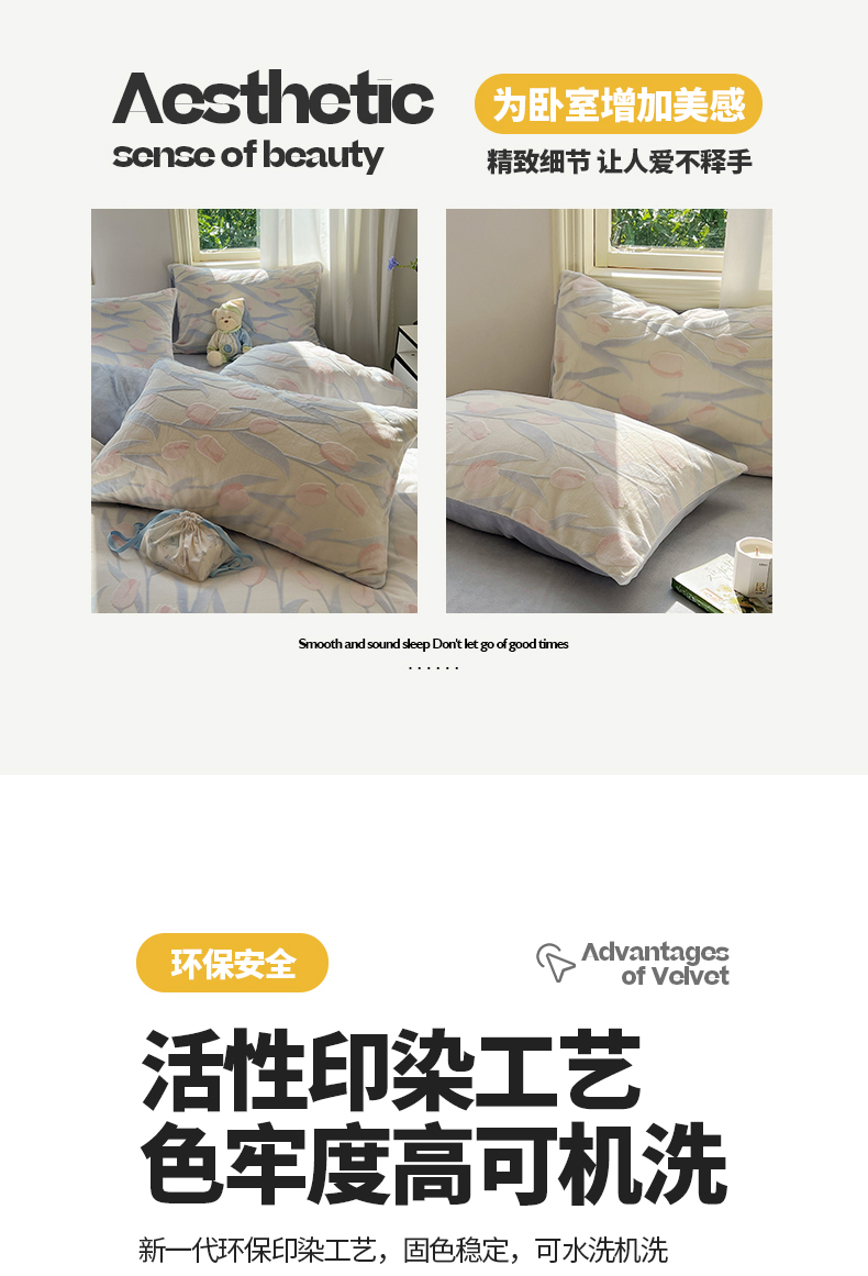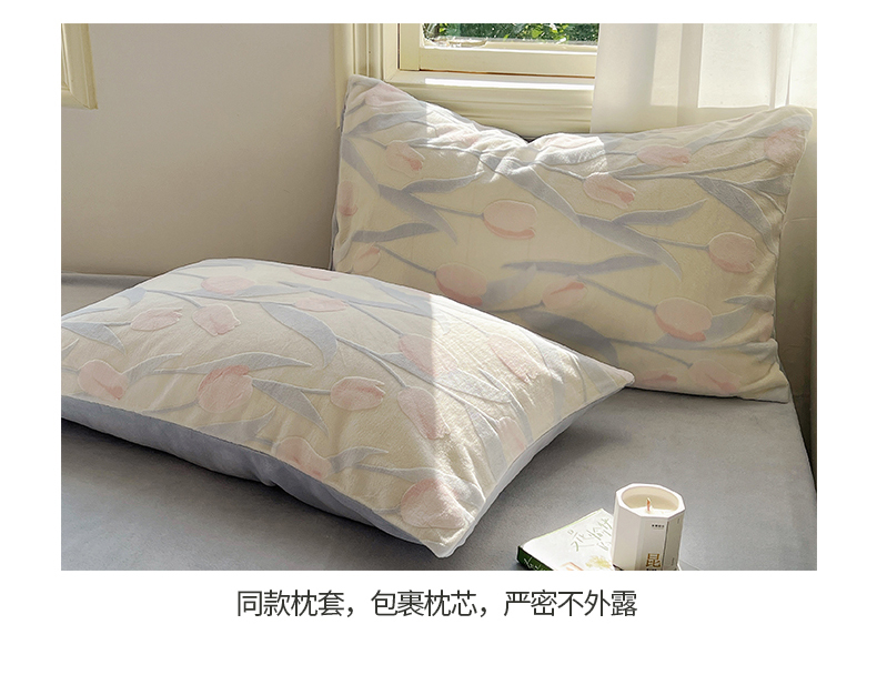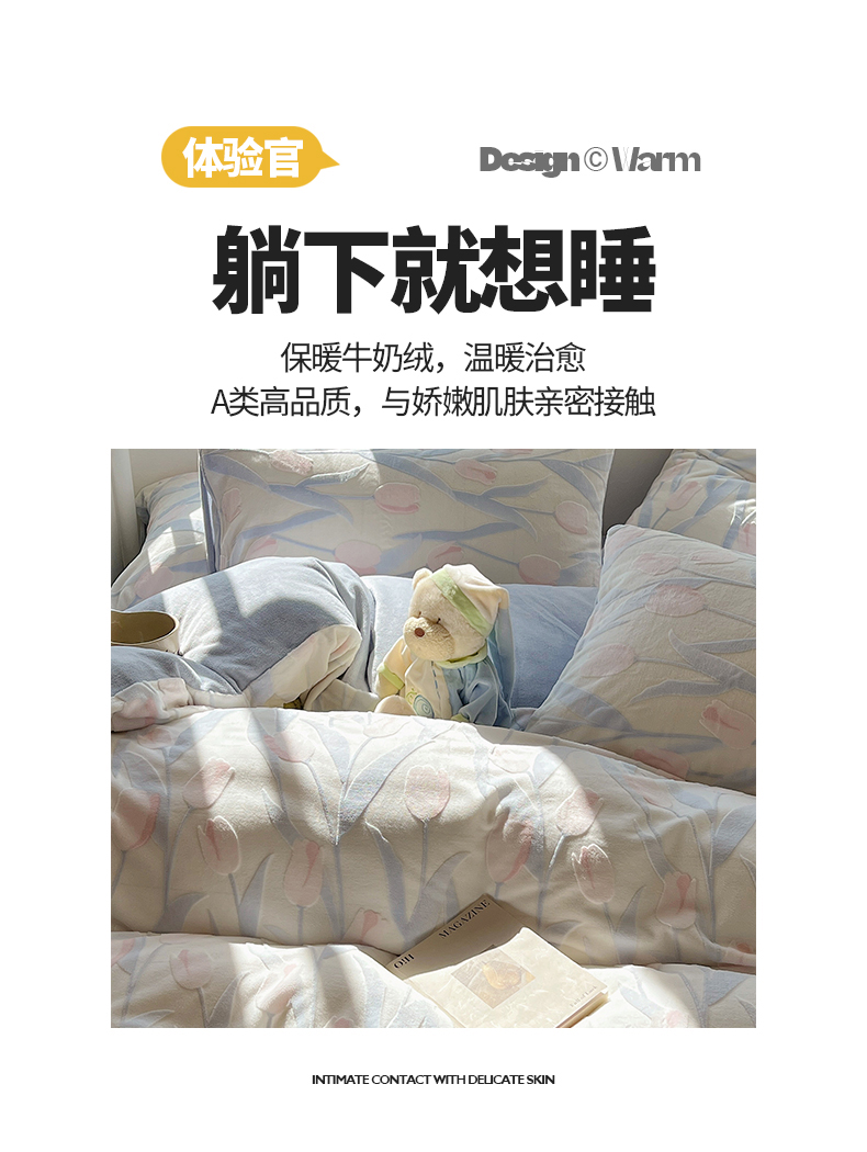 桃子家居 2023新款A类高克重230克3D立体雕花烂花提花着色郁金香少女花边款简单款牛奶绒四件套 绒烂花-蓝粉郁金香