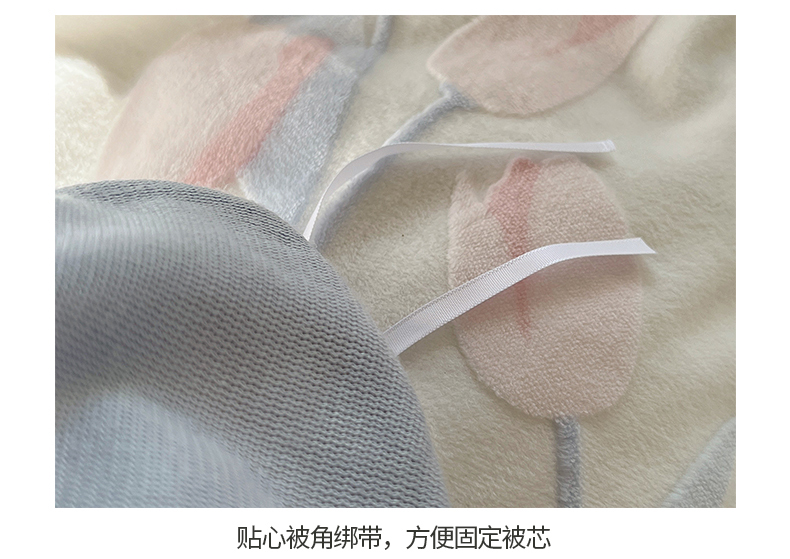 商品名称:桃子家居 2023新款A类高克重230克3D立体雕花烂花提花着色郁金香少女花边款简单款牛奶绒四件套 绒烂花-蓝粉郁金香