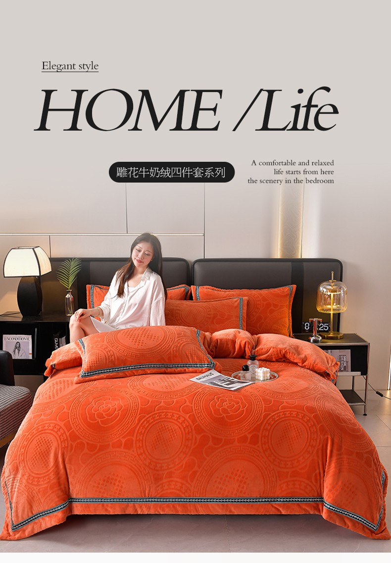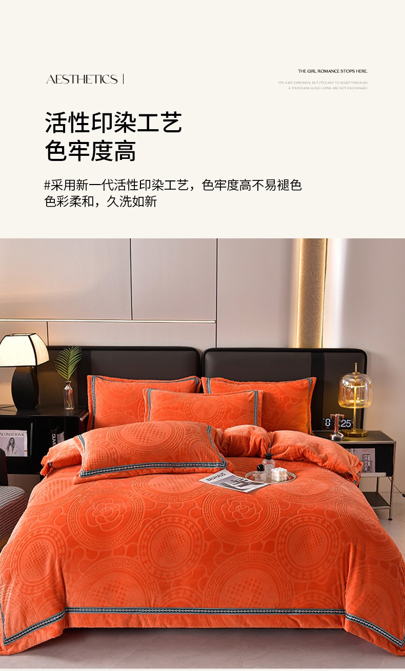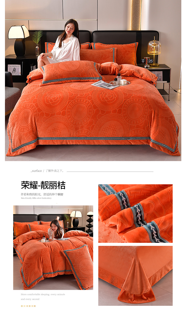 商品名称:绒耀 2025新款高克重雕花绒四件套 荣耀-靓丽桔