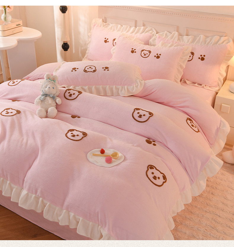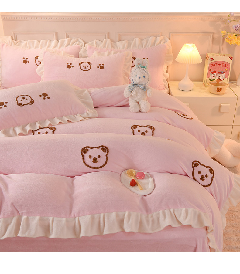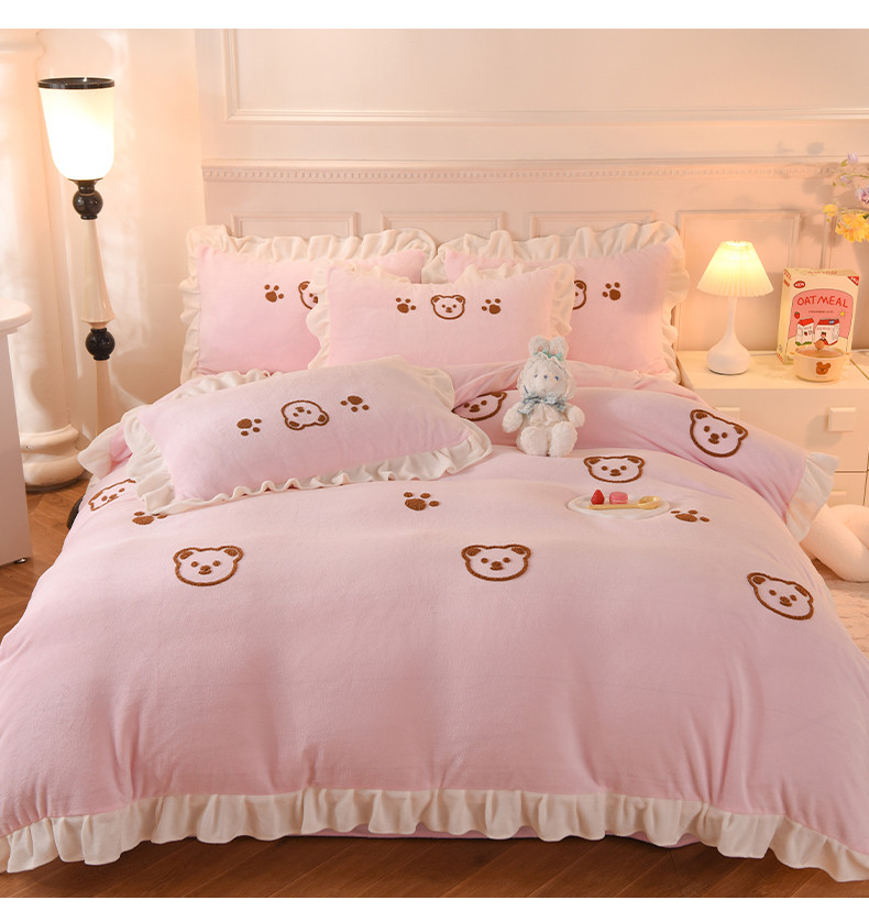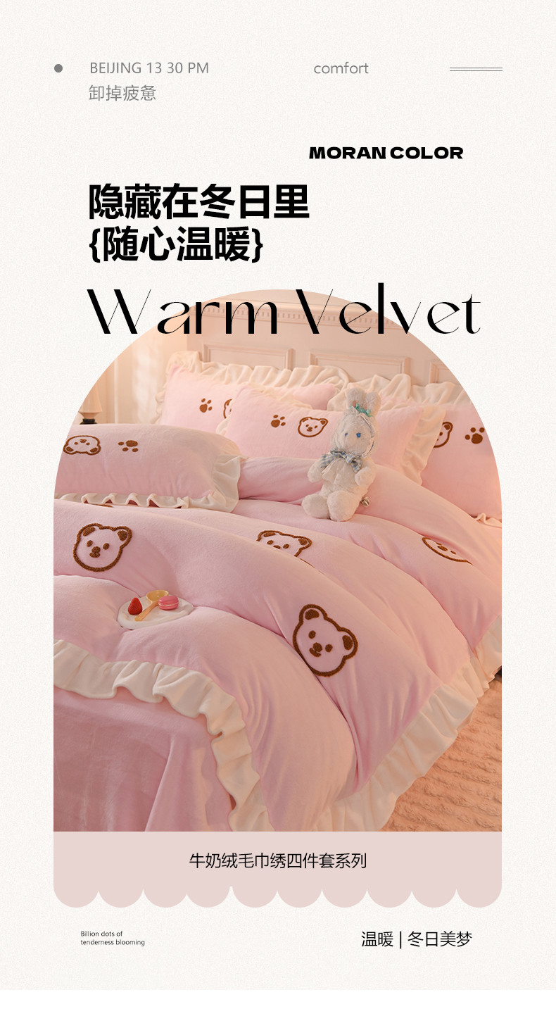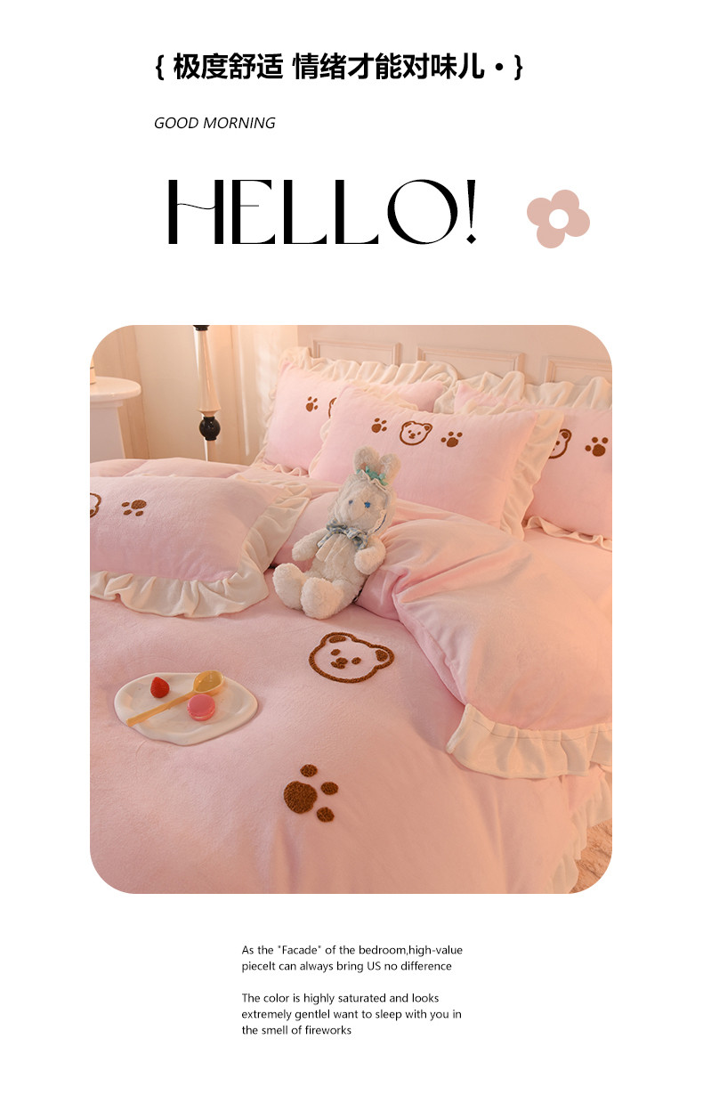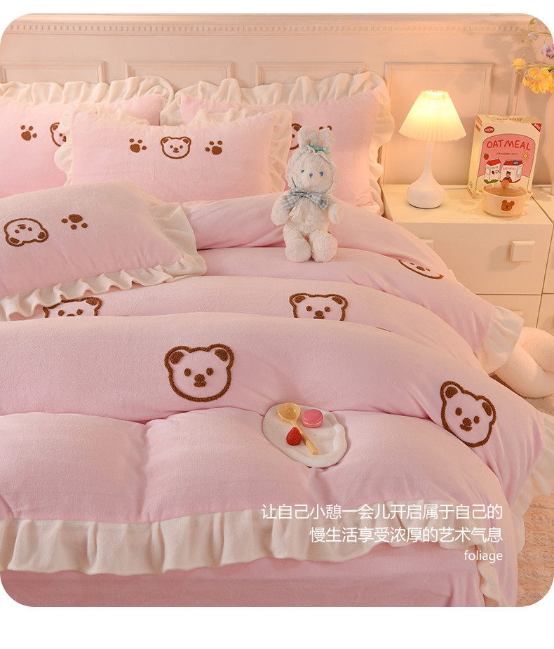 商品名称:菲儿家纺 2023新款牛奶绒毛巾绣四件套 哇塞小熊-浅粉
