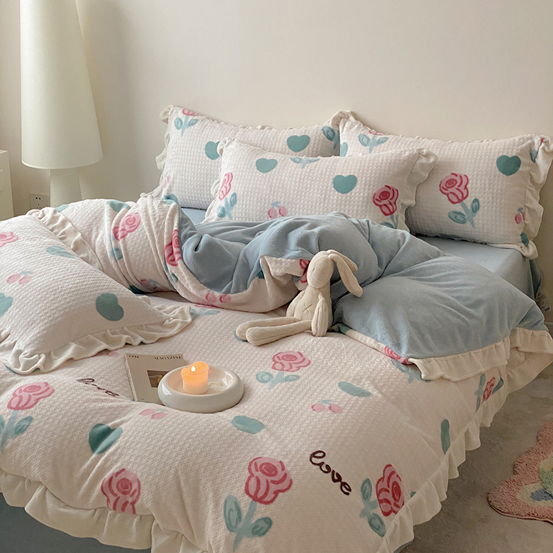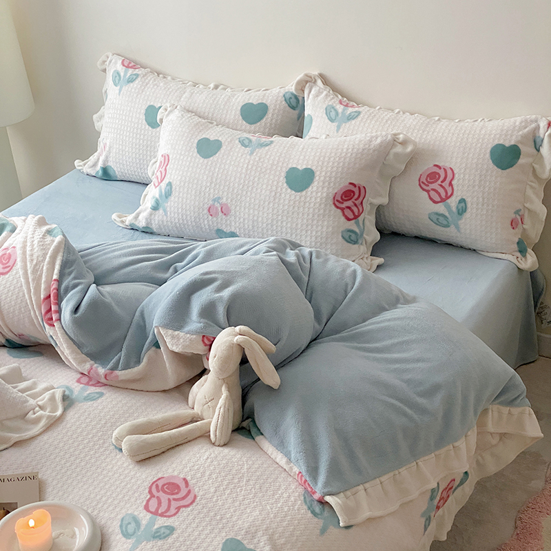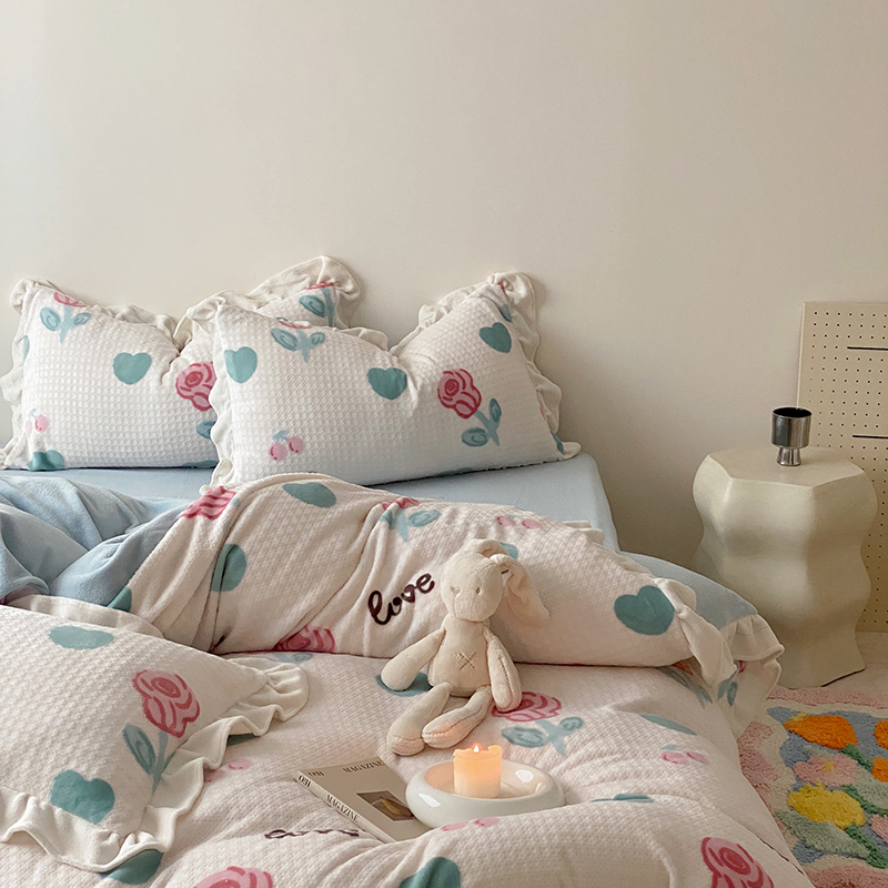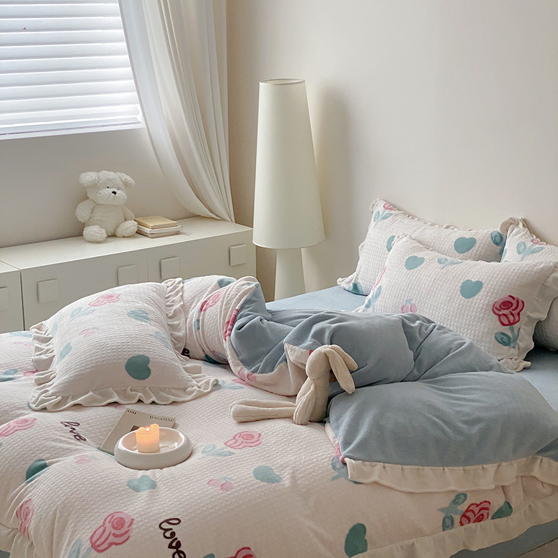 潘朵拉家纺 2023新款雕花韩式华夫格花边牛奶绒四件套 南梦花园