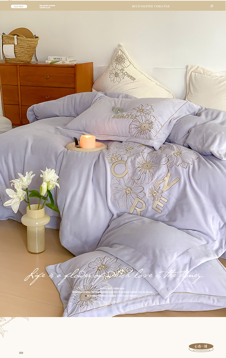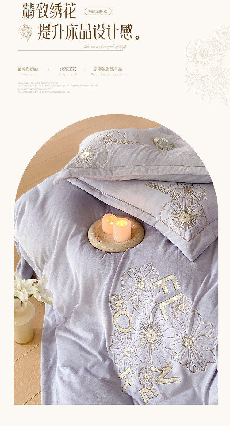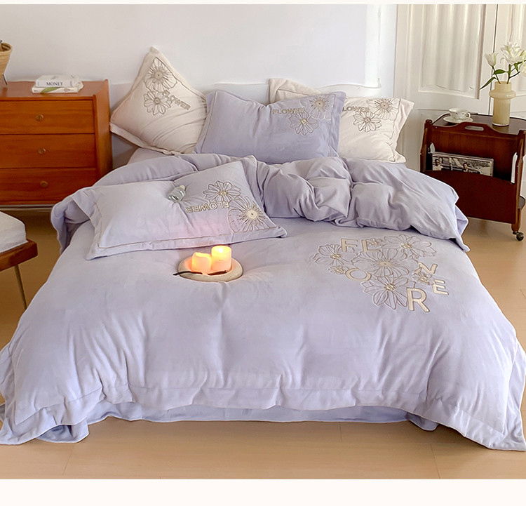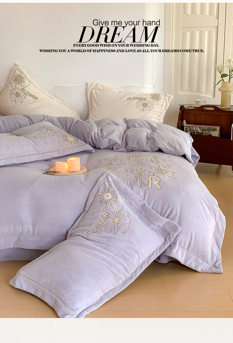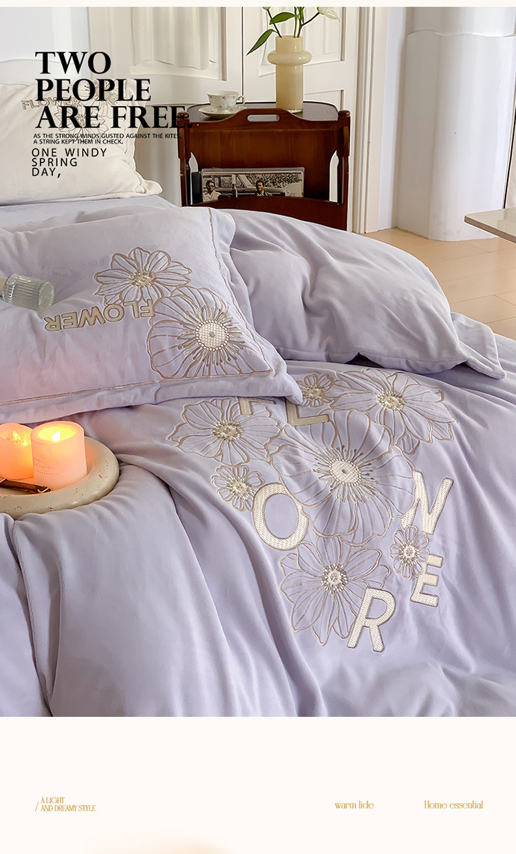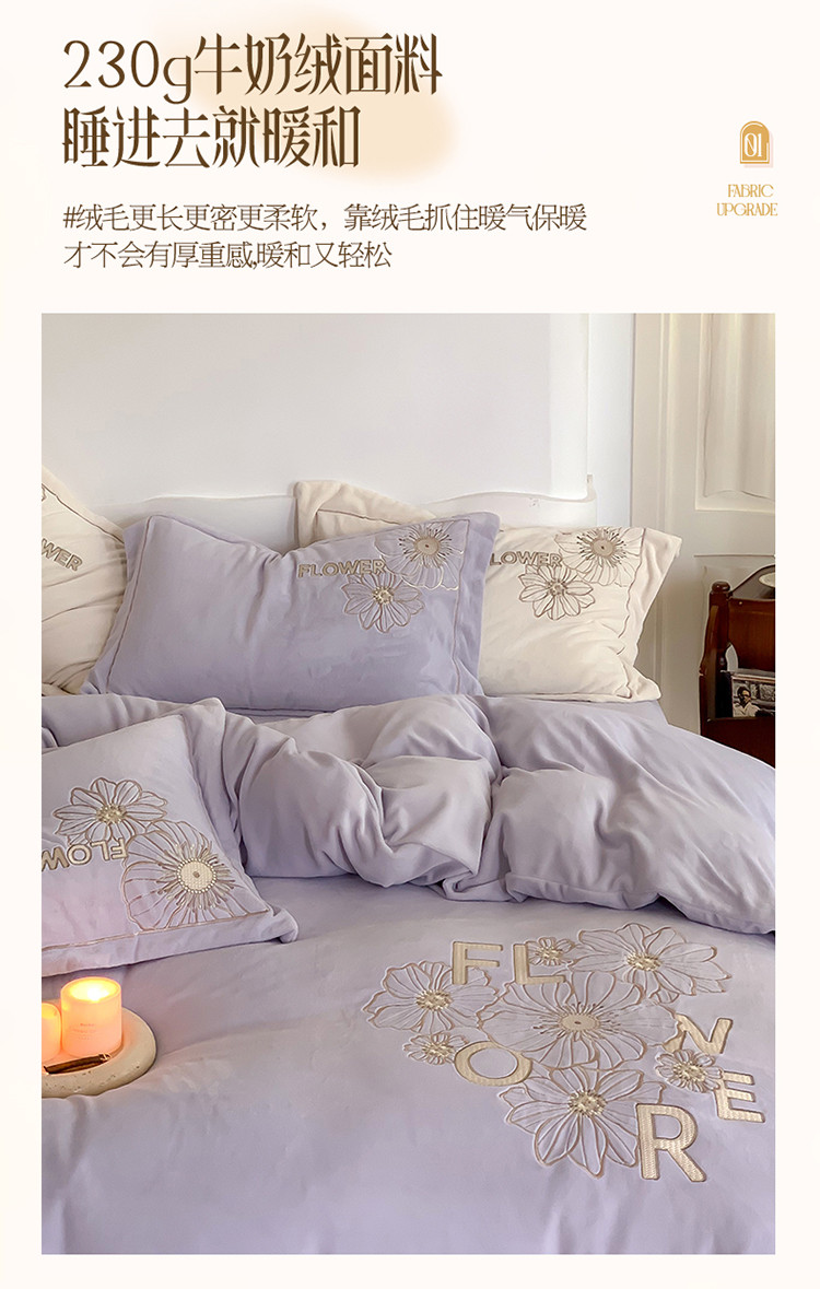 名品优仓 2023新款高克重230克牛奶绒绣花款四件套-伊莲娜 伊莲娜-风铃紫