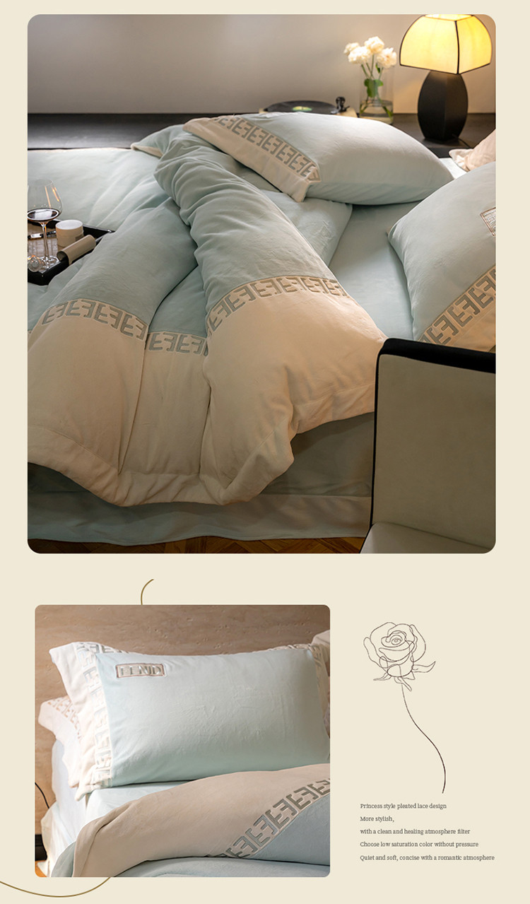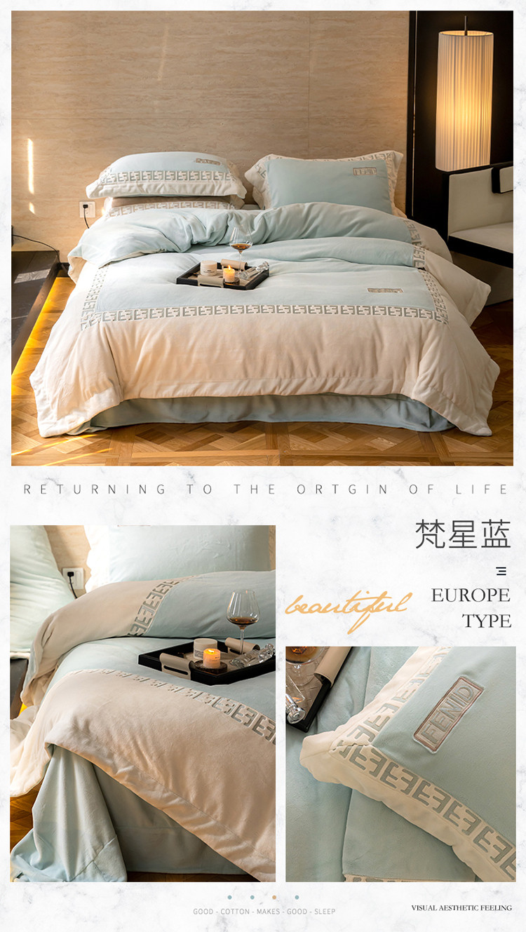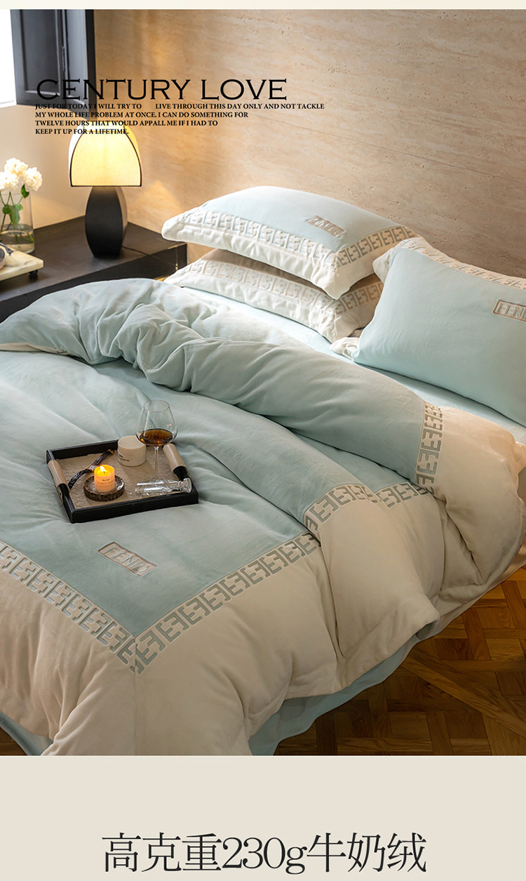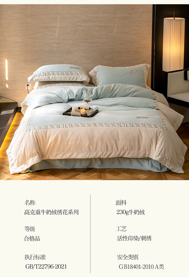 名品优仓 2023新款高克重230克牛奶绒绣花款四件套-玛丽 玛丽-梵星蓝