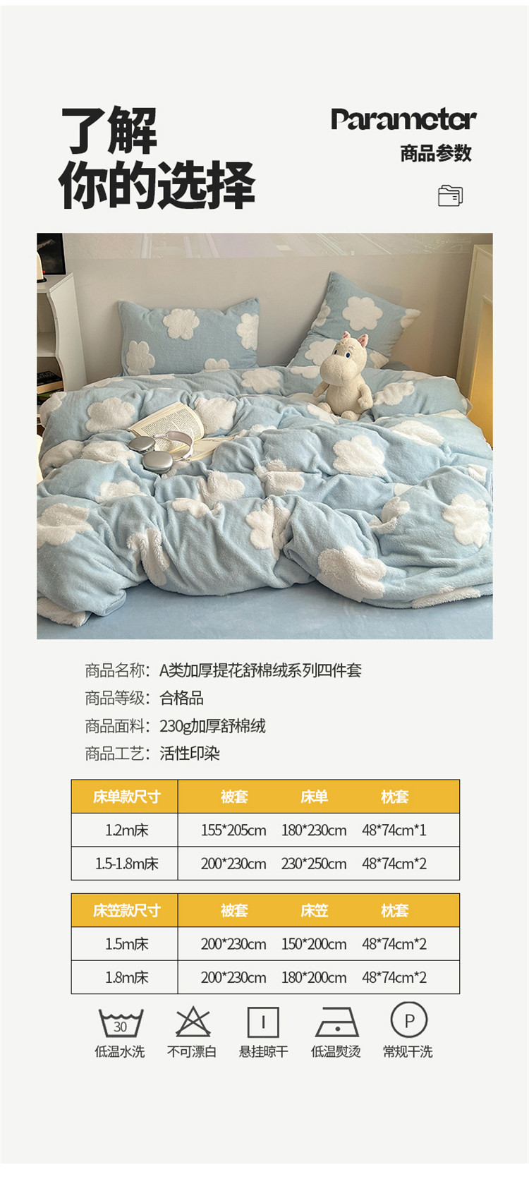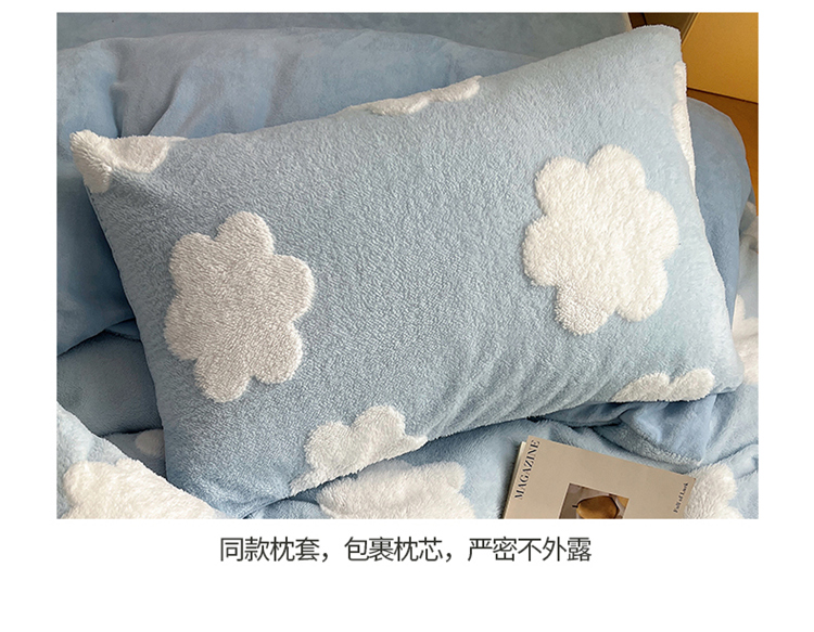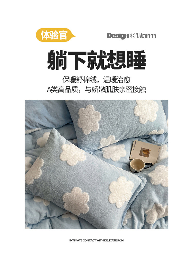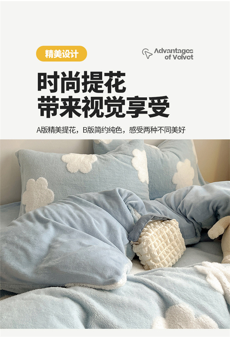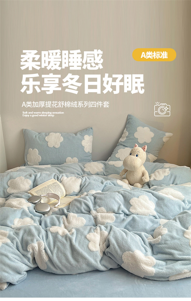商品名称:桃子 2023新款A类加厚色纱舒舒绒提花蝴蝶结四件套 花朵蓝