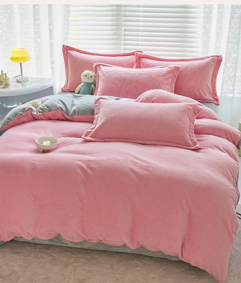 慕晨 2023新款纯色牛奶绒双拼四件套 奶油粉+浅灰