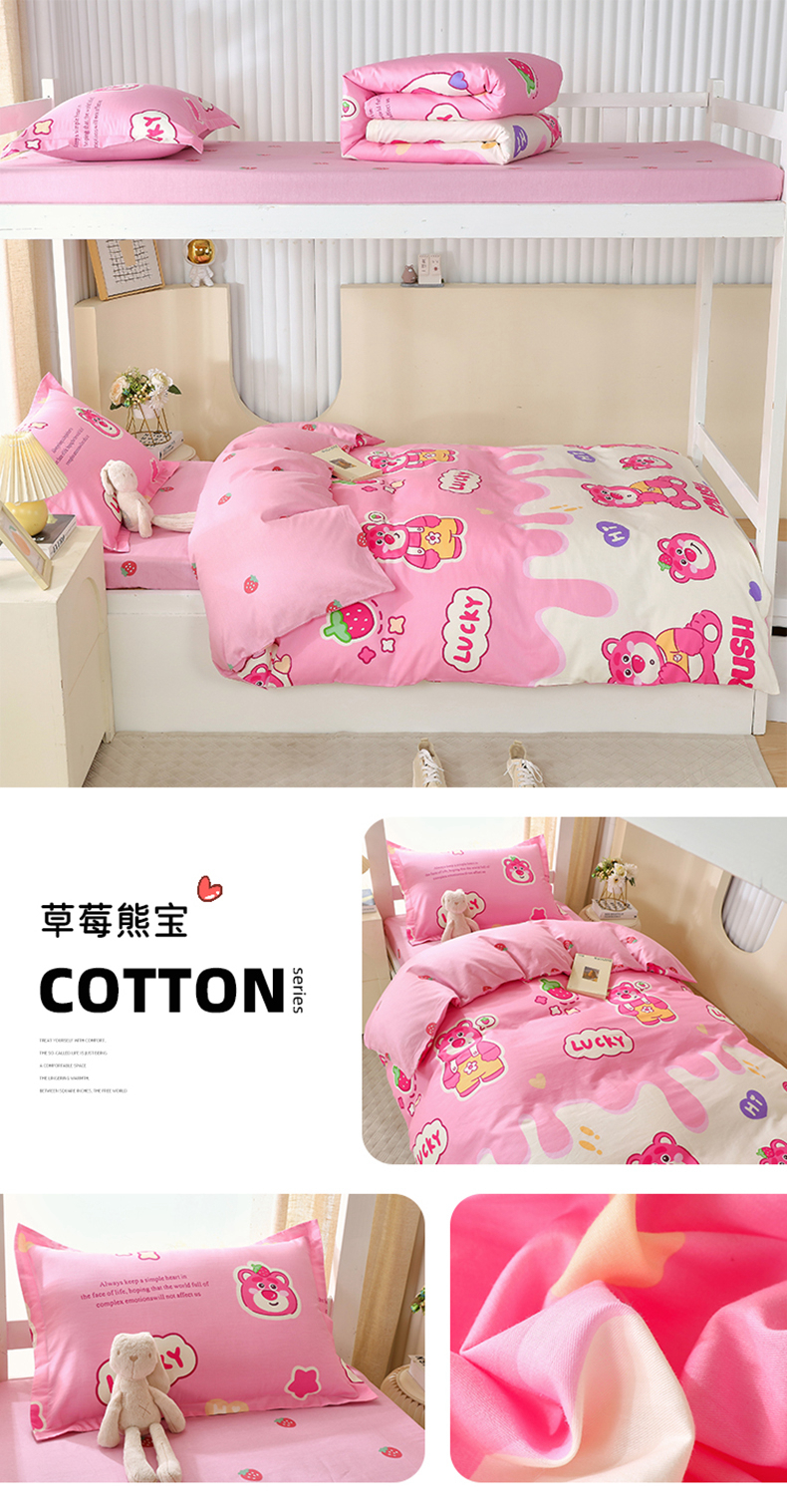 商品名称:拾物记 2024新款A类喷气全棉12868卡通印花学生三件套 草莓熊宝
