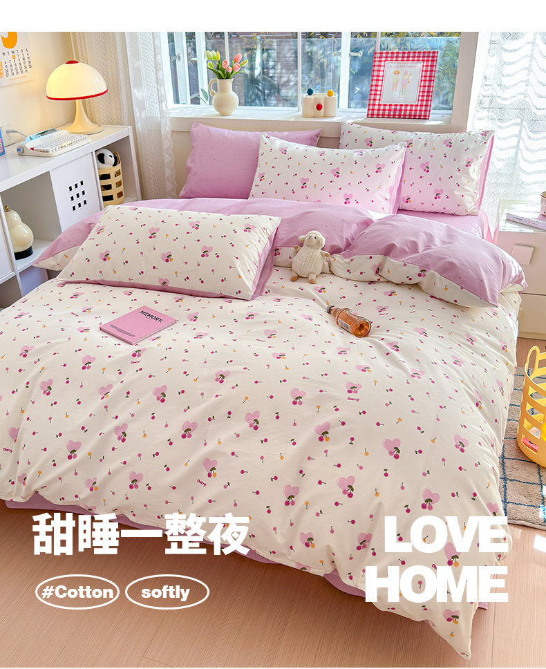 清雅福 2024新款全棉13372小清新活性印花四件套 爱心樱桃