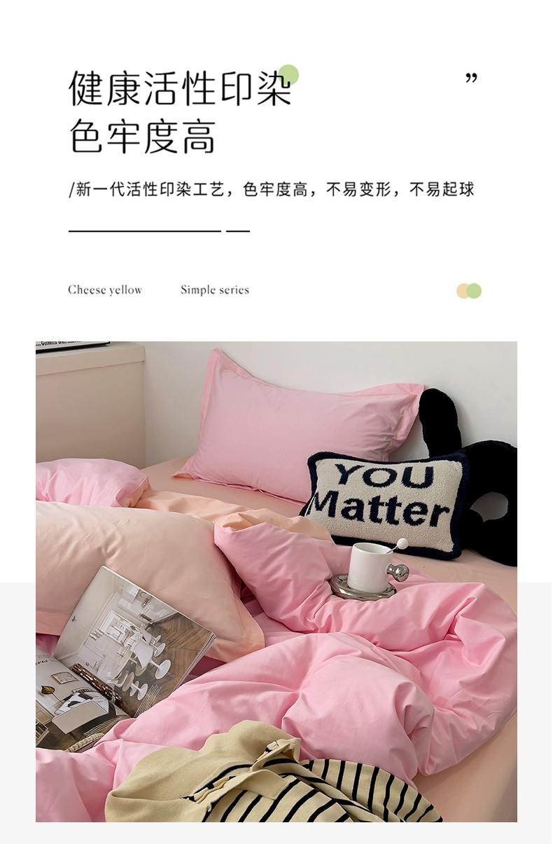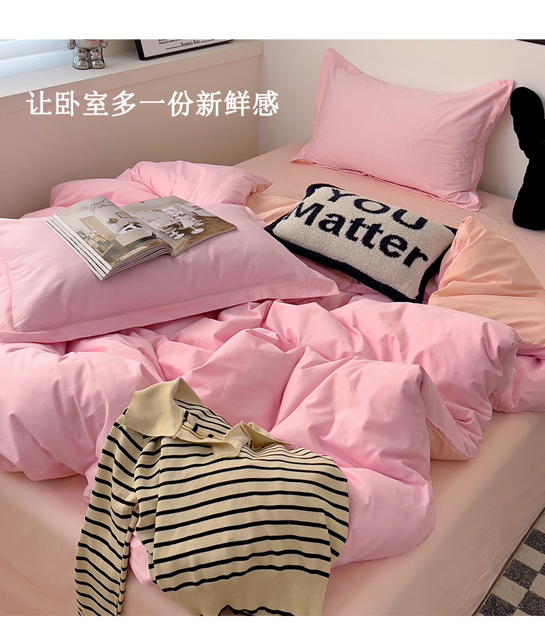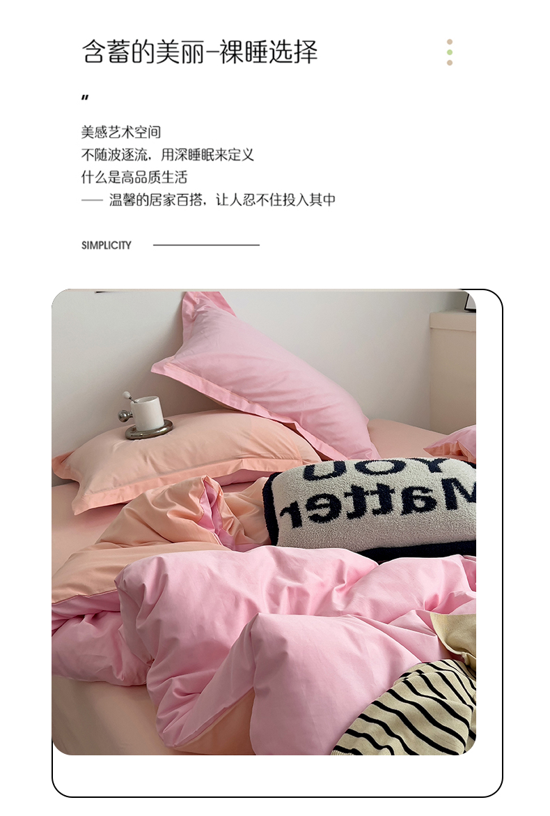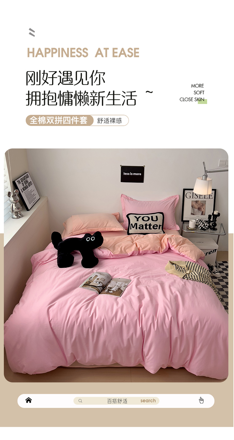 当前位置: 91家纺网 > 商品网购 > 床品套件 > 四件套 > 全棉普通四件套 > 恩泽家纺 2024新款全棉13372纯色双拼系列四件套 粉色+玉色