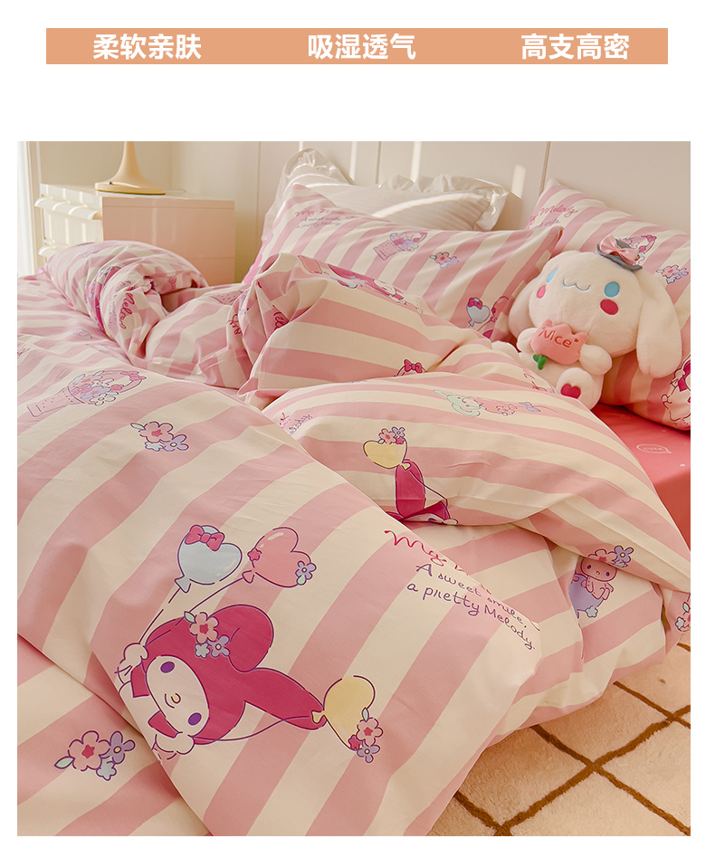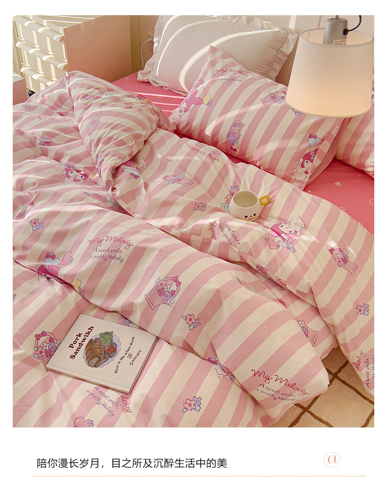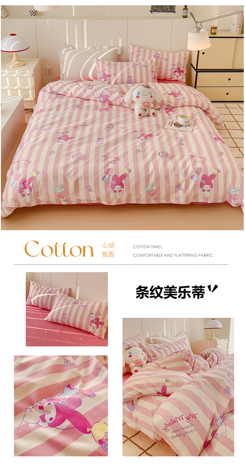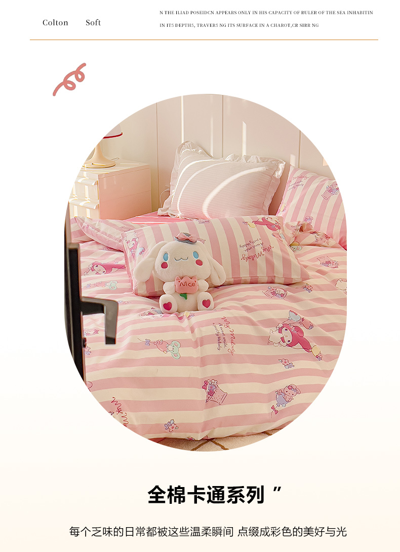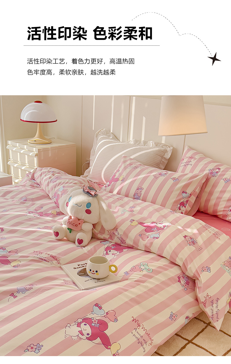 当前位置: 91家纺网 > 商品网购 > 床品套件 > 四件套 > 全棉普通四件套 > 感遇家纺 2024春夏新品全棉卡通印花四件套-第二批 条纹美乐蒂