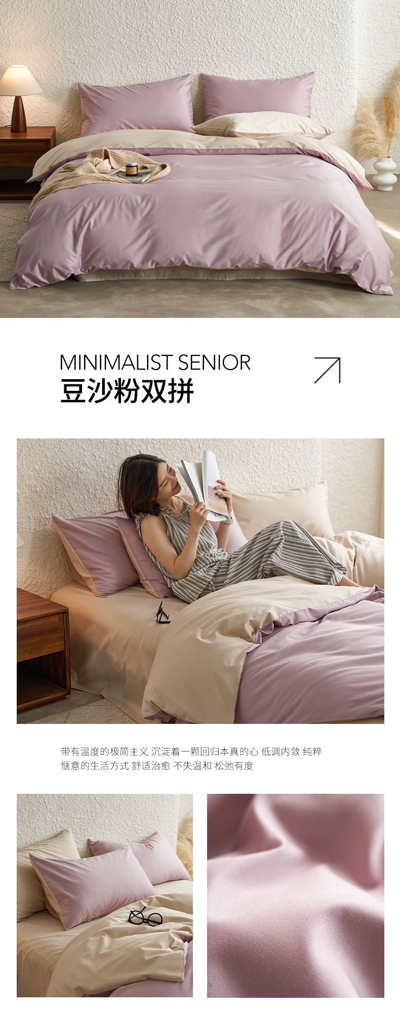 千朵森 2024新款全棉贡缎双拼纯色四件套 暗香-豆沙粉双拼