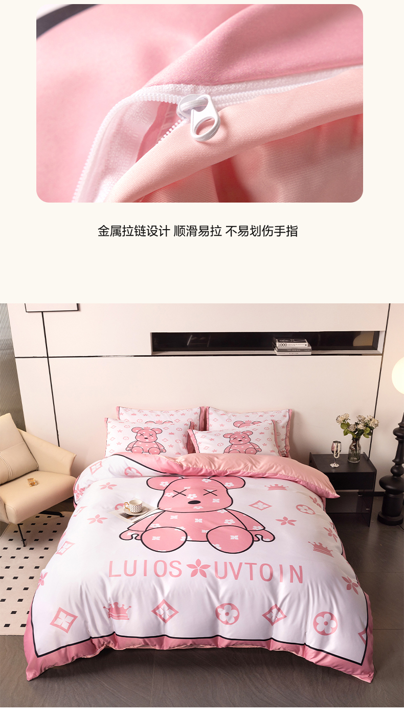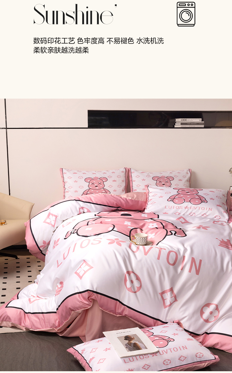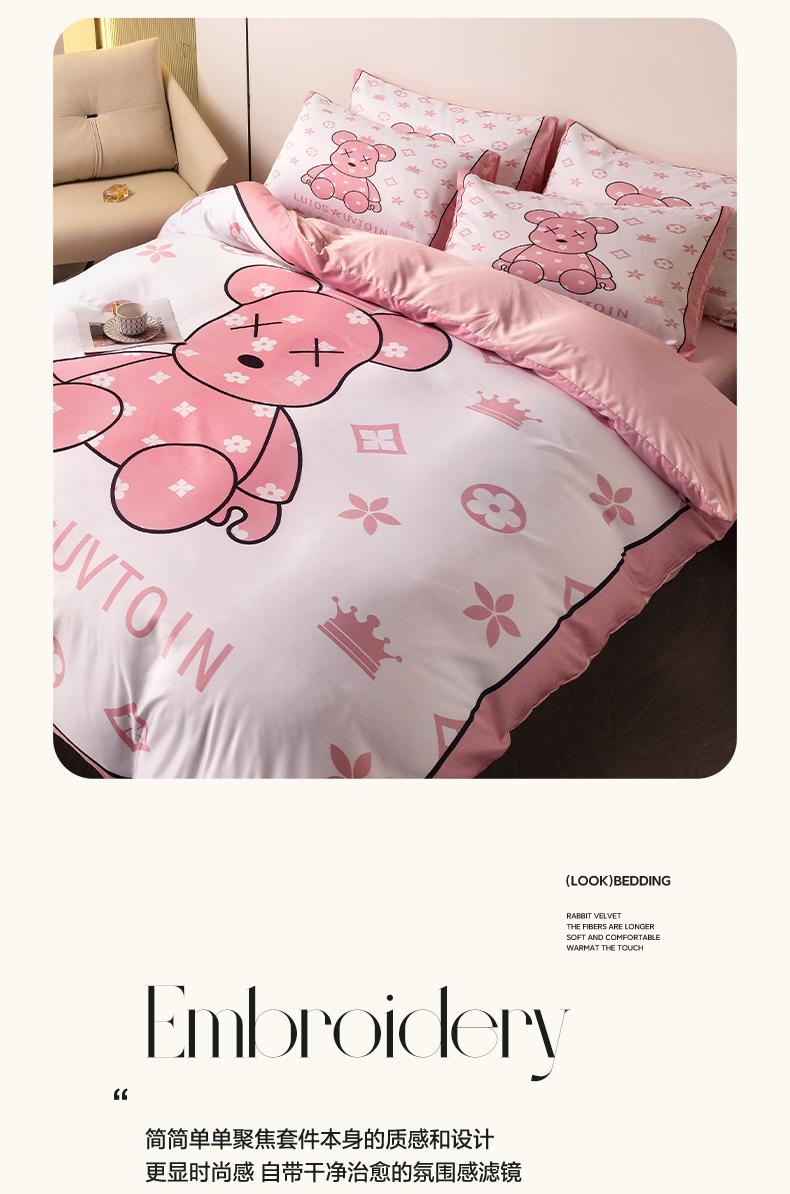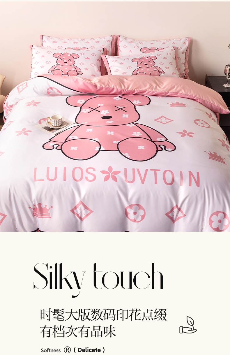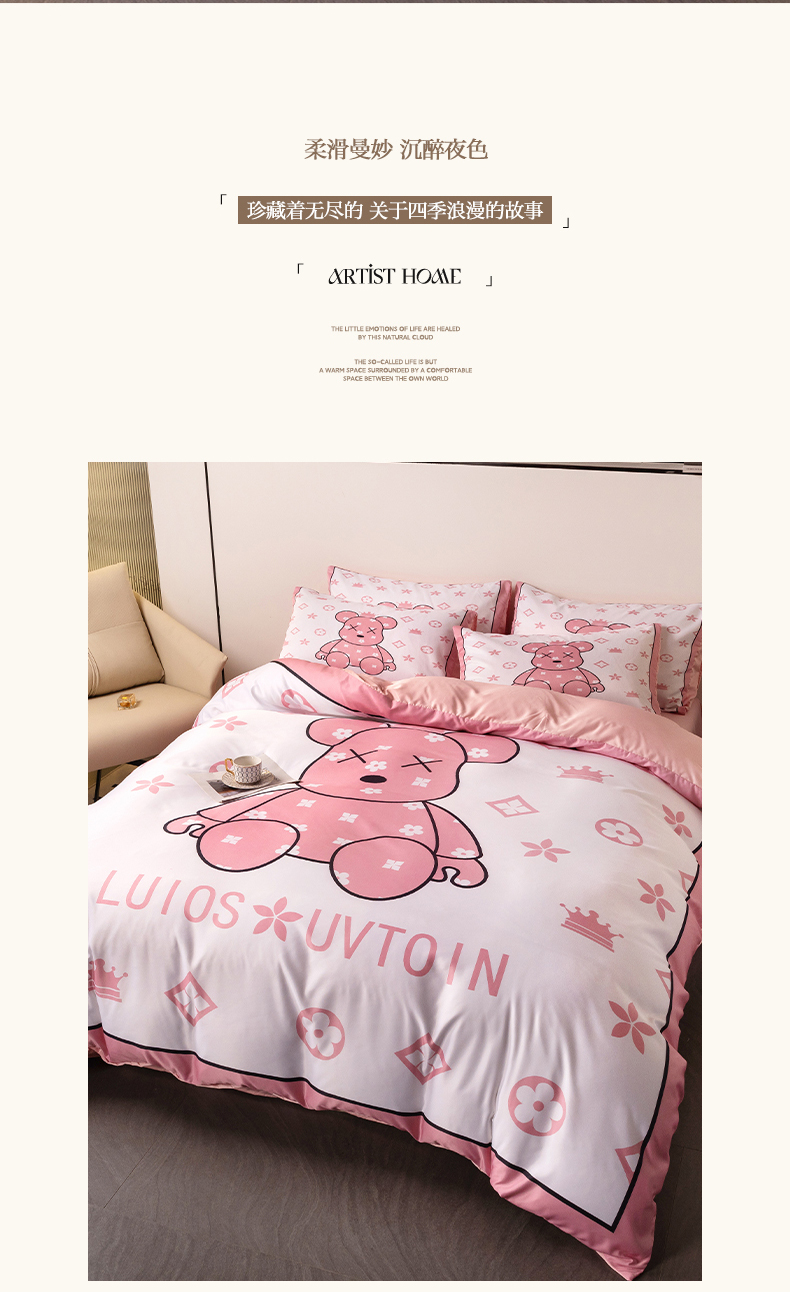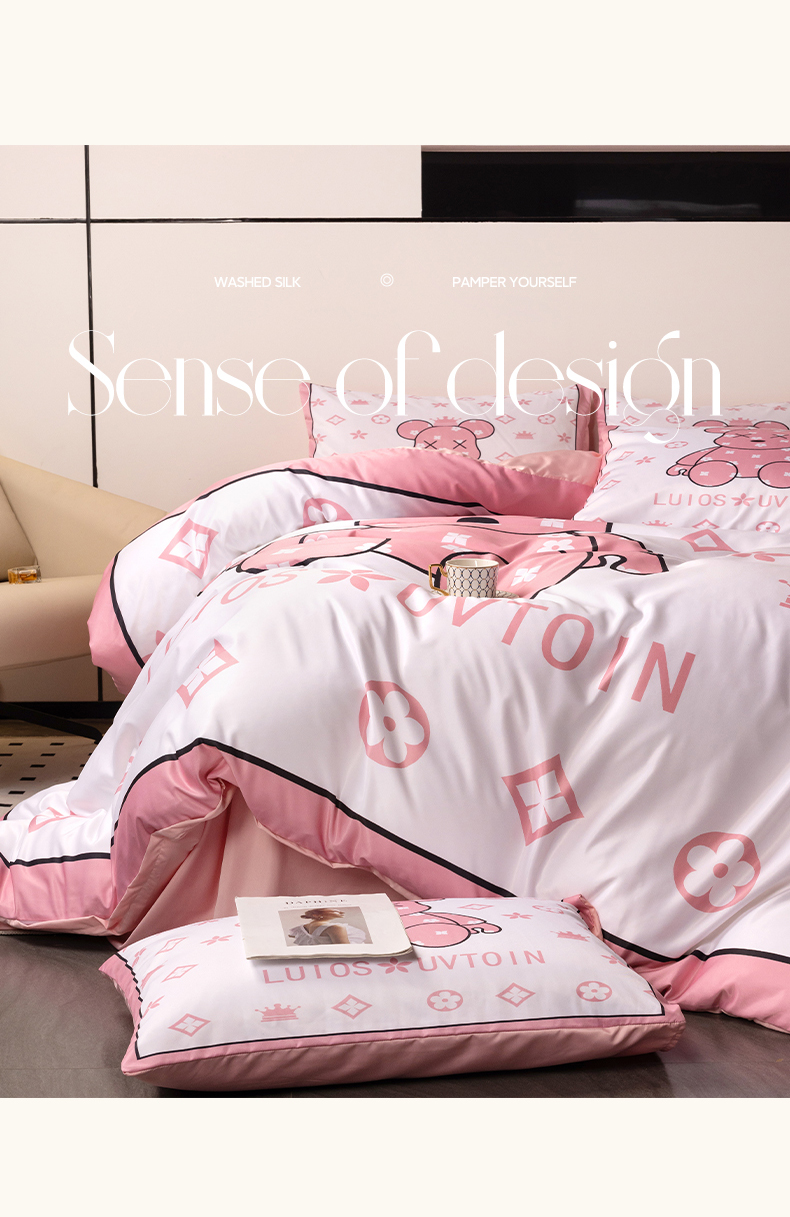 当前位置: 91家纺网 > 商品网购 > 床品套件 > 四件套 > 水洗真丝四件套 > 色鬼布艺 2024新款博主风水洗真丝四件套大牌风四件套 熊仔-粉