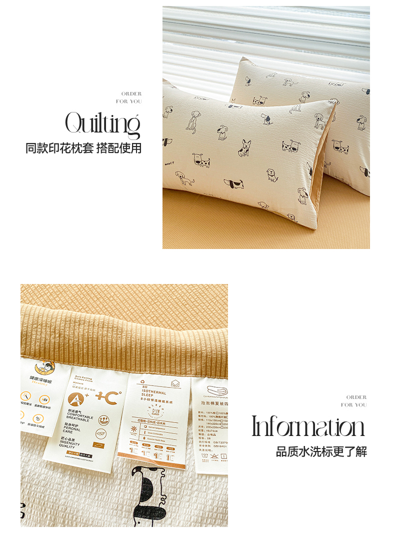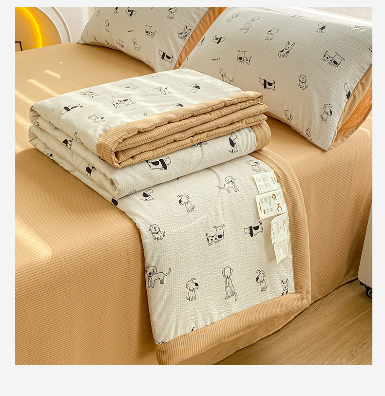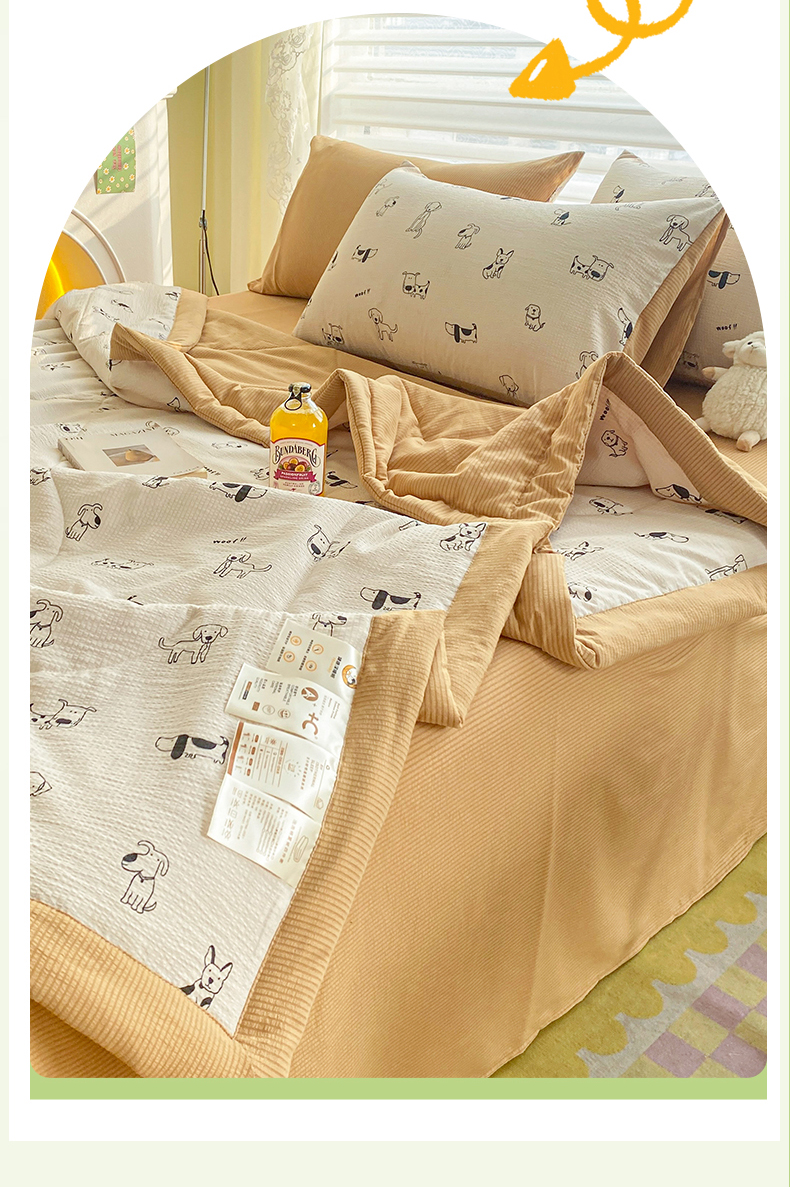 当前位置: 91家纺网 > 商品网购 > 被子 > 夏被 > 可思家纺 2024新款A类泡泡纱夏被四件套 狗狗派对
