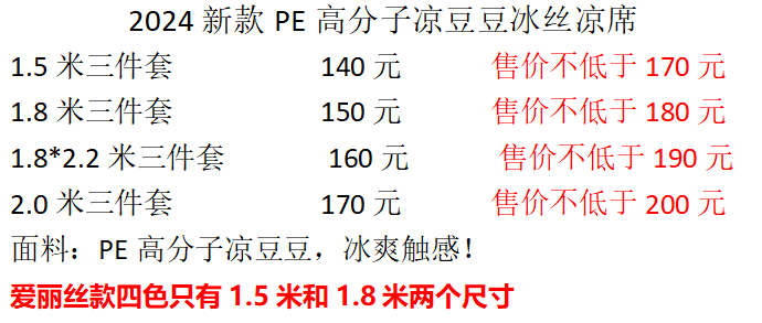 [{"spec_id":196208213,"price":"110.00","is_check_weight":0,"weight":"2.200","number":"85109s2812203g47217","goods_sku":"85109s2812203g47217","old_price":"280.00","sale_price":"0.00","point_price":0,"store_price":"0.00","salenum":0,"spec":[{"sp_id":11,"sp_name":"\u989c\u8272\u5206\u7c7b","sp_format":2,"sp_value_id":47,"sp_value_name":"\u7231\u4e3d\u4e1d-\u7c89","sp_value_image":{"id":999,"path":"https:\/\/img3.91jf.com\/ghelp\/2024\/20240411\/39220c20-e823-473a-92c9-0a0bd3e7906720240411191645856.jpg_30_30.jpg"},"sp_value_video":{"id":0,"img":"","path":"","time":0,"download_num":0,"play_num":0},"sp_sort":27},{"sp_id":24,"sp_name":"\u5e8a\u5355\/\u5e8a\u7b20\u5c3a\u5bf8","sp_format":1,"sp_value_id":217,"sp_value_name":"1.5\u7c73\u4e09\u4ef6\u5957","sp_value_image":{"id":0,"path":""},"sp_value_video":{"id":0,"img":"","path":"","time":0,"download_num":0,"play_num":0},"sp_sort":9}],"storage":100},{"spec_id":196208214,"price":"120.00","is_check_weight":0,"weight":"2.400","number":"85109s2812203g47218","goods_sku":"85109s2812203g47218","old_price":"300.00","sale_price":"0.00","point_price":0,"store_price":"0.00","salenum":0,"spec":[{"sp_id":11,"sp_name":"\u989c\u8272\u5206\u7c7b","sp_format":2,"sp_value_id":47,"sp_value_name":"\u7231\u4e3d\u4e1d-\u7c89","sp_value_image":{"id":999,"path":"https:\/\/img3.91jf.com\/ghelp\/2024\/20240411\/39220c20-e823-473a-92c9-0a0bd3e7906720240411191645856.jpg_30_30.jpg"},"sp_value_video":{"id":0,"img":"","path":"","time":0,"download_num":0,"play_num":0},"sp_sort":27},{"sp_id":24,"sp_name":"\u5e8a\u5355\/\u5e8a\u7b20\u5c3a\u5bf8","sp_format":1,"sp_value_id":218,"sp_value_name":"1.8\u7c73\u4e09\u4ef6\u5957","sp_value_image":{"id":0,"path":""},"sp_value_video":{"id":0,"img":"","path":"","time":0,"download_num":0,"play_num":0},"sp_sort":10}],"storage":100},{"spec_id":196227715,"price":"130.00","is_check_weight":0,"weight":"2.400","number":"85109s2812203g47209","goods_sku":"85109s2812203g47209","old_price":"320.00","sale_price":"0.00","point_price":0,"store_price":"0.00","salenum":0,"spec":[{"sp_id":11,"sp_name":"\u989c\u8272\u5206\u7c7b","sp_format":2,"sp_value_id":47,"sp_value_name":"\u7231\u4e3d\u4e1d-\u7c89","sp_value_image":{"id":999,"path":"https:\/\/img3.91jf.com\/ghelp\/2024\/20240411\/39220c20-e823-473a-92c9-0a0bd3e7906720240411191645856.jpg_30_30.jpg"},"sp_value_video":{"id":0,"img":"","path":"","time":0,"download_num":0,"play_num":0},"sp_sort":27},{"sp_id":24,"sp_name":"\u5e8a\u5355\/\u5e8a\u7b20\u5c3a\u5bf8","sp_format":1,"sp_value_id":209,"sp_value_name":"1.8*2.2\u7c73\u4e09\u4ef6\u5957","sp_value_image":{"id":0,"path":""},"sp_value_video":{"id":0,"img":"","path":"","time":0,"download_num":0,"play_num":0},"sp_sort":1}],"storage":0},{"spec_id":196227716,"price":"140.00","is_check_weight":0,"weight":"2.600","number":"85109s2812203g47210","goods_sku":"85109s2812203g47210","old_price":"340.00","sale_price":"0.00","point_price":0,"store_price":"0.00","salenum":0,"spec":[{"sp_id":11,"sp_name":"\u989c\u8272\u5206\u7c7b","sp_format":2,"sp_value_id":47,"sp_value_name":"\u7231\u4e3d\u4e1d-\u7c89","sp_value_image":{"id":999,"path":"https:\/\/img3.91jf.com\/ghelp\/2024\/20240411\/39220c20-e823-473a-92c9-0a0bd3e7906720240411191645856.jpg_30_30.jpg"},"sp_value_video":{"id":0,"img":"","path":"","time":0,"download_num":0,"play_num":0},"sp_sort":27},{"sp_id":24,"sp_name":"\u5e8a\u5355\/\u5e8a\u7b20\u5c3a\u5bf8","sp_format":1,"sp_value_id":210,"sp_value_name":"2.0\u7c73\u4e09\u4ef6\u5957","sp_value_image":{"id":0,"path":""},"sp_value_video":{"id":0,"img":"","path":"","time":0,"download_num":0,"play_num":0},"sp_sort":2}],"storage":0}]