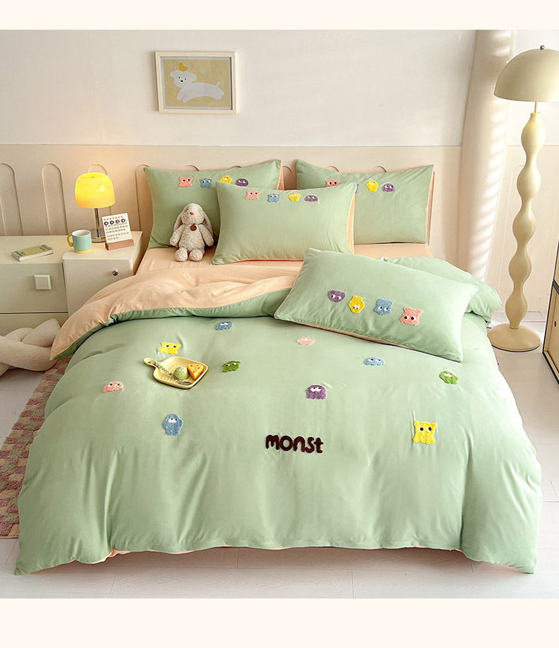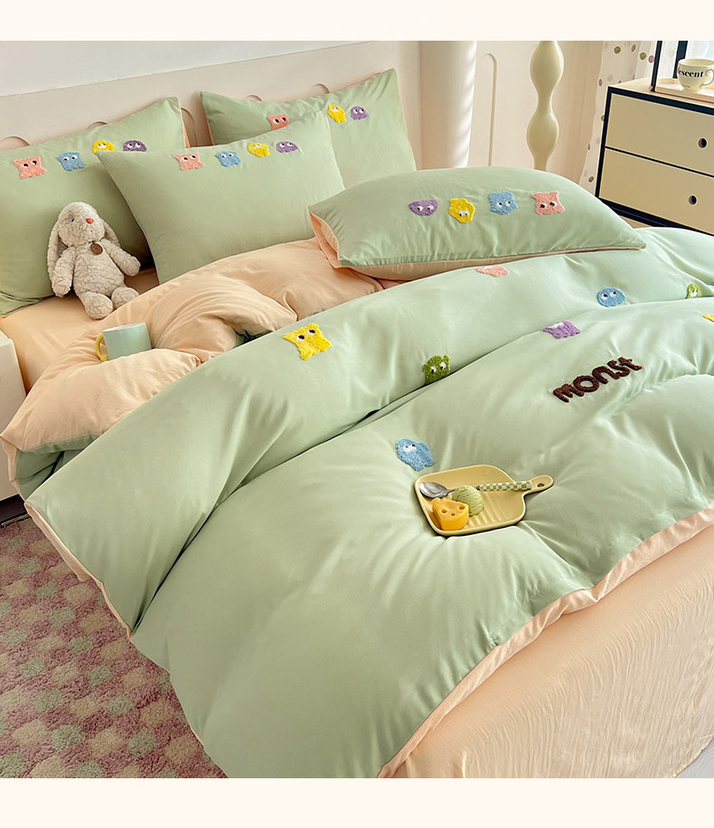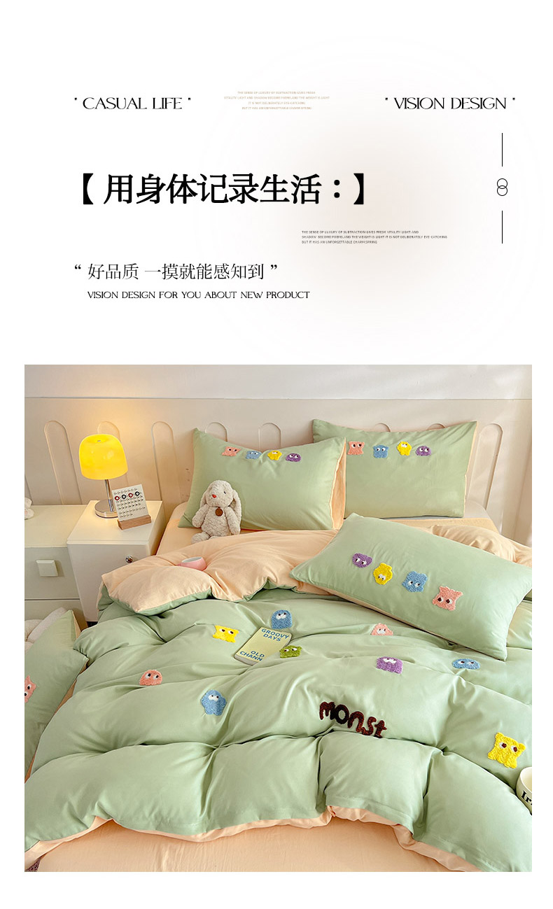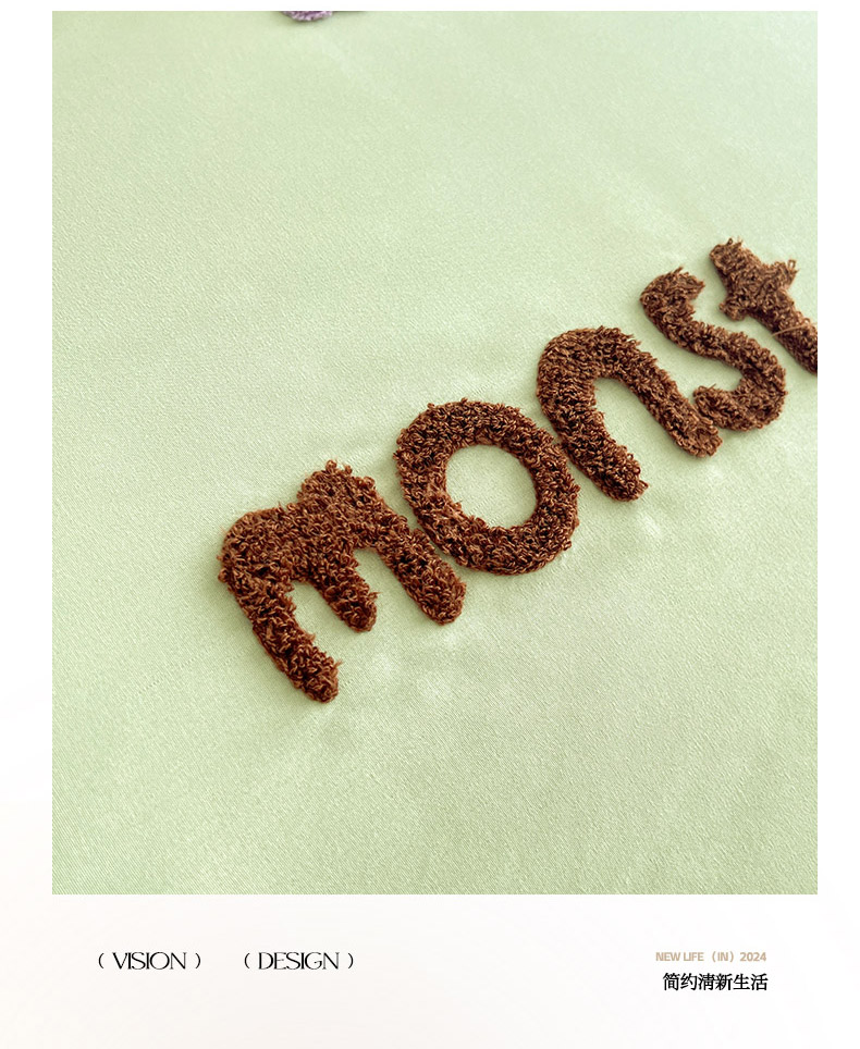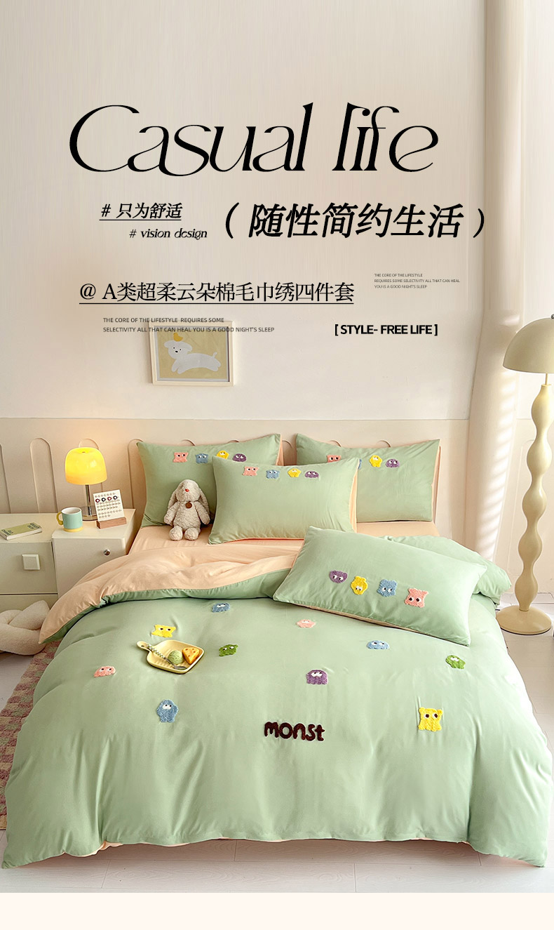 商品名称:妖妖家纺 2024新款超柔云朵棉毛巾绣四件套(小怪兽) 小怪兽浅绿浅卡其