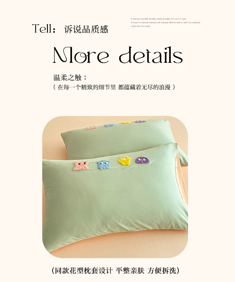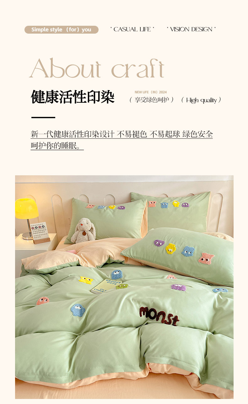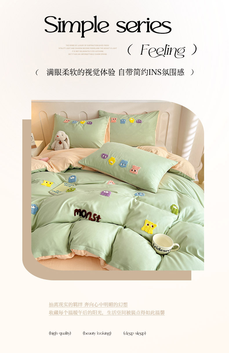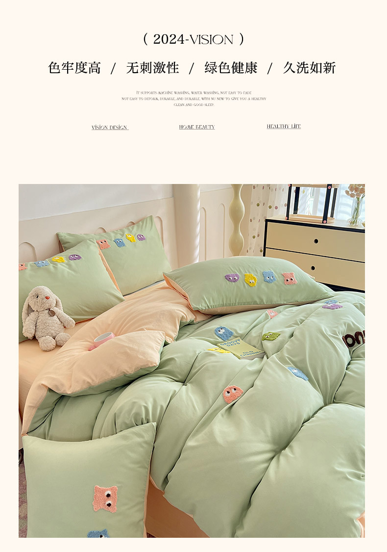 商品名称:妖妖家纺 2024新款超柔云朵棉毛巾绣四件套(小怪兽) 小怪兽浅绿浅卡其