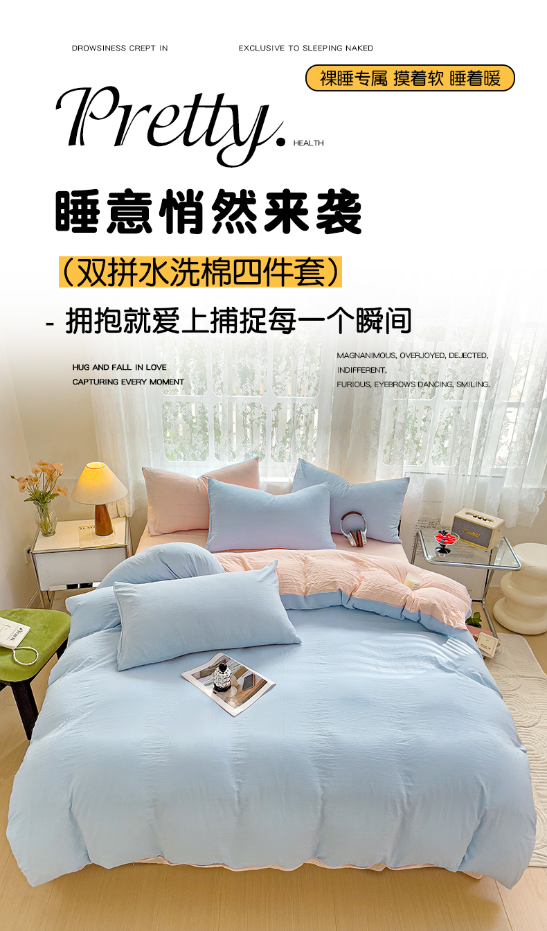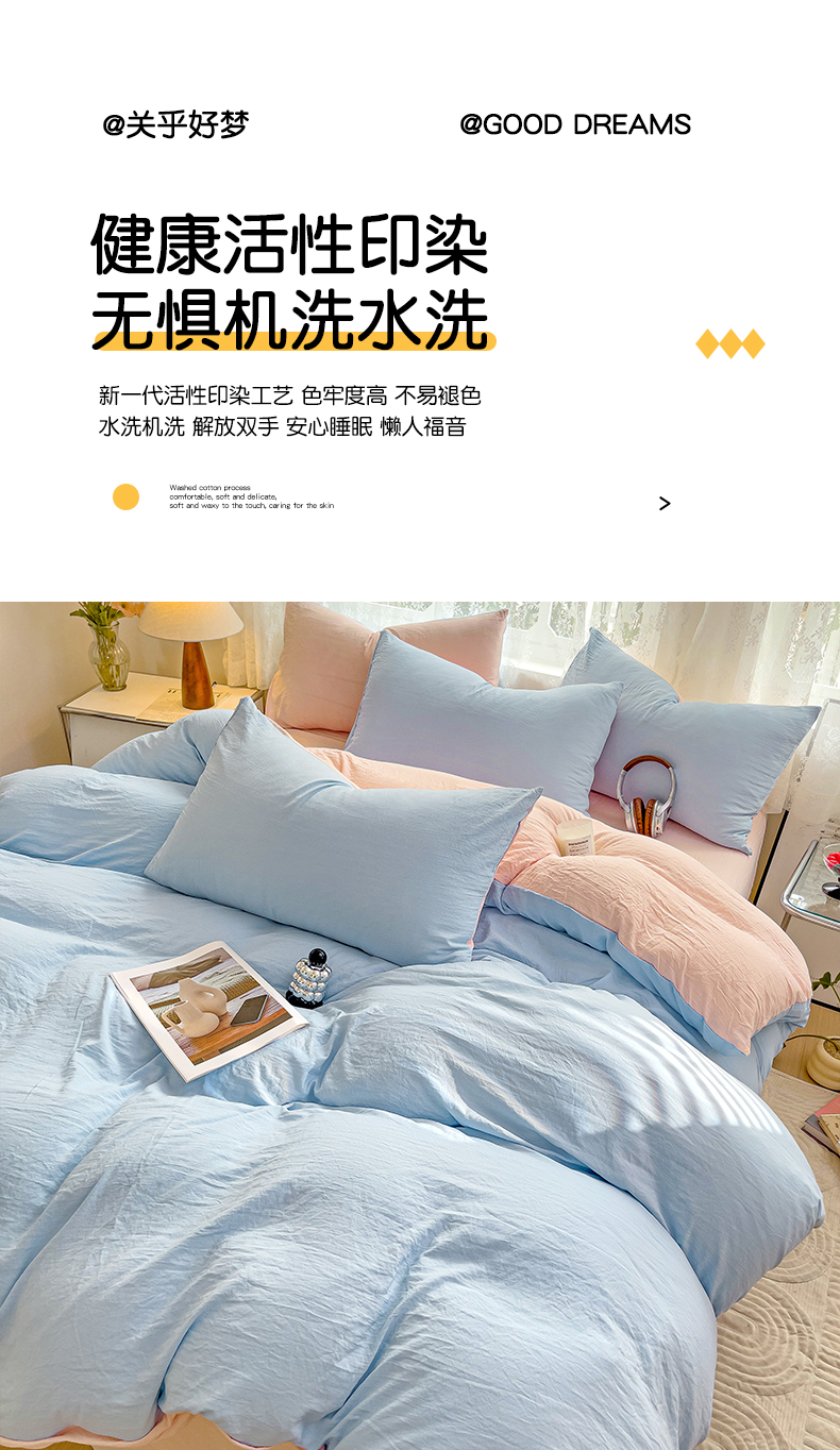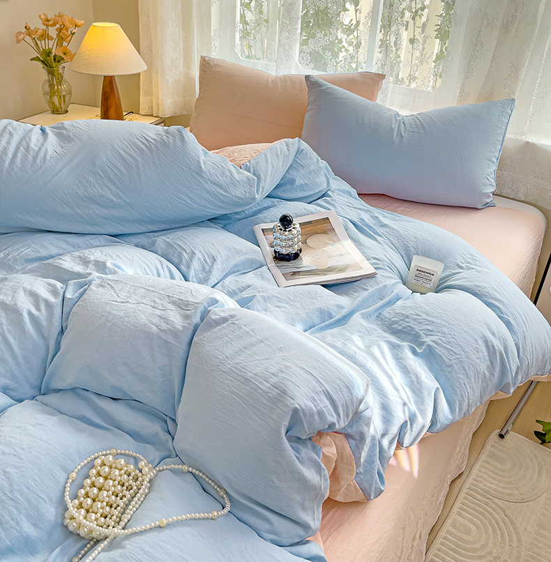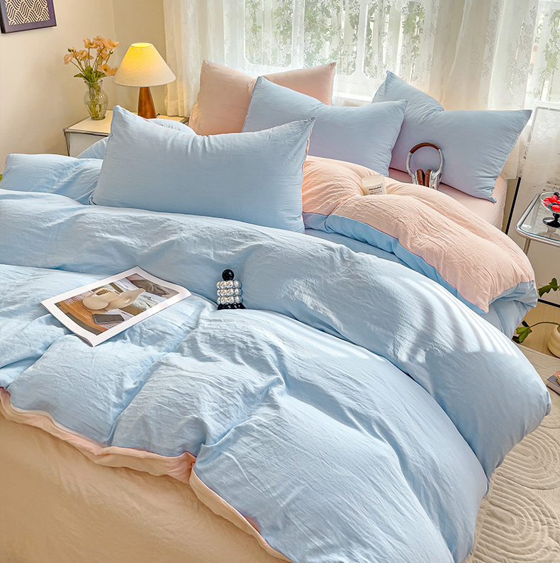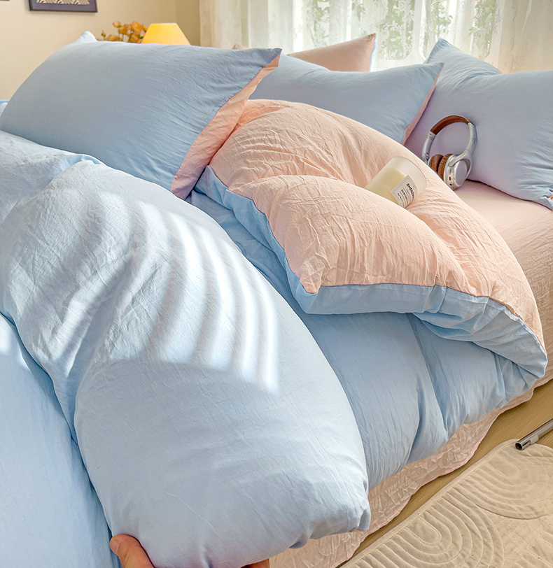 当前位置: 91家纺网 > 商品网购 > 床品套件 > 四件套 > 水洗棉四件套 > 韩巢家纺 2024新款ins风超柔褶皱亲肤水洗棉四件套 -纯色双拼系列(提供卖家秀) 水洗棉蓝粉