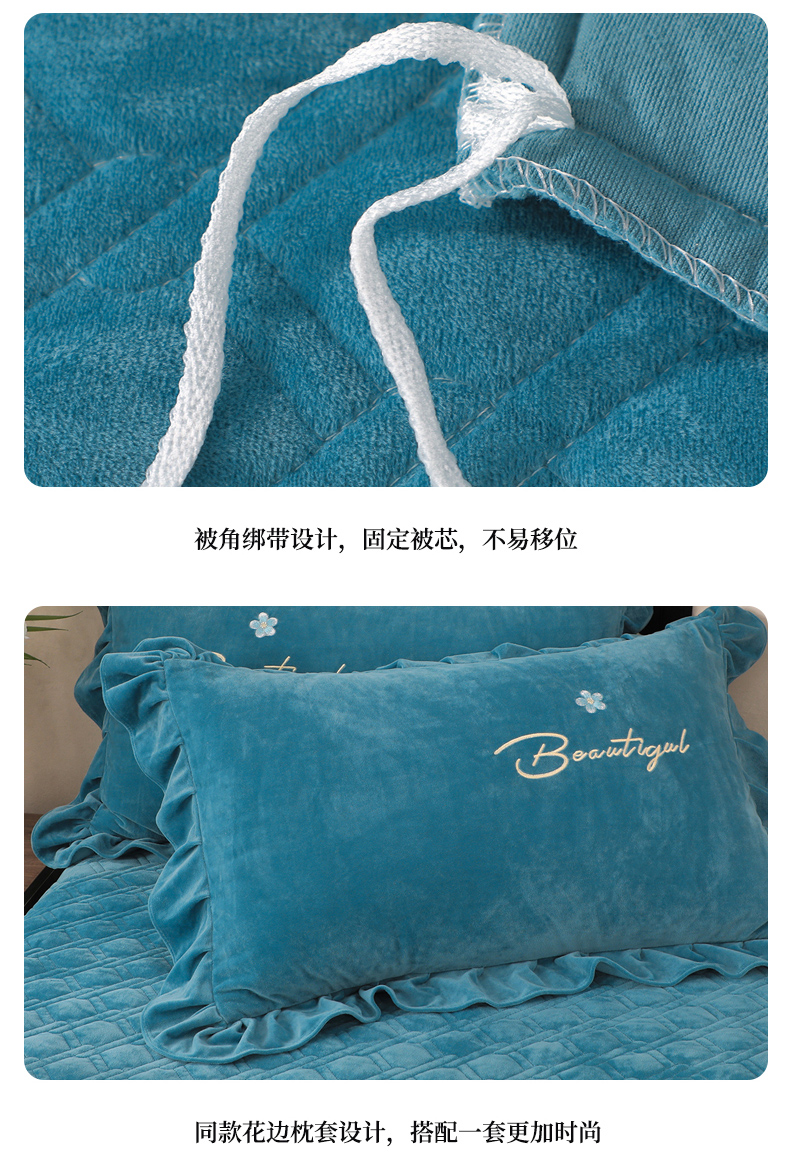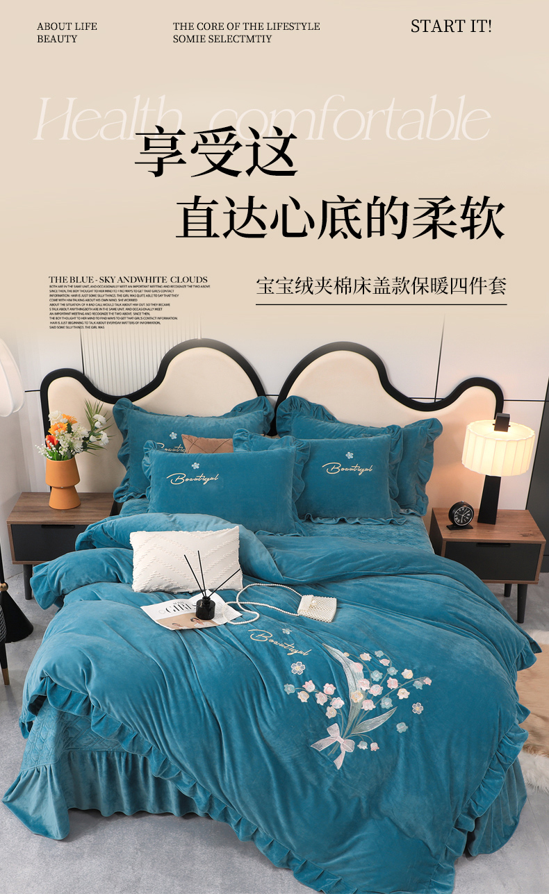 商品名称:优姿家纺 2024新品宝宝绒11斤夹棉床盖保暖四件套 铃兰花-宝石蓝
