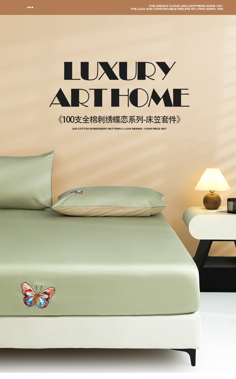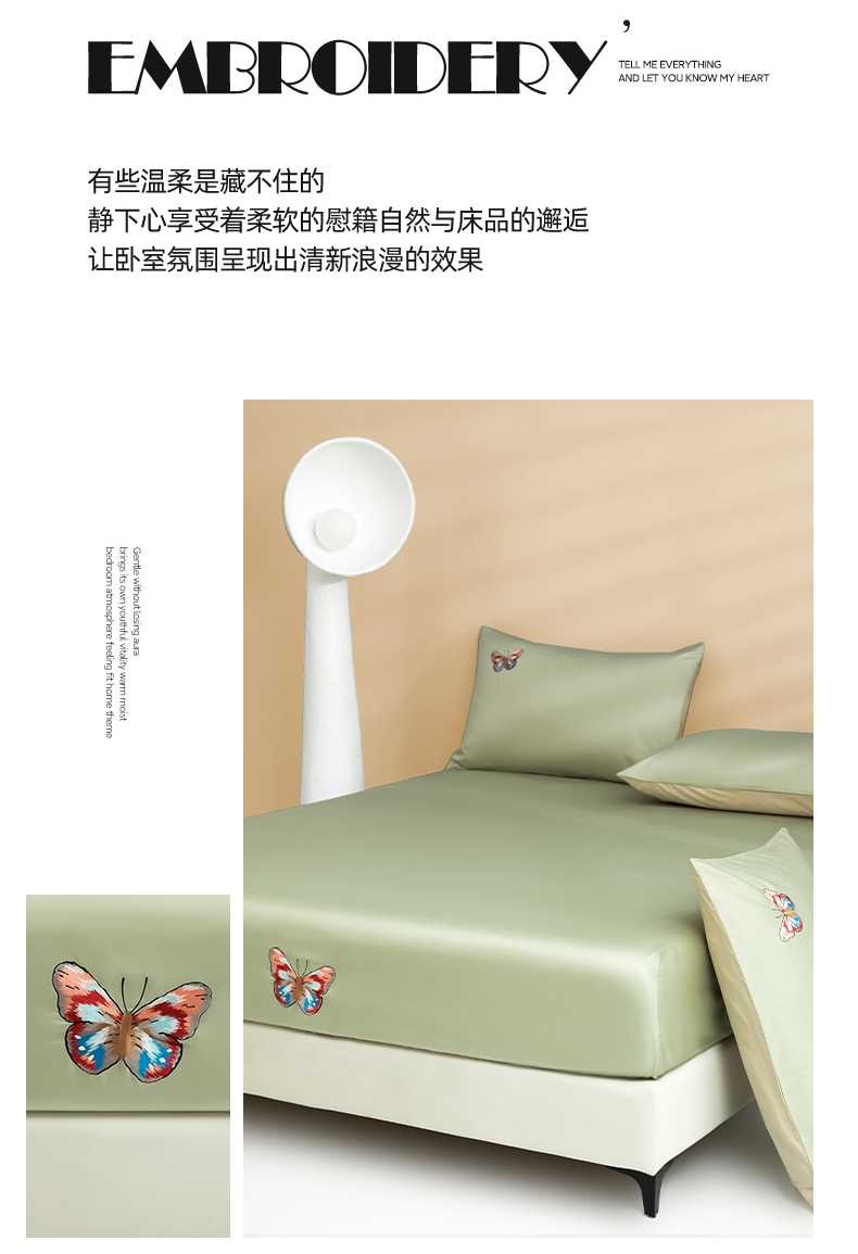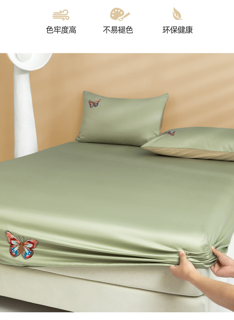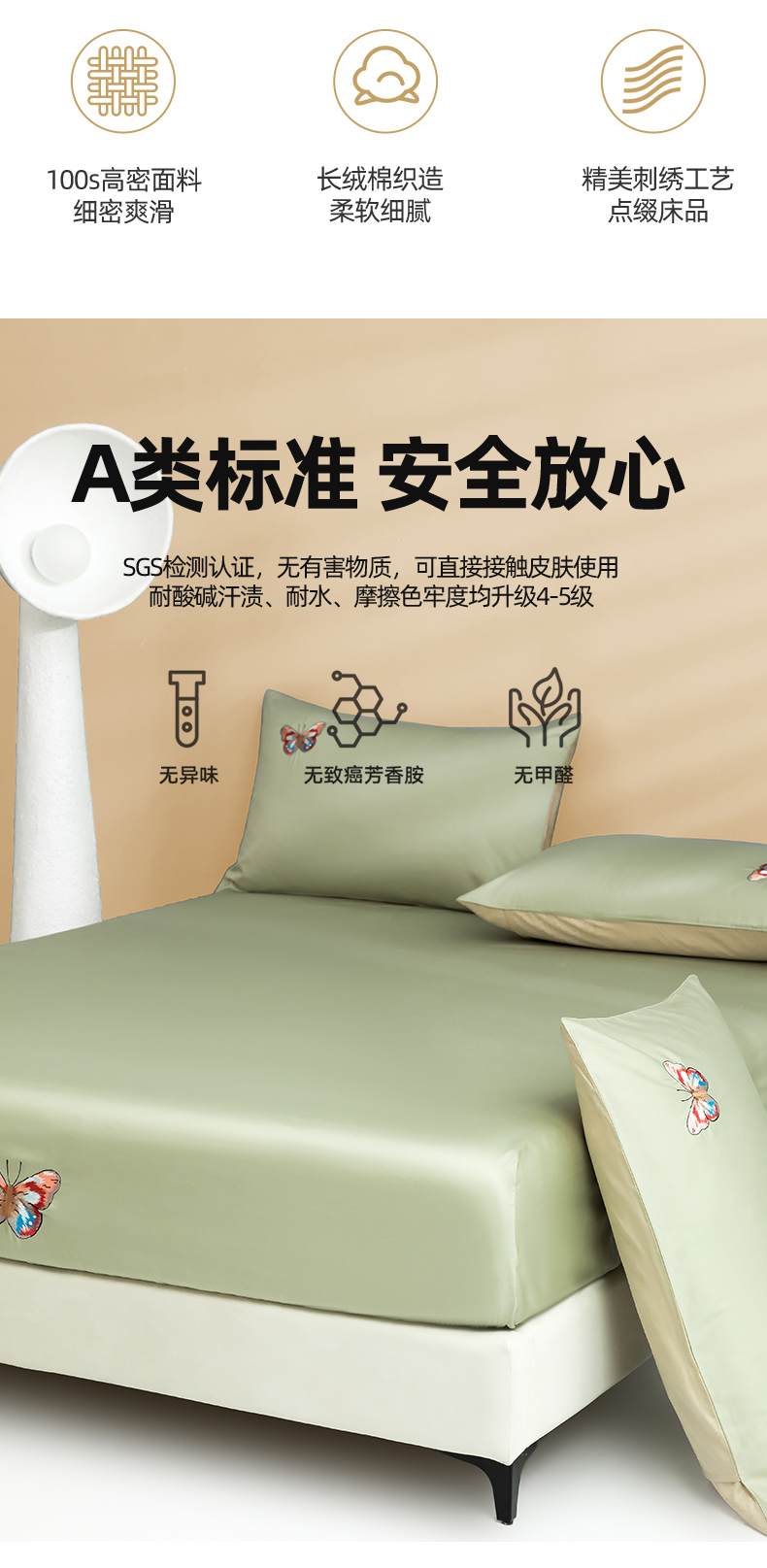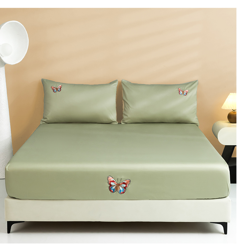 • 91家纺网 家纺一手货源 找家纺 蓝米卡夫 2024新款A类100支全棉刺绣蝶恋系列单床笠三件套 蝶恋100支-莺茶绿