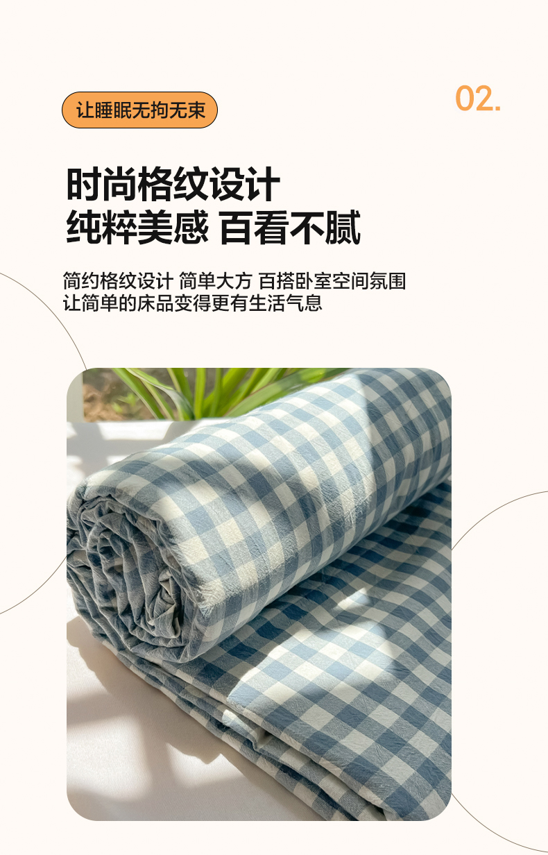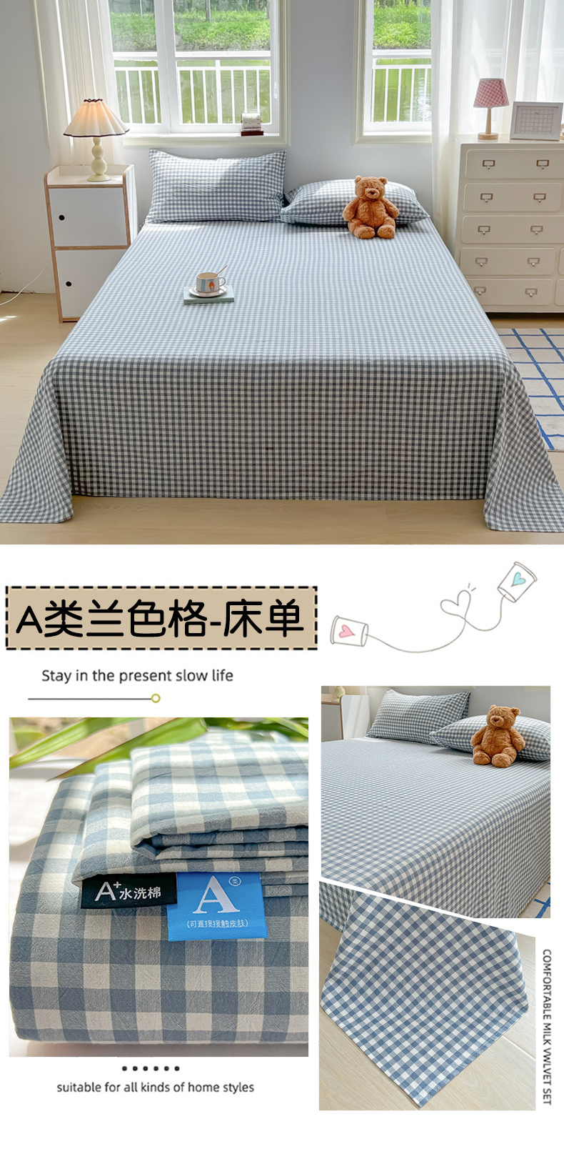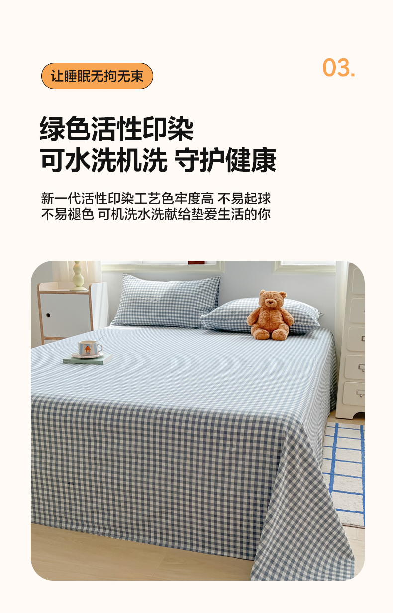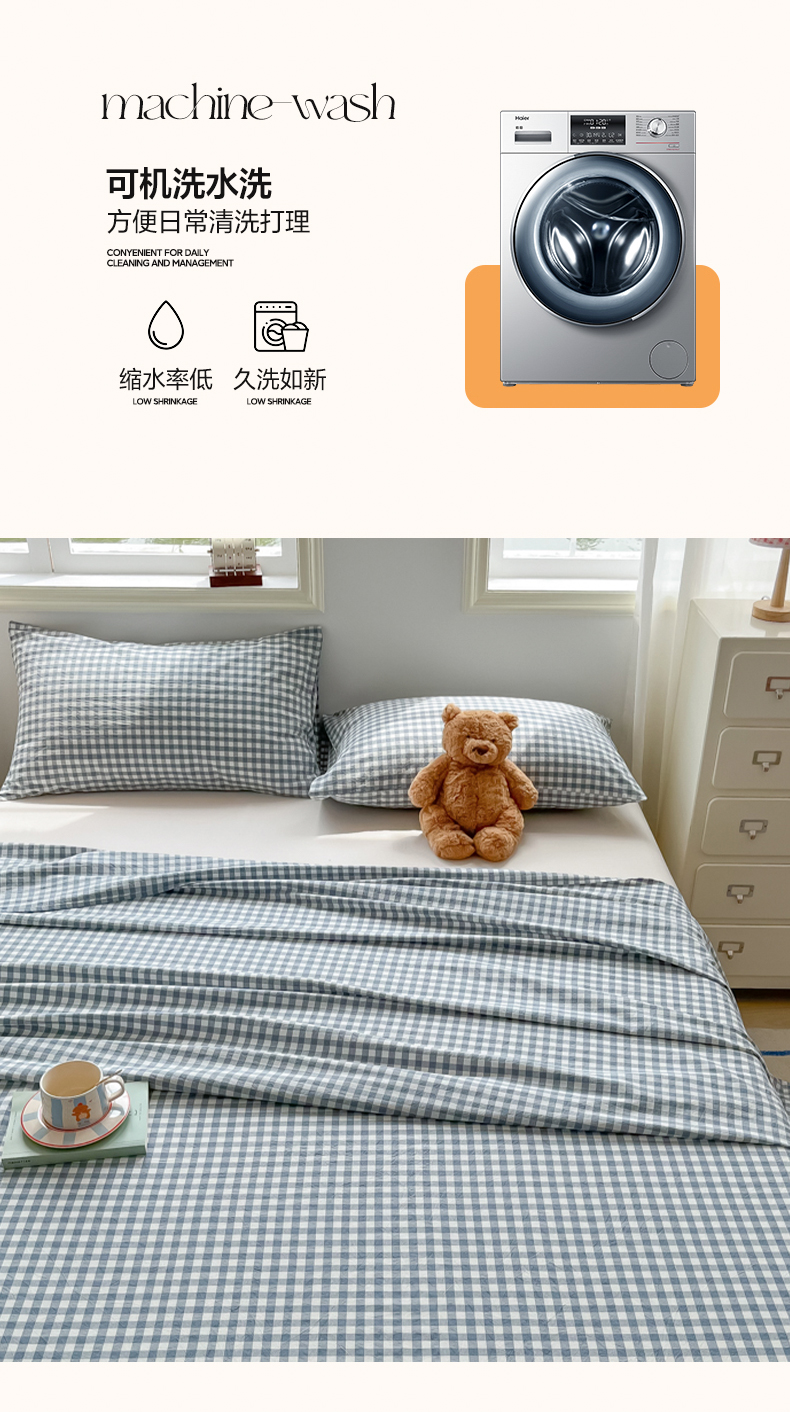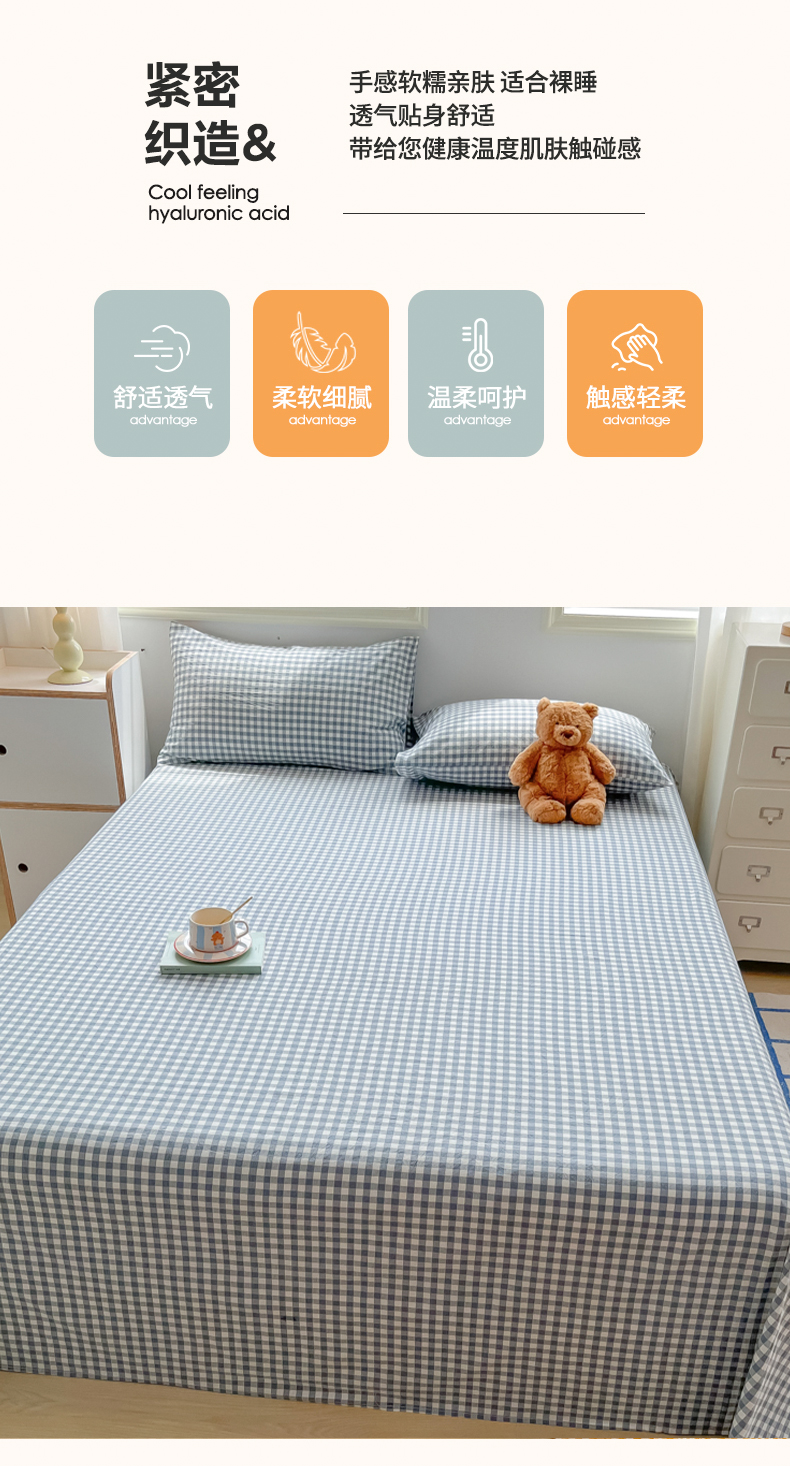 韩巢家纺 2024新款简约格子纯色A类水洗棉床单枕套三件套 A类兰色格-床单