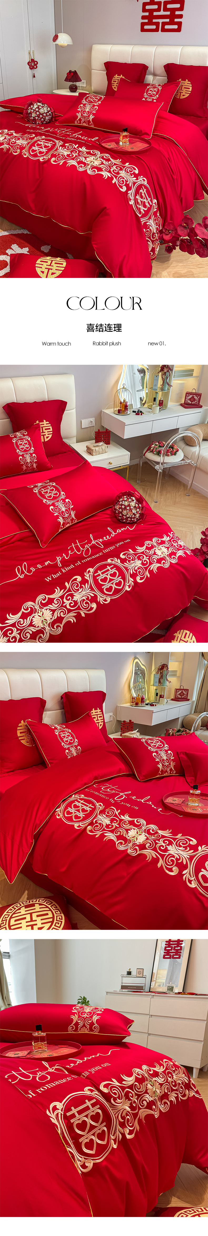 (总)欧乐蒂 2025新款婚庆款牛奶绒刺绣系列四件套-爱相随,爱相随-喜红,爱相随-金