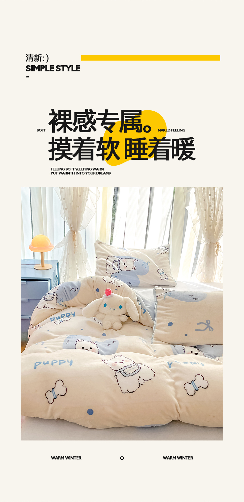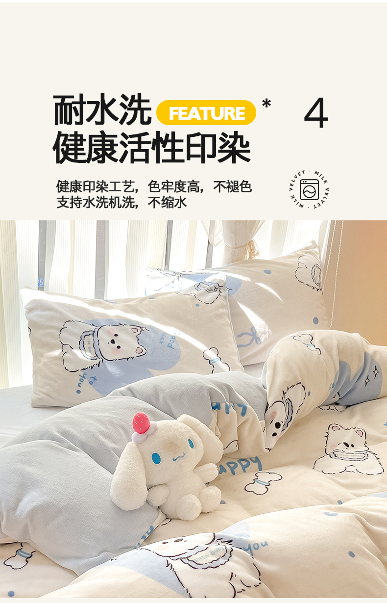 商品名称:桃子家居 2024新款ins小清新花卉少女卡通跑量牛奶绒系列四件套 绒-蓝甜小狗