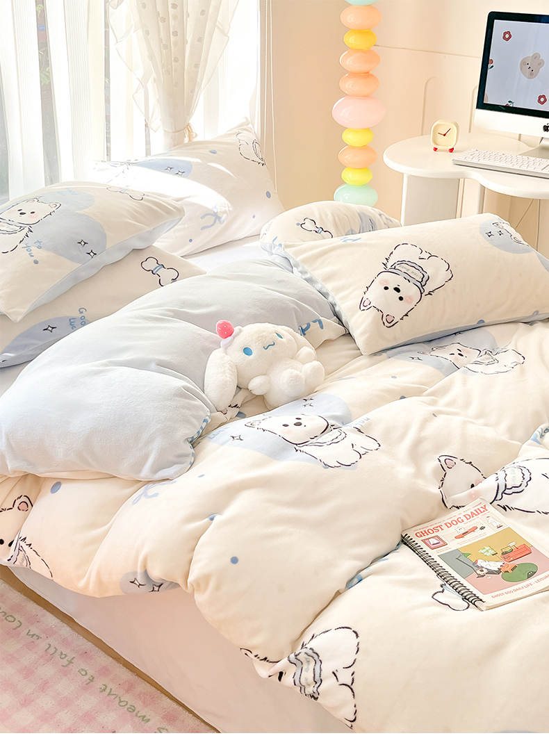 桃子家居 2024新款ins小清新花卉少女卡通跑量牛奶绒系列四件套 绒-蓝甜小狗