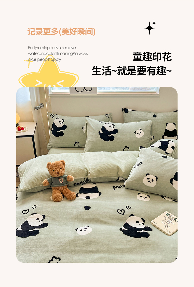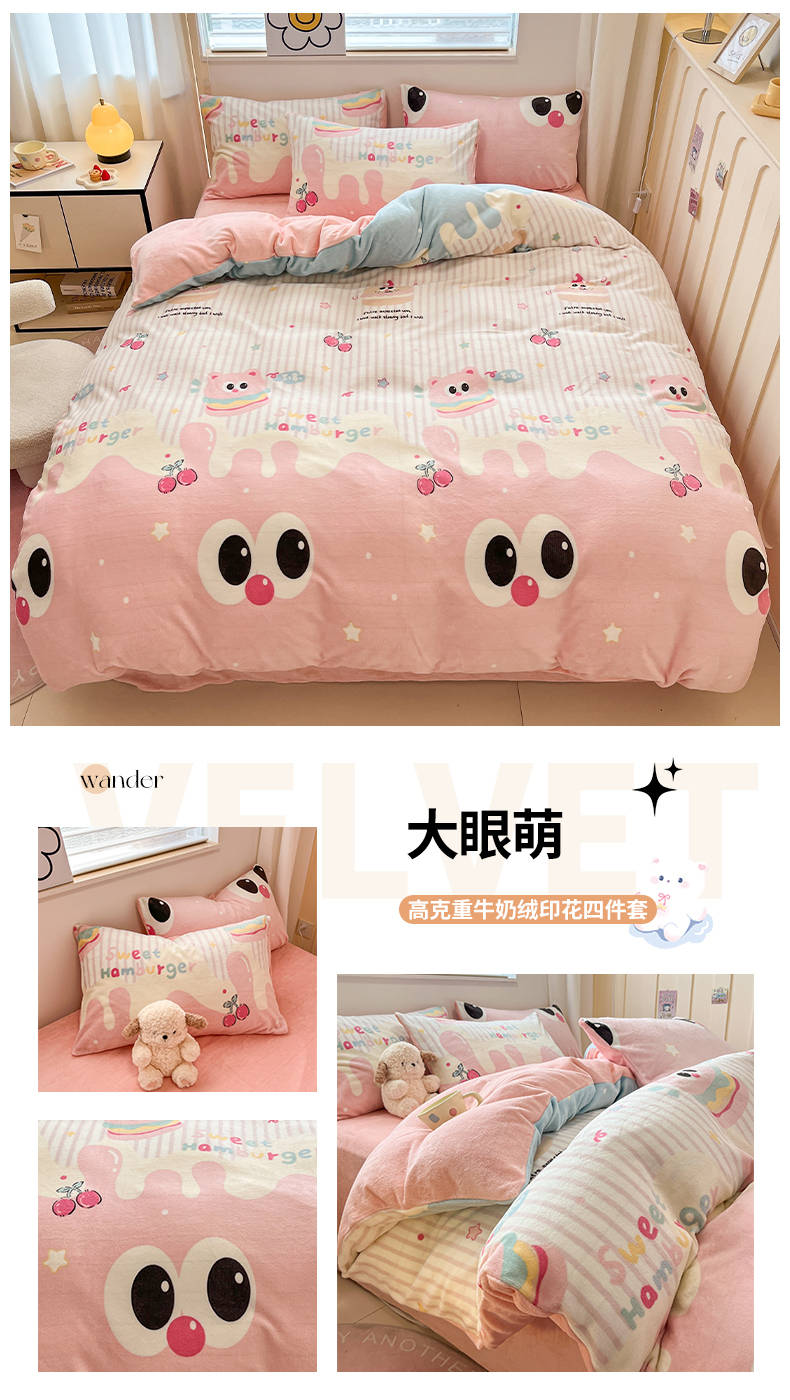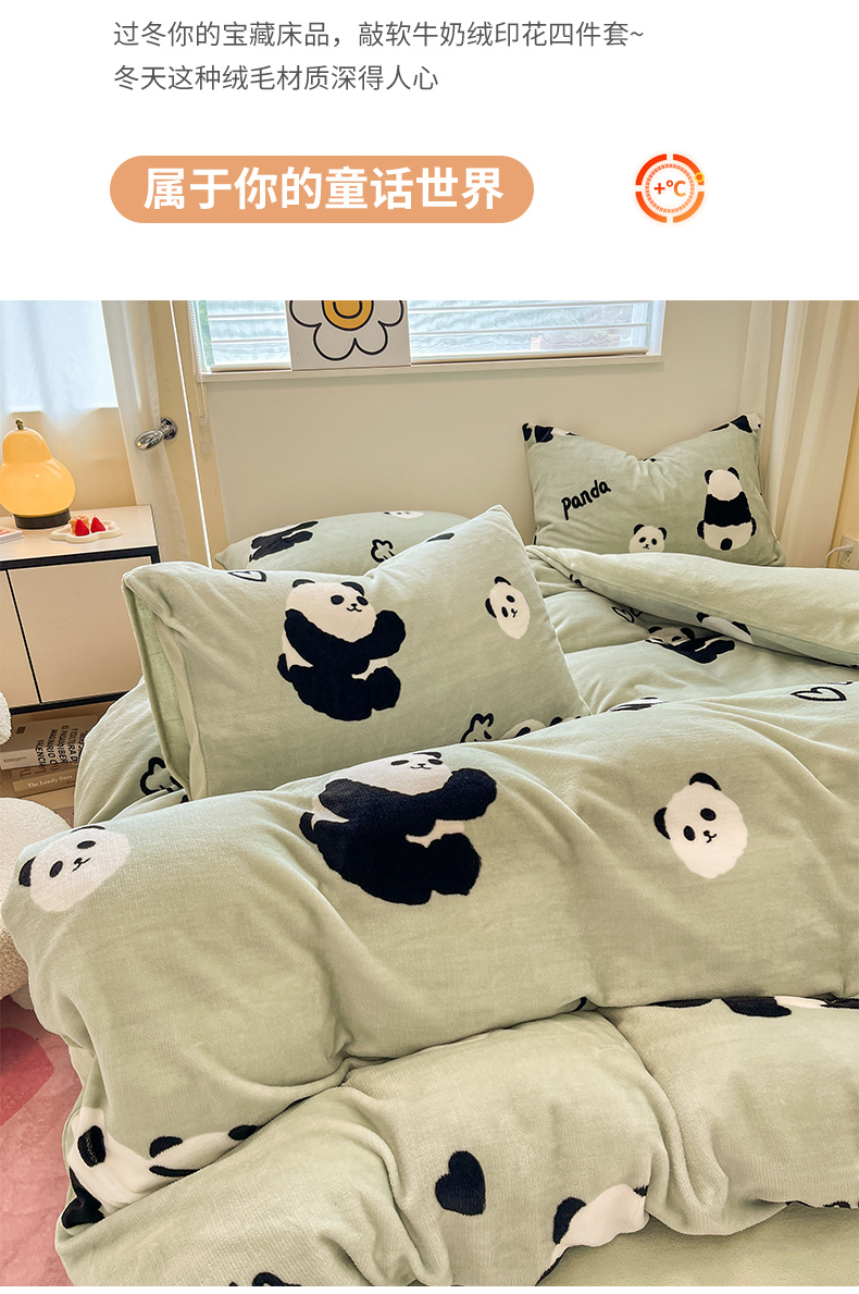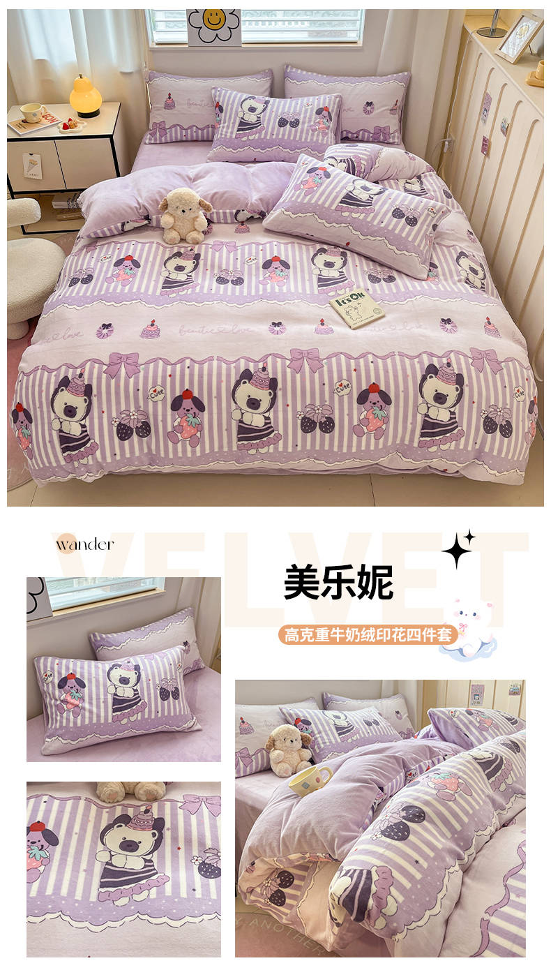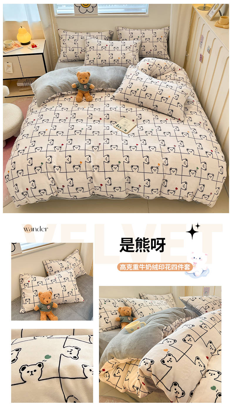 商品名称:捌月 2024新款童话镇系列高克重印花牛奶绒四件套卡通小清新加厚保暖绒套件 熊敦敦