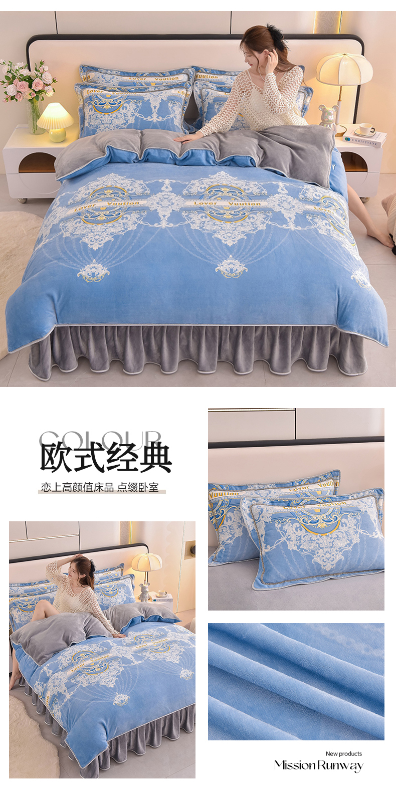 富之航 2024新款8-9斤高克重印花牛奶绒四件套保暖绒套件直播爆款欧式经典